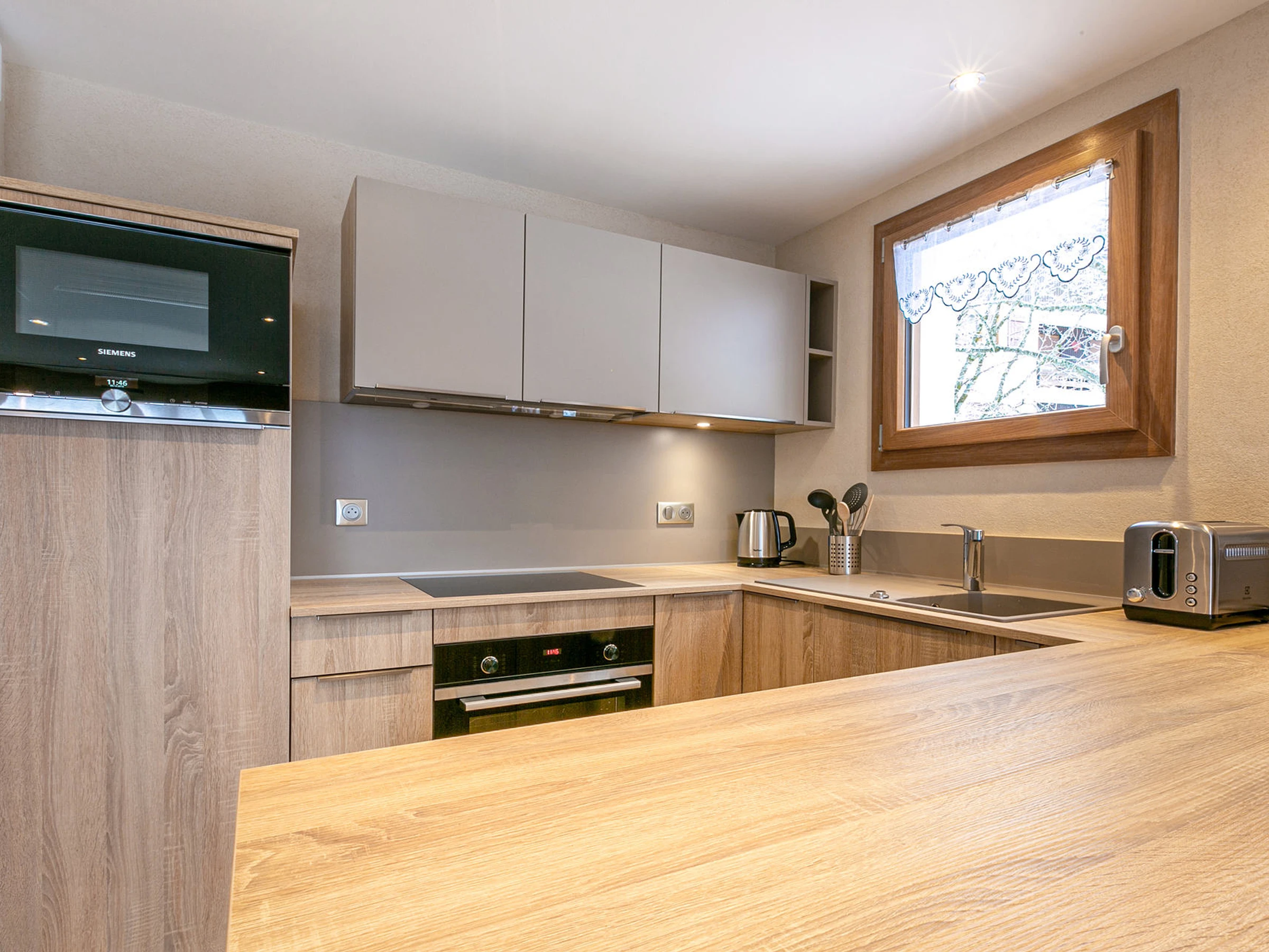 - KÜCHE mit offenem Zugang zum Wohnzimmer: Kühl-/Gefrierkombination (210 l), Induktionsherd, Backofen, Mikrowelle, Geschirrspüler, Fenster nach Süden, Blick ins Grüne / Nachbarwohnungen / Bergblick