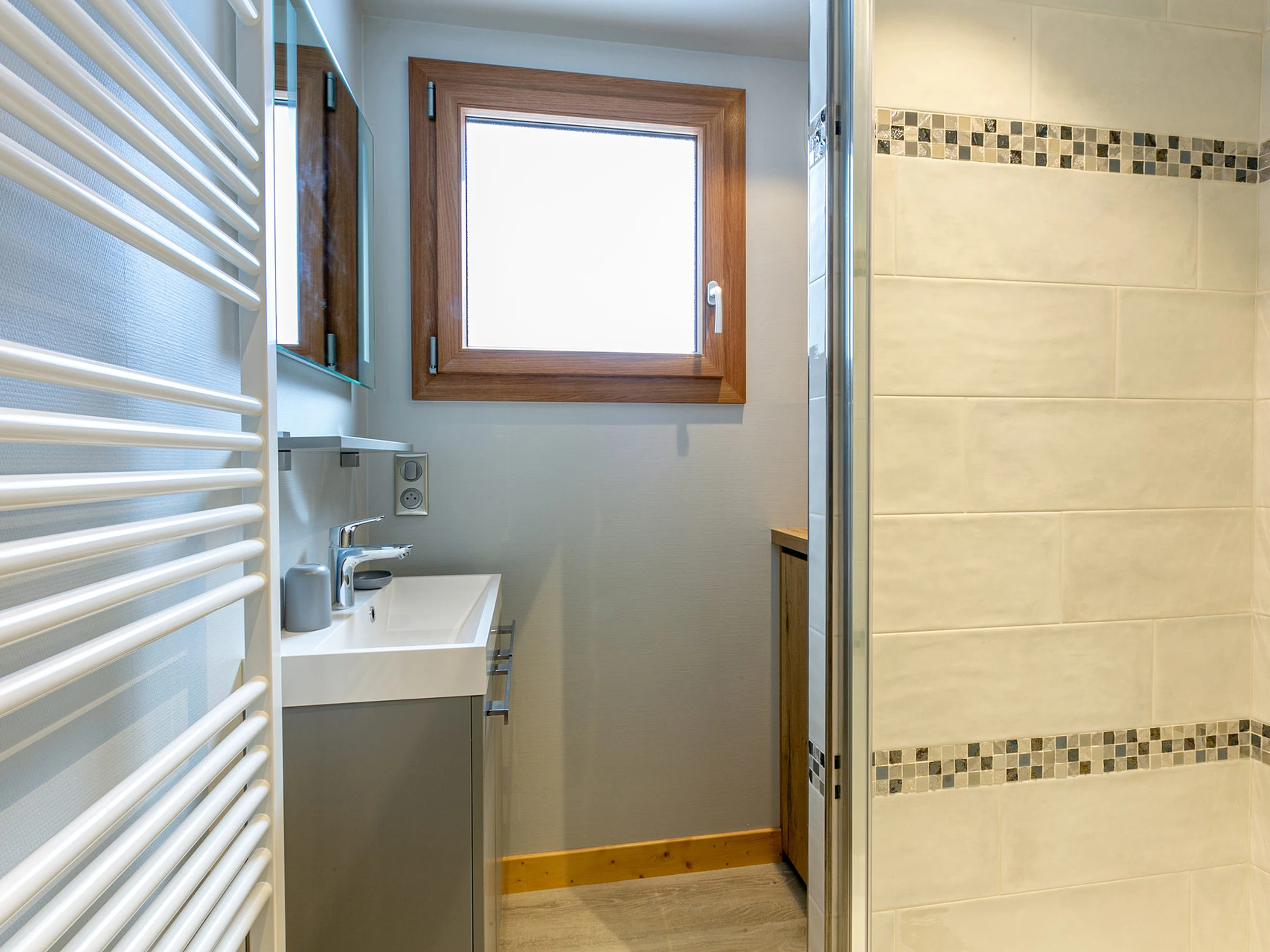 - Duschbad (2,45 m²): Waschbecken, Dusche, Handtuchtrockner, Heizkörper, Waschtrockner, Südfenster, Blick ins Grüne / Nachbarhäuser / Bergblick