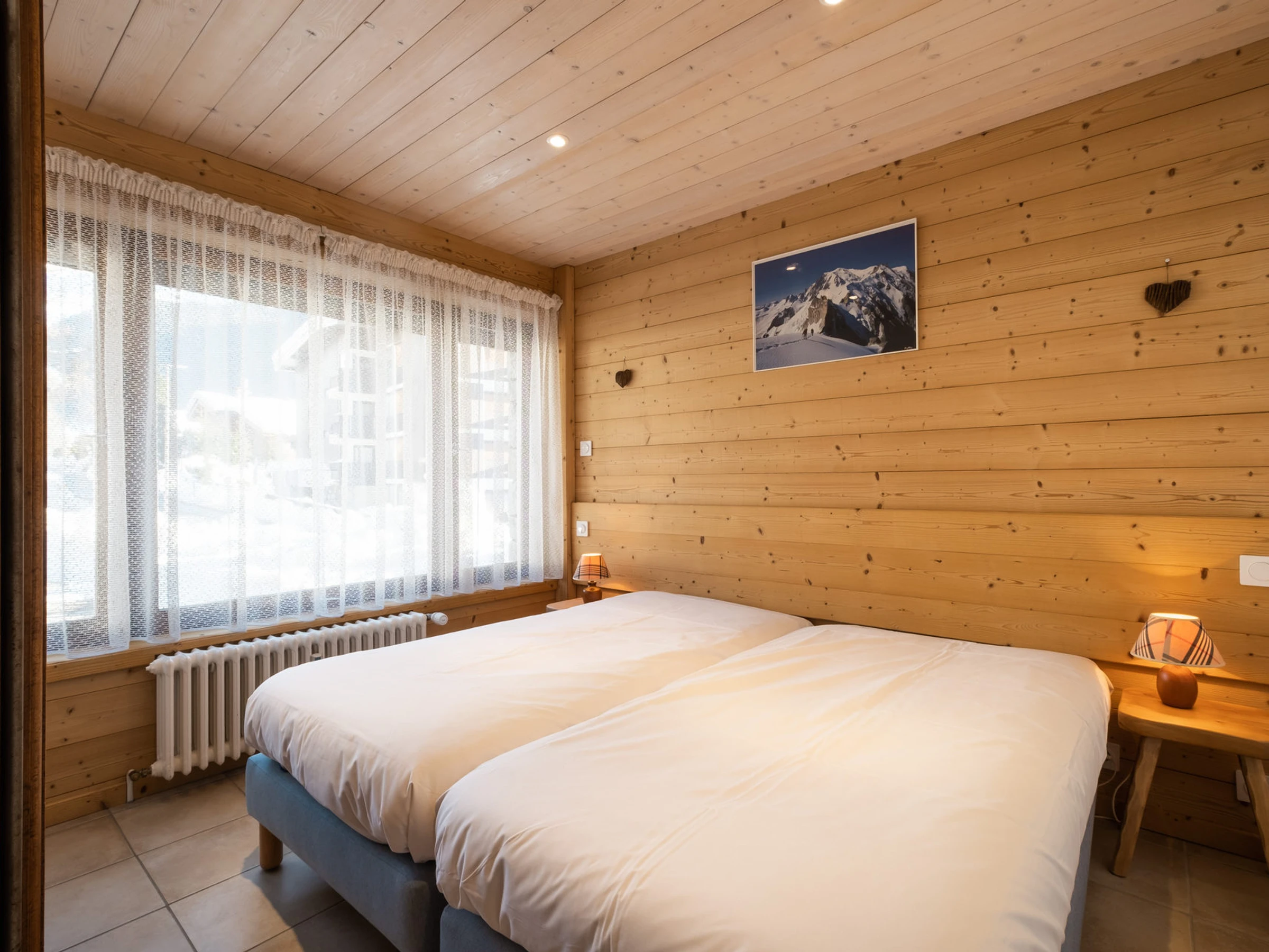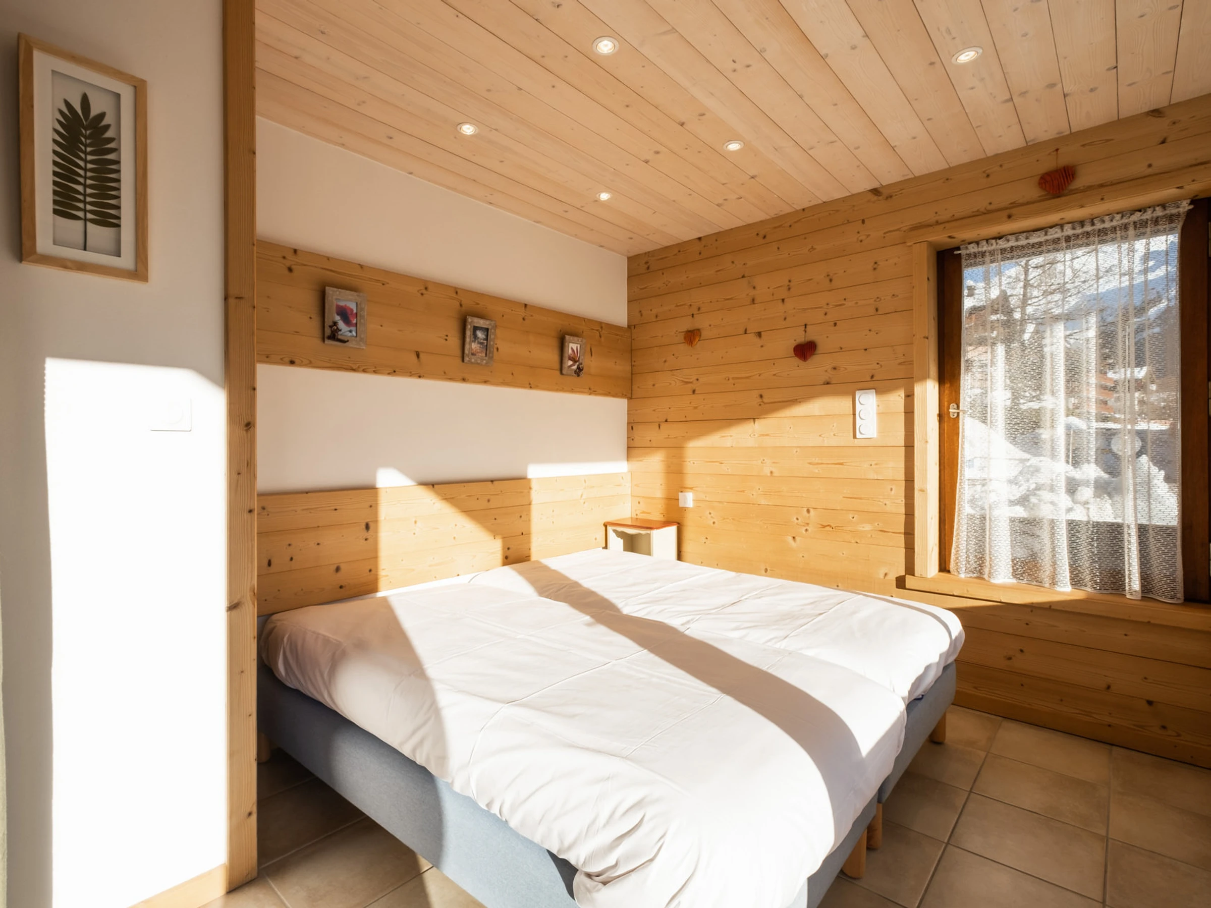 - SCHLAFNISCHE, durch Vorhänge vom Wohnzimmer abgetrennt (8,81 m²): 2 Einzelbetten (90 cm), Fenster nach Osten / Blick auf den Parkplatz, Erkerfenster nach Süden + Fenstertür zur Südostterrasse / Nachbarhaus / Schwimmbadweg / Bergblick