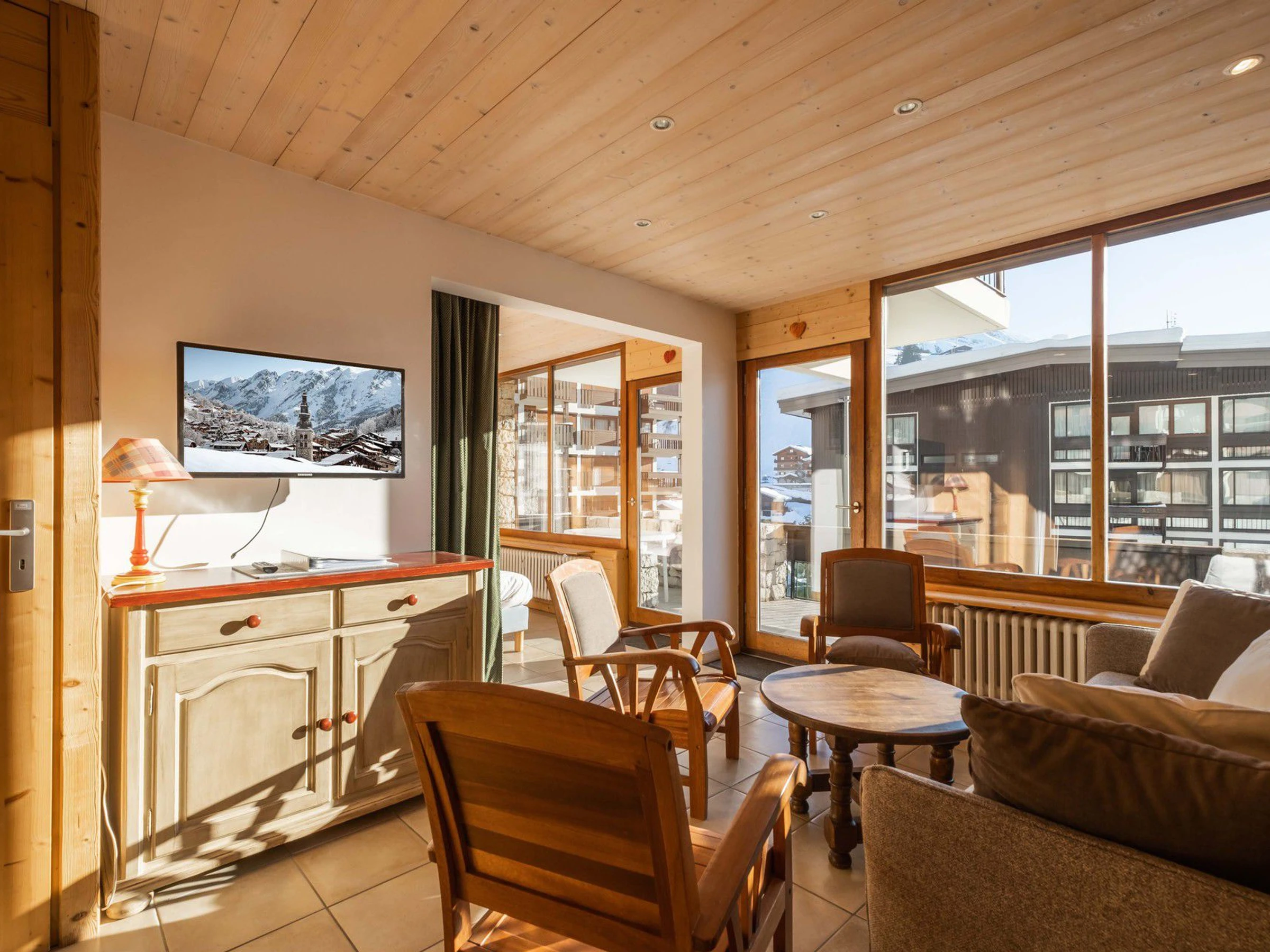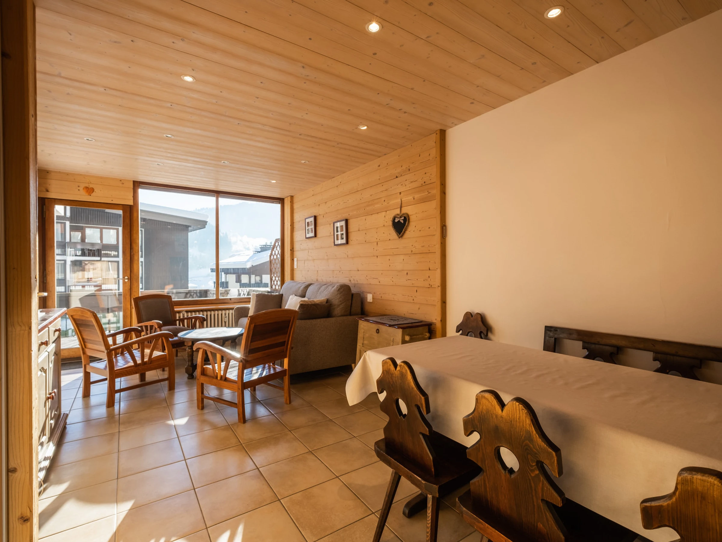 - WOHNZIMMER (18,77 m²): Essbereich, 1 Doppelbett Schlafsofa (140 cm), Flachbildfernseher, Südfenster mit Erker + Fenstertür + Terrasse, Blick auf die Nachbarwohnung/den Pool/Bergblick