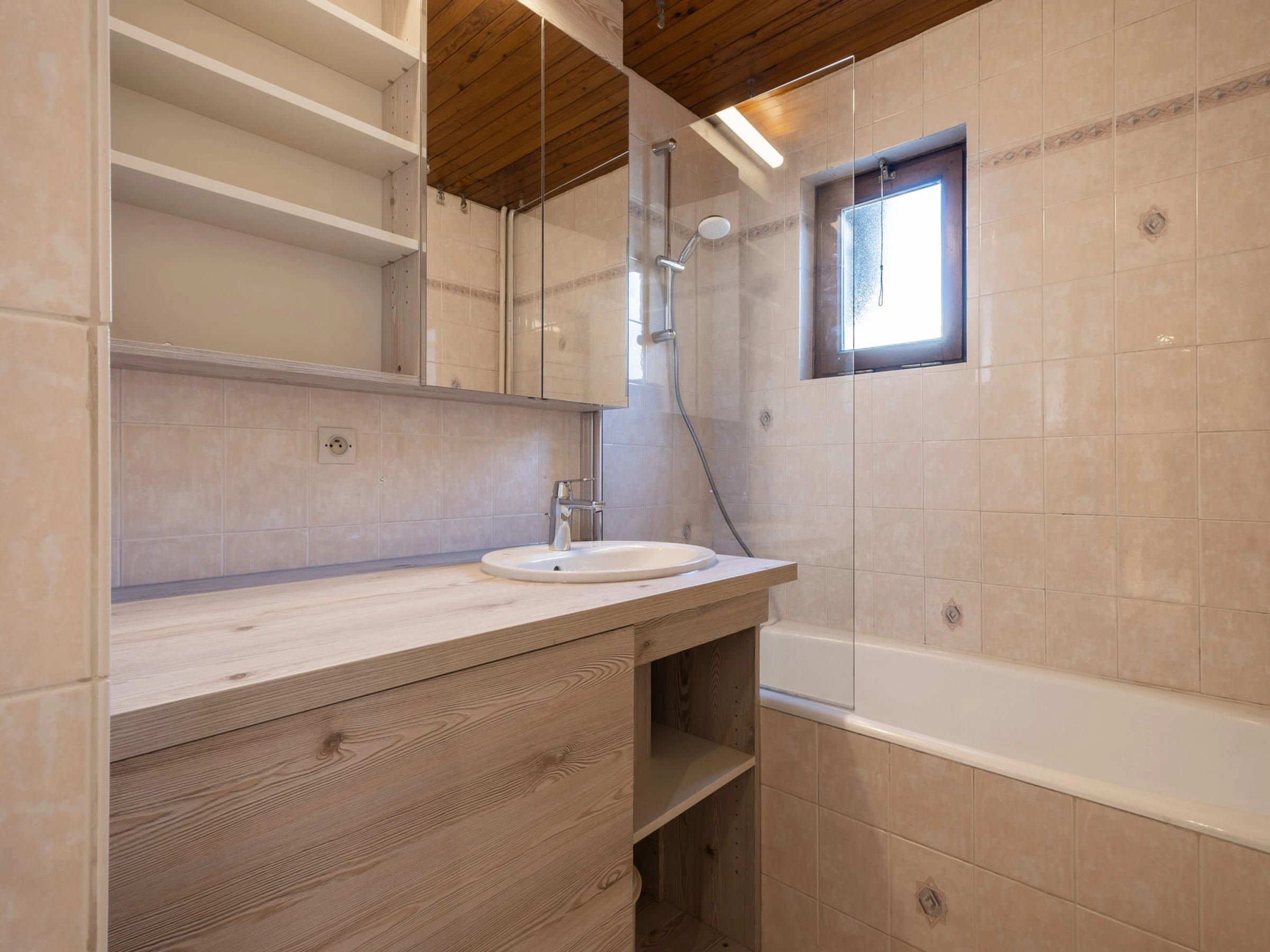 - BADEZIMMER (3,35 m²): Waschbecken, Badewanne, Waschmaschine, Wäschetrockner, Heizkörper, kleines hohes Fenster