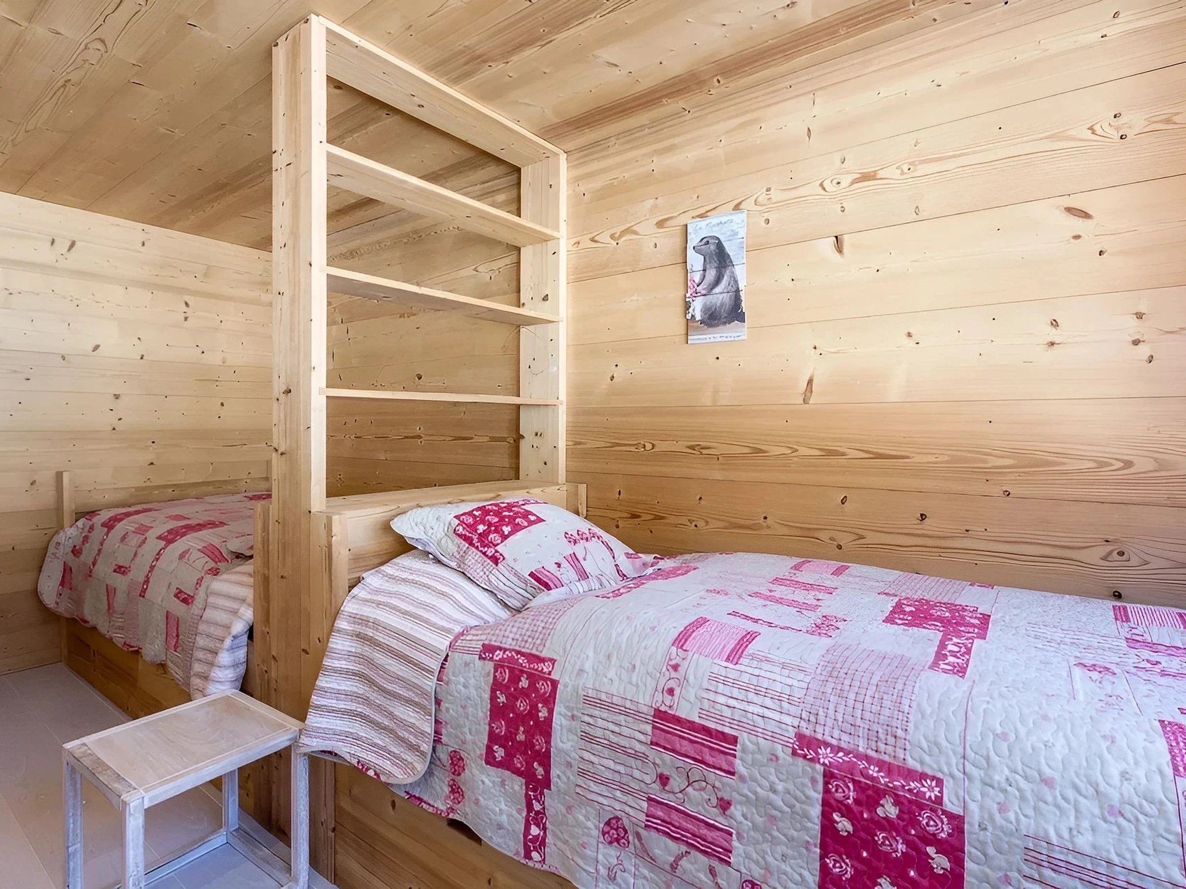Im Obergeschoss befinden sich drei Schlafzimmer. Zwei davon verfügen jeweils über zwei Einzelbetten (90 cm), während das dritte Schlafzimmer mit einem Doppelbett (140 cm) ausgestattet ist und direkten Zugang zum Balkon mit Bergblick bietet. Ein Badezimmer mit Dusche und WC rundet diese Etage ab.