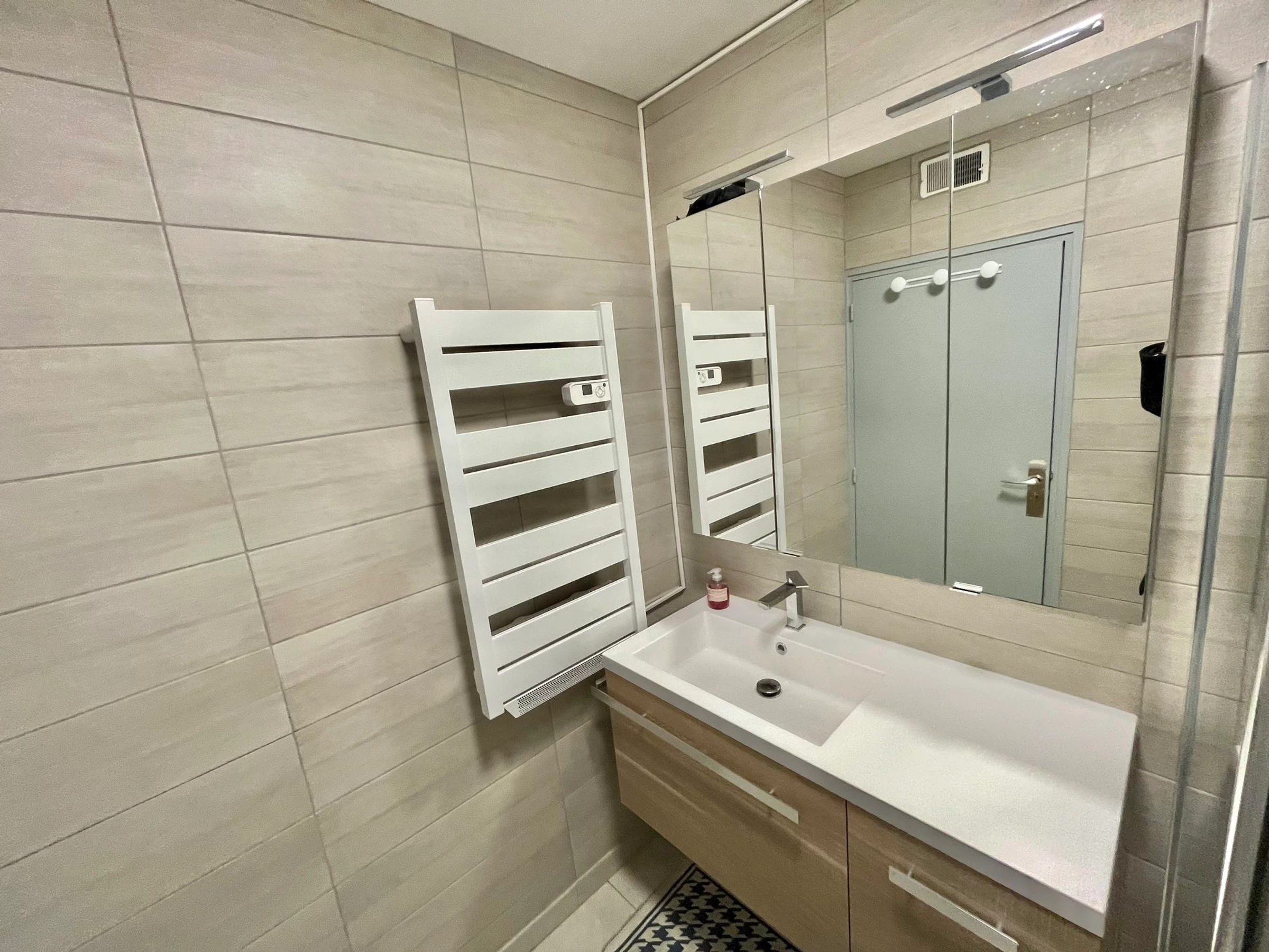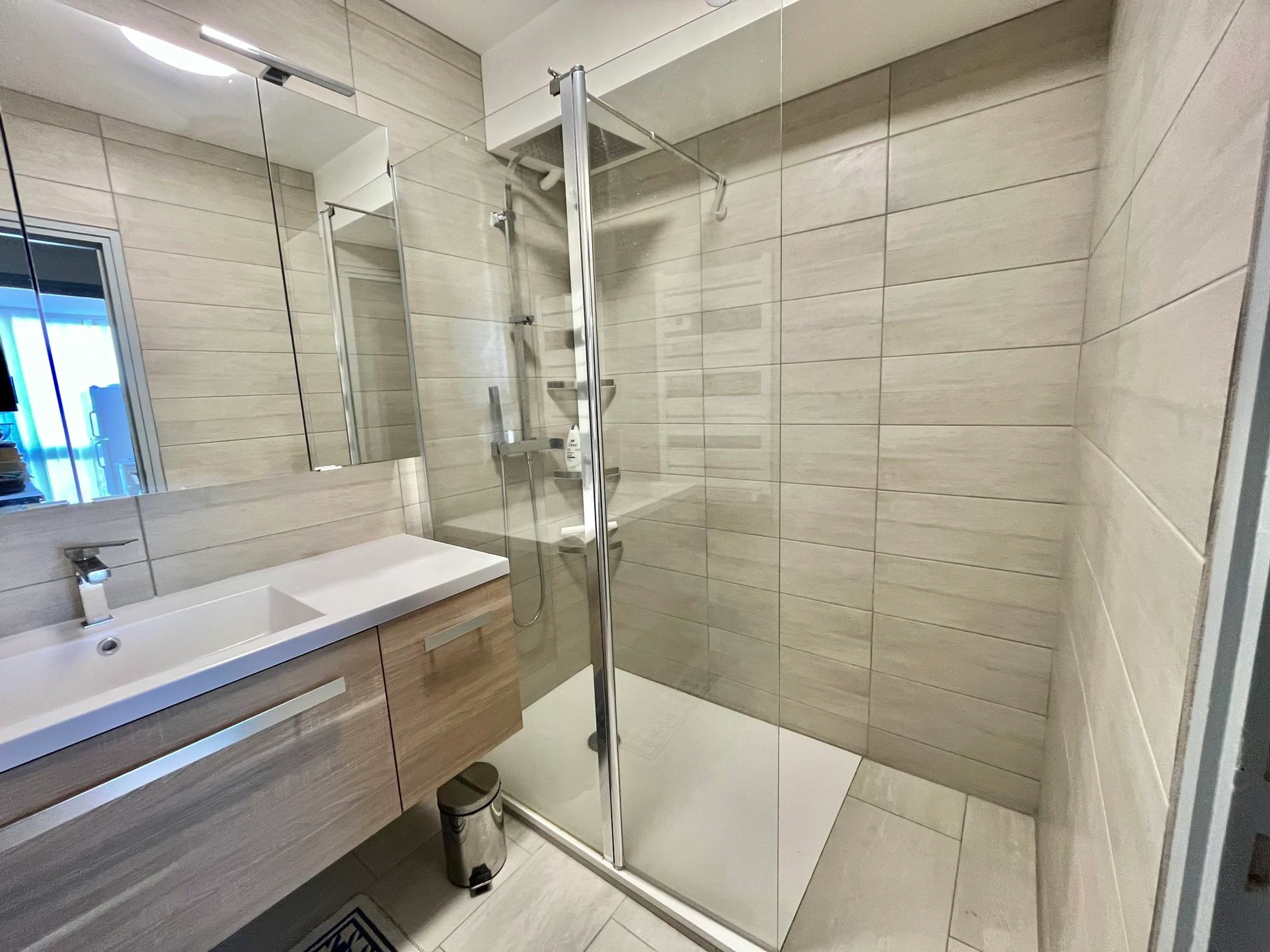 Badezimmer: Ein modernes Badezimmer mit Dusche und separatem WC.