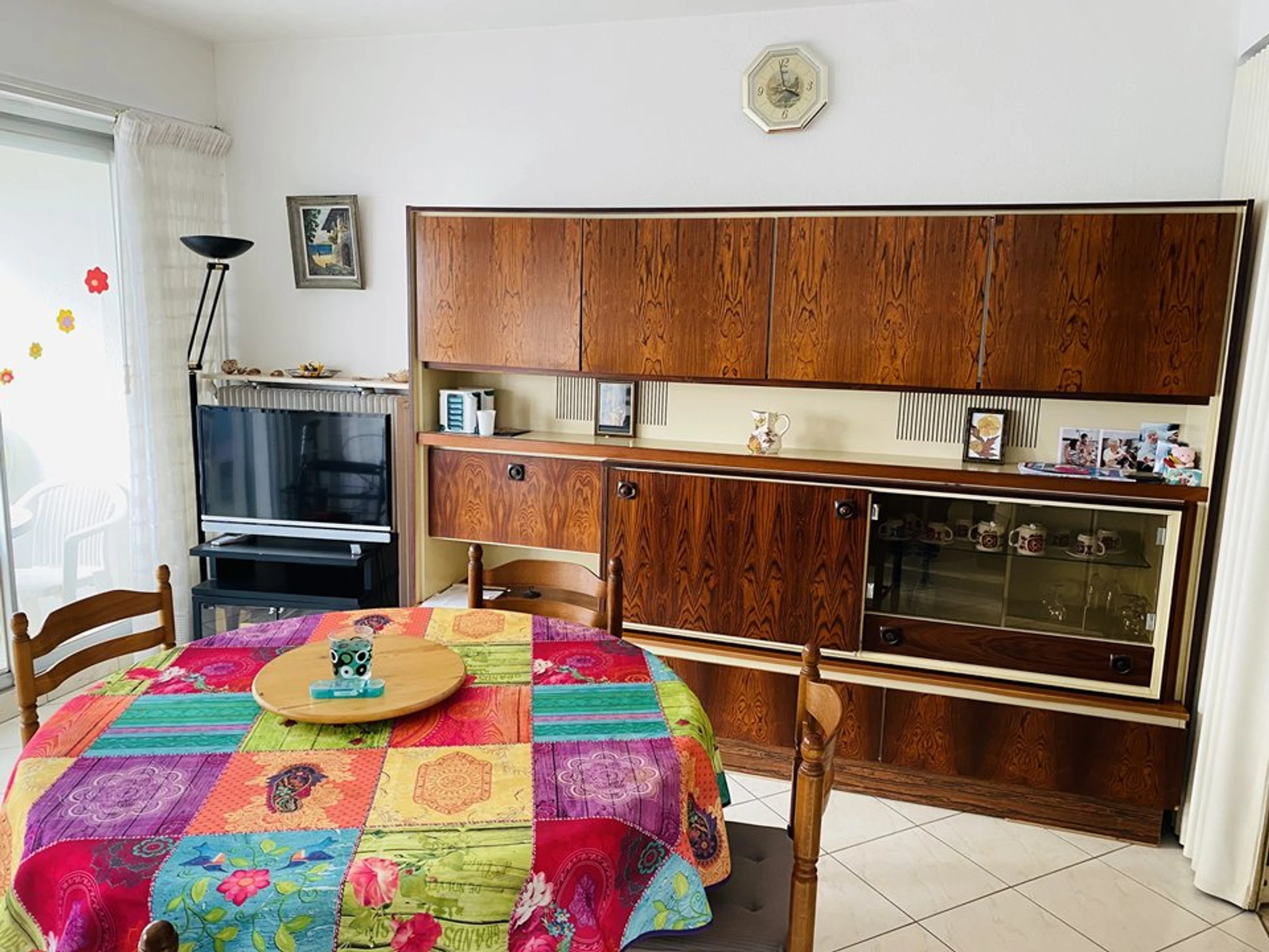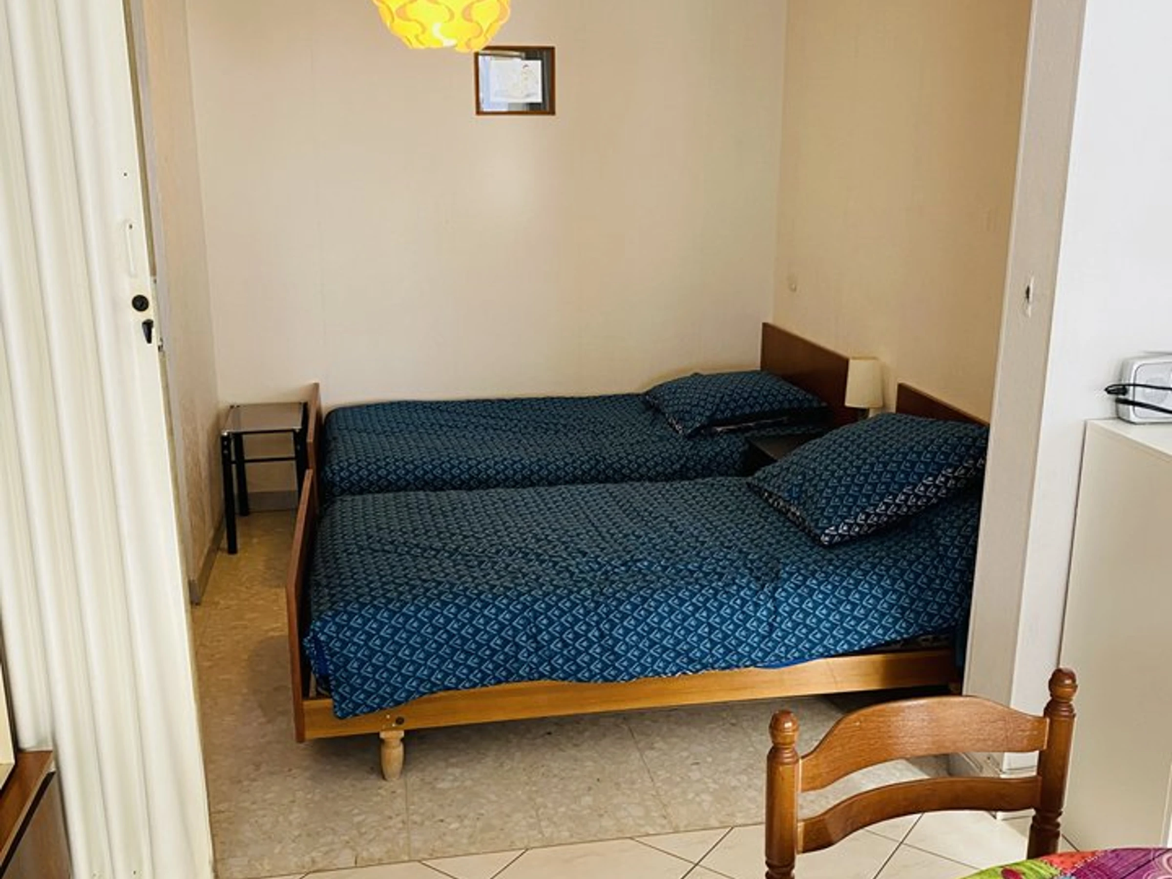 Das Schlafzimmer, abgetrennt durch einen Faltladen, ist mit zwei Einzelbetten (90 cm) und einem Kleiderschrank ausgestattet.