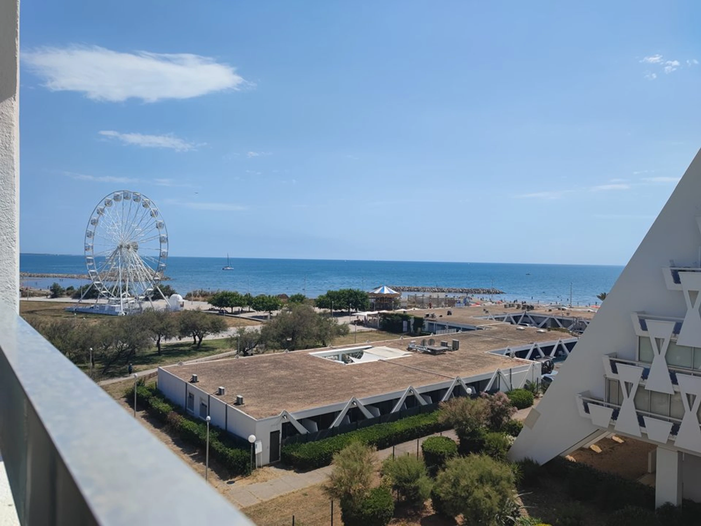 Von der langen Loggia aus genießen Sie den Blick auf das Meer und das Riesenrad La Grande Motte, während Sie essen oder auf den Liegestühlen bei einer Tasse Kaffee entspannen.