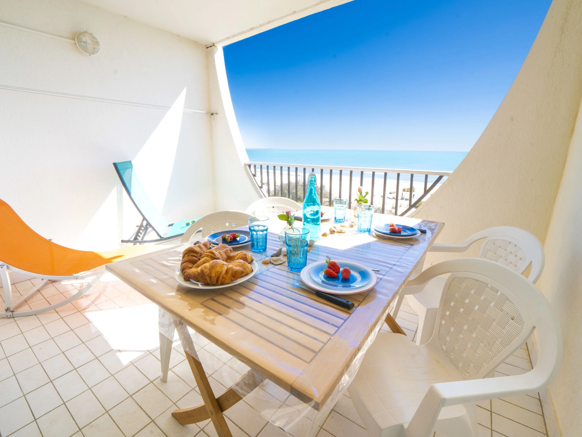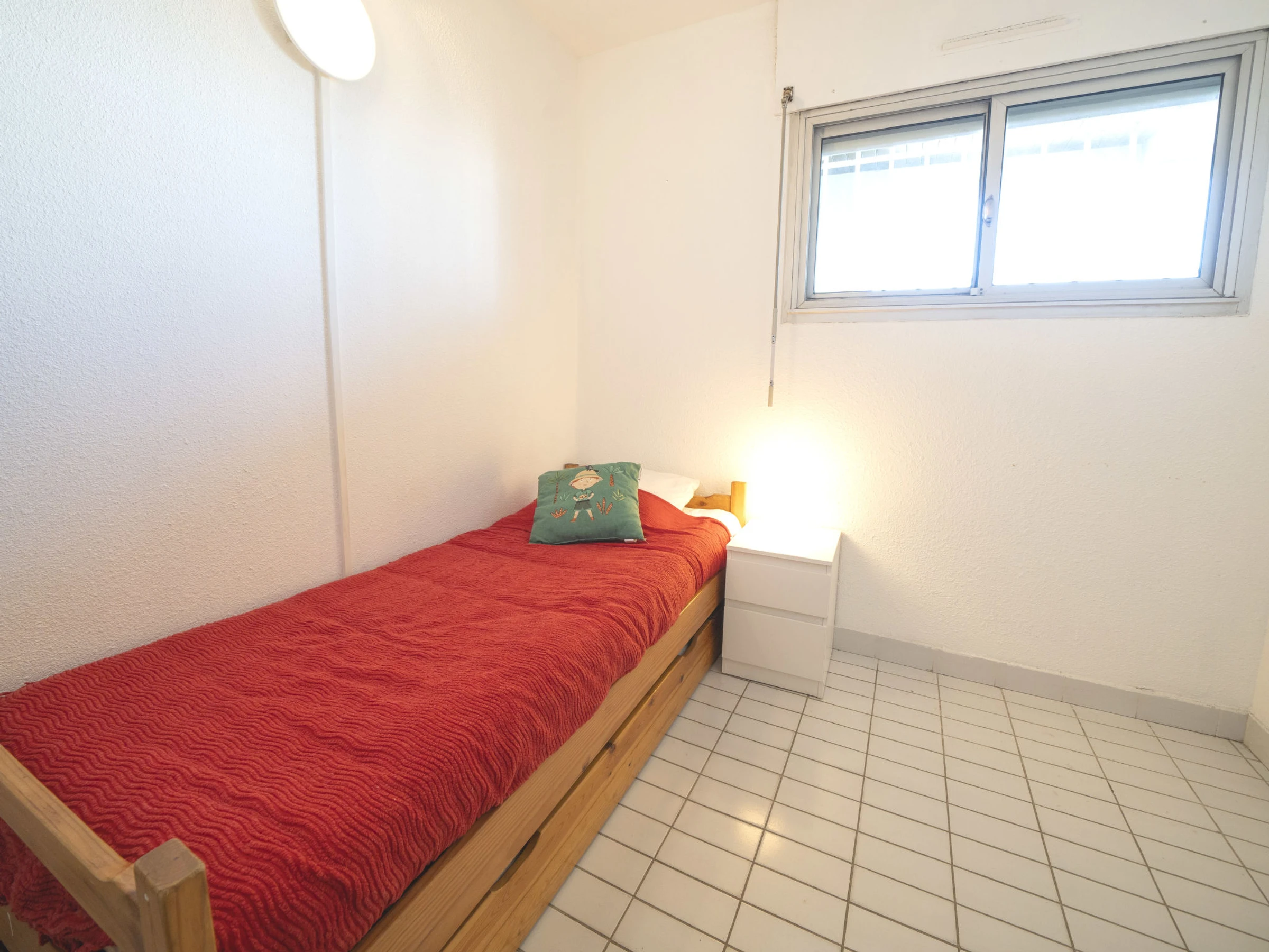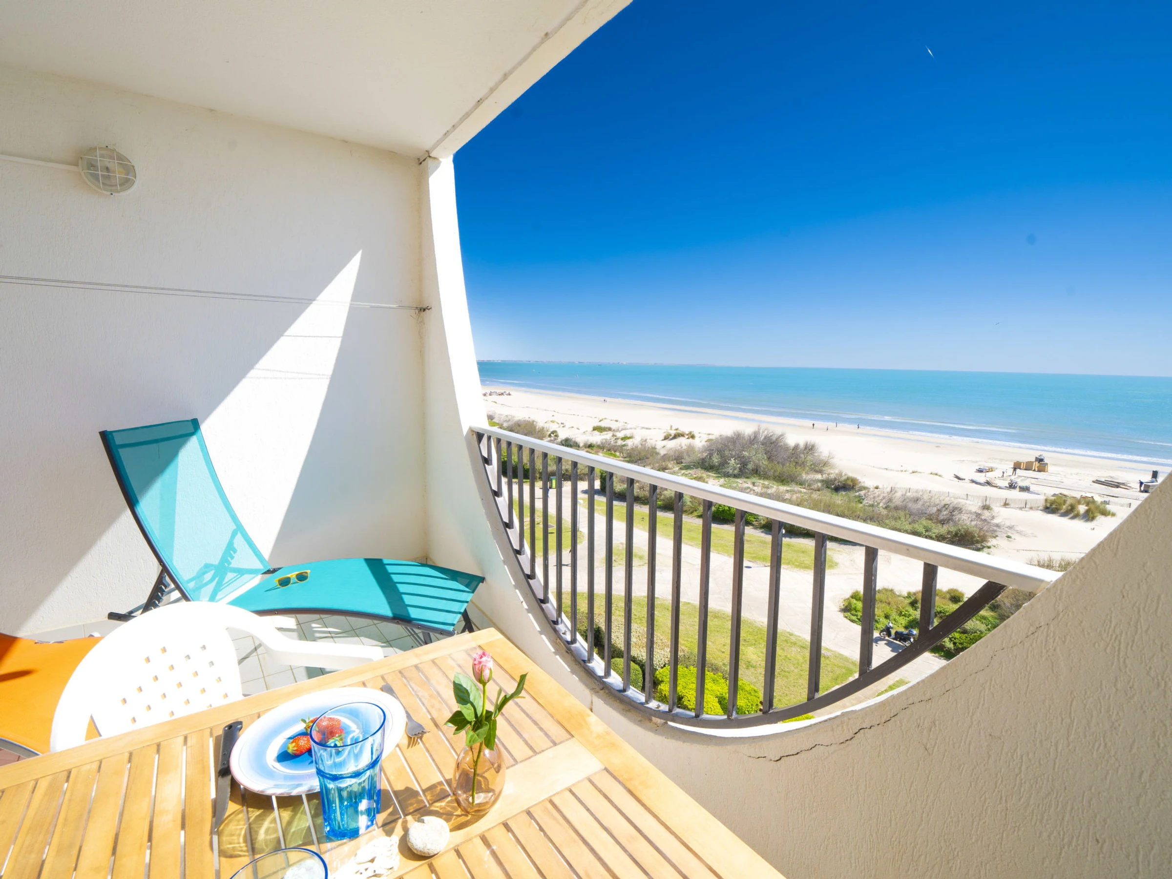 2-Zimmer-Wohnung 42 m2 im 5. Stock, Südlage. Wohn-/Esszimmer mit 1 Doppeldiwanbett (140 cm, Länge 190 cm), TV (Flachbildschirm). Ausgang zur Terrasse. 1 Zimmer mit 1 Bett (80 cm, Länge 190 cm), 1 x 2 Etagenbetten (80 cm, Länge 190 cm). Offene Küche (Backofen, 3 Glaskeramikplatten, Toaster, Wasserkocher, Mikrowelle, Tiefkühler, elektrische Kaffeemaschine). Bad, sep. WC. Terrasse 9 m2 teilweise überdacht, Südlage. Terrassenmöbel. Sehr schöne Sicht auf das Meer. Zur Verfügung: Waschmaschine. Internet (Wireless LAN, extra). Parkplatz. Bitte beachten: Rauchmelder.