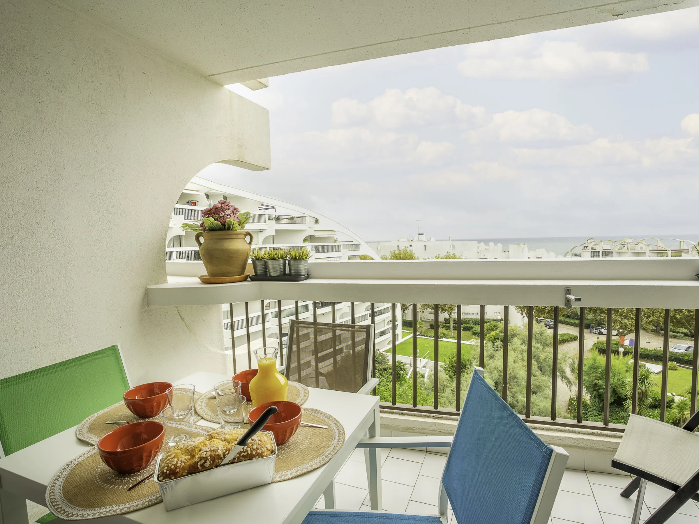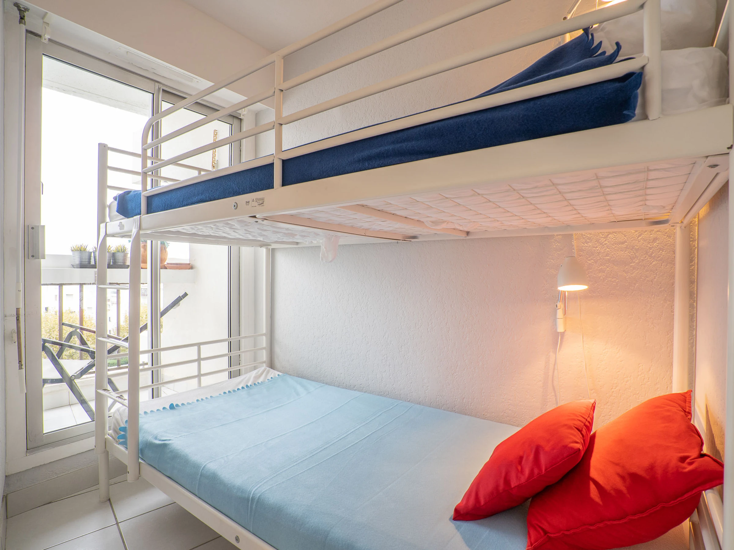1-Zimmer-Studio 27 m2 im 5. Stock. Vollständig renoviert im Jahre 2016, komfortabel und schön eingerichtet: Wohn-/Esszimmer mit 1 franz. Wandschrankbett (140 cm, Länge 190 cm), TV (Flachbildschirm). Kabine mit 1 x 2 Etagenbetten (90 cm, Länge 190 cm). Kochnische (2 Glaskeramikplatten, Toaster, Wasserkocher, Tiefkühler, elektrische Kaffeemaschine, Kombinationsmikrowelle). Dusche, sep. WC. Heizung. Terrasse 10 m2, Südlage. Terrassenmöbel. Fernsicht auf das Meer. Zur Verfügung: Waschmaschine. Internet (Wireless LAN, extra). Parkplatz. Bitte beachten: Rauchmelder. Anstelle eines abgeschlossenen Schlafzimmers befinden sich manche Schlafplätze in einem offenen Bereich (Galerie, Nische etc.).