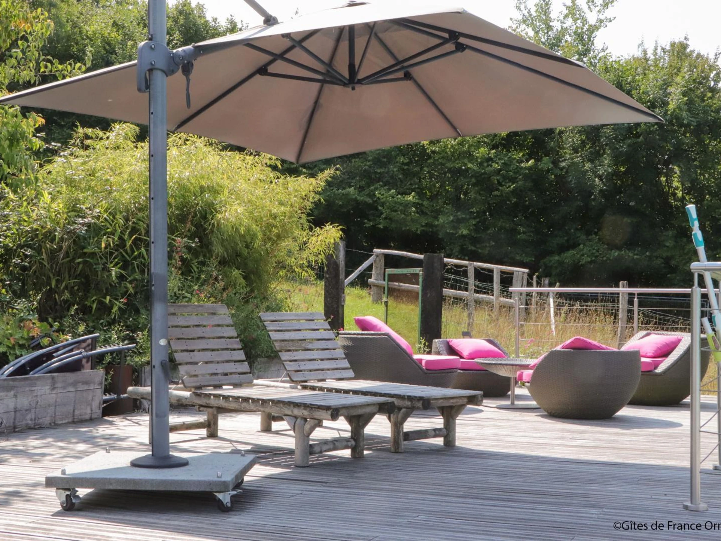 Privater Swimmingpool (9,3 x 3,5 m, 1,20 m tief) von 9 bis 18 Uhr (außerhalb dieser Zeit gemeinsam mit dem Eigentümer) + 22 Uhr für 2 Nächte, bei Bedarf beheizt von Mai bis Mitte September. 100 m² große Terrasse.