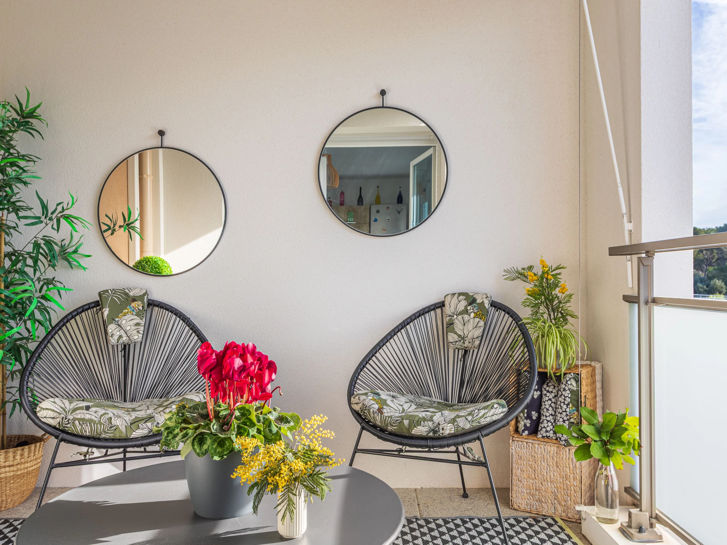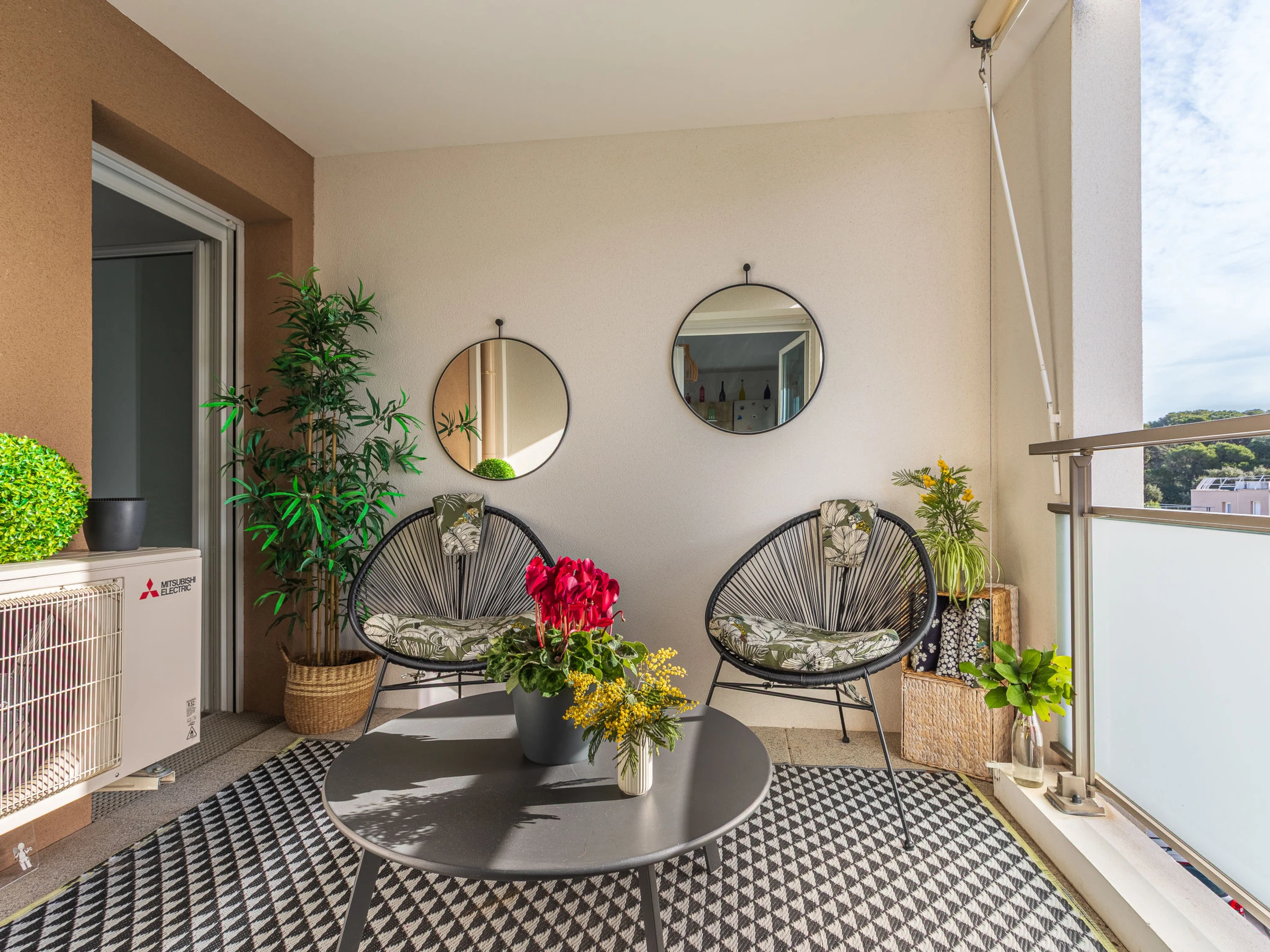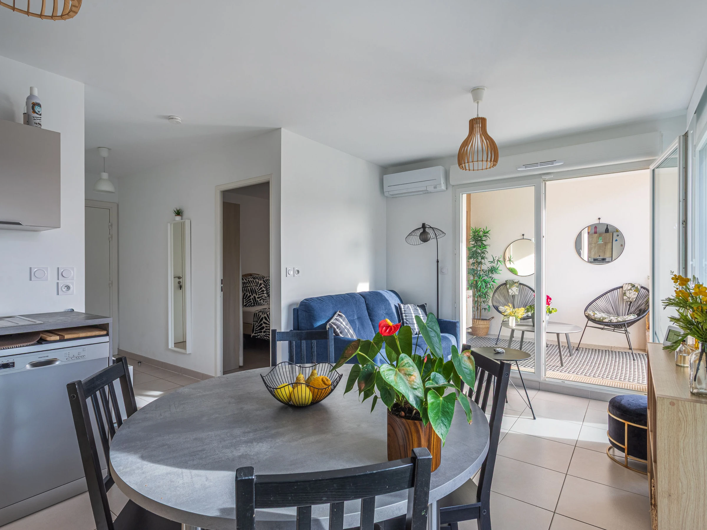 2-Zimmer-Wohnung 37 m2 im 2. Stock, Südostlage. Hell, schön und modern eingerichtet: Wohn-/Esszimmer mit Esstisch und TV (Flachbildschirm). Ausgang zur Loggia. 1 Zimmer mit 1 Doppelbett (2 x 80 cm, Länge 190 cm), TV (Flachbildschirm). Ausgang zur Loggia. Offene Küche (Geschirrspüler, 4 Induktionskochplatten, Toaster, Wasserkocher, Tiefkühler, elektrische Kaffeemaschine, Kombinationsmikrowelle). Dusche/WC. Klimaanlage. Loggia. Sicht auf die Landschaft. Zur Verfügung: Waschmaschine. Internet (WLAN, extra). Parkplatz Nr. 326 (überdacht, 1 Auto). Bitte beachten: TV nur FR. Rauchmelder. 6m2 Loggia mit zwei Sesseln und Couchtisch.