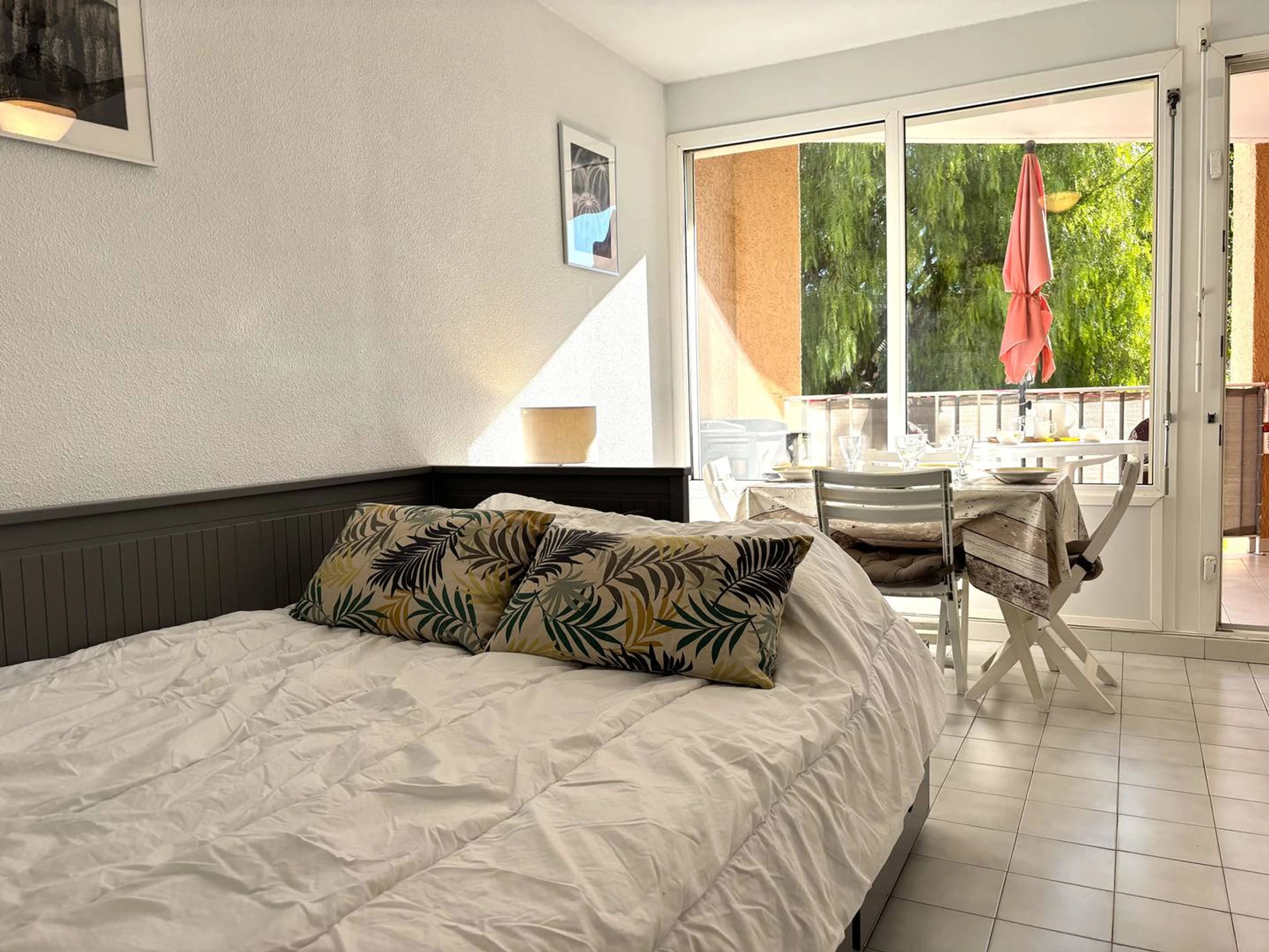 Diese Ferienwohnung im ersten Stock verfügt über ein Studio-Apartment mit Ostbalkon und Blick auf die grüne Umgebung der Residenz.
