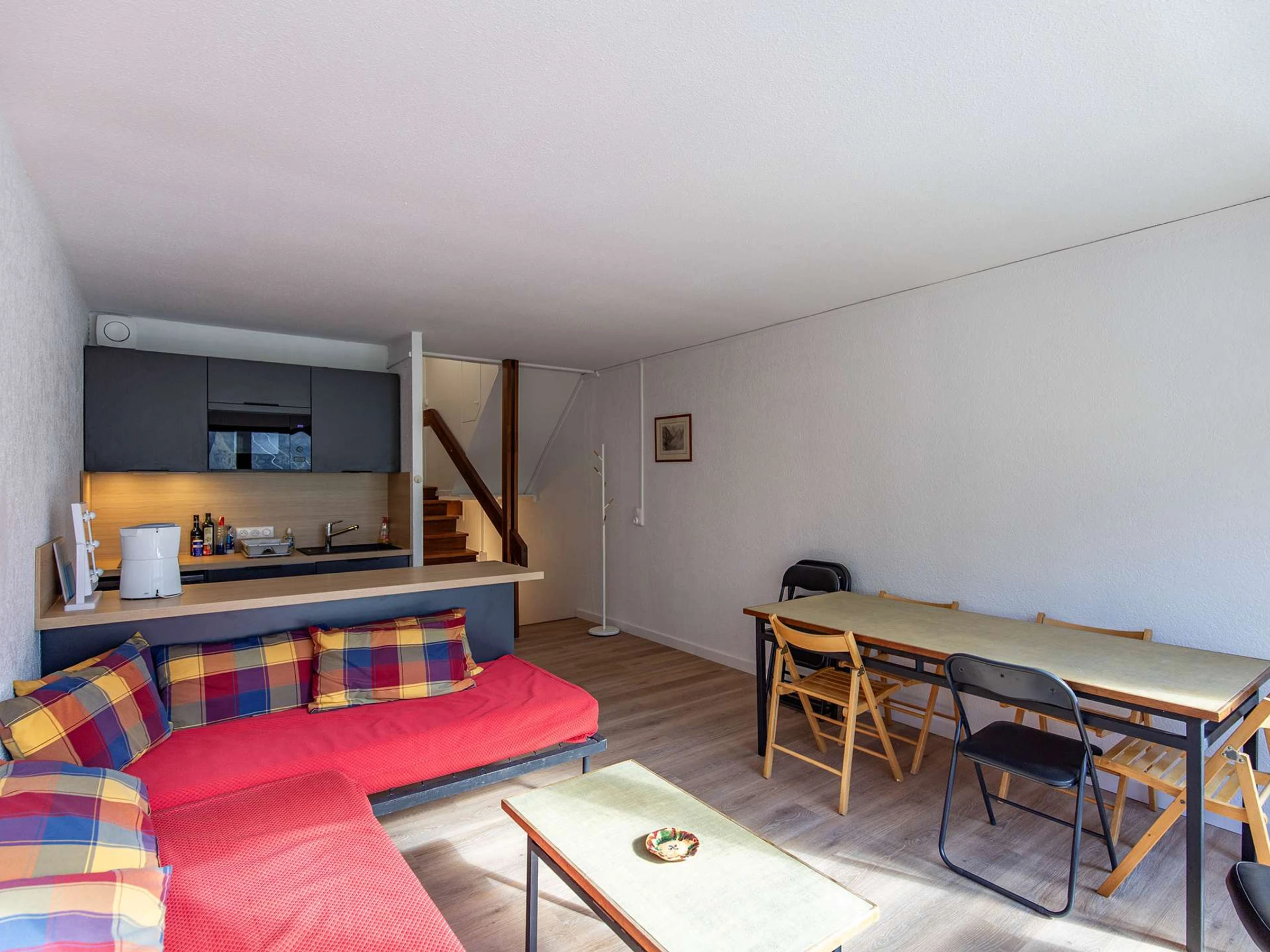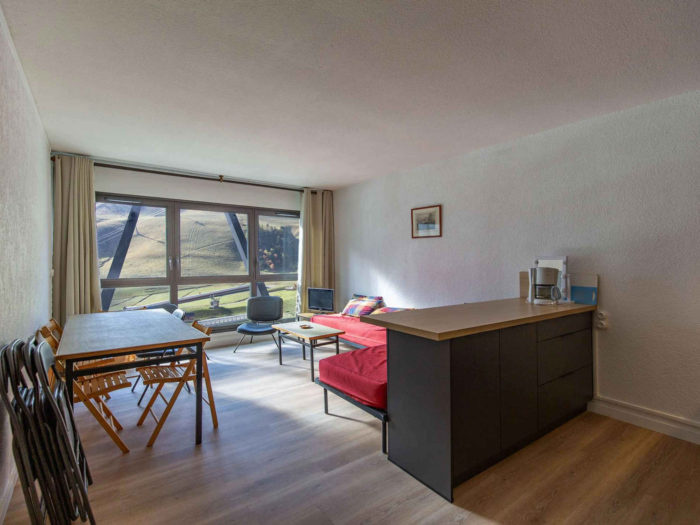 Apartment für 6 Personen im 1. Stock mit Aufzug, 42 m² (42 sq ft) ohne Balkon, nach Süden ausgerichtet mit Blick auf die Pisten und das Resort. Es verfügt über ein helles Wohnzimmer mit zwei Einzelbetten (die zu einem 140 cm breiten Bett zusammengestellt werden können) und einer Sitzecke mit Fernseher. Offene Küchenzeile mit Induktionskochfeld, kleinem Kühlschrank, Filterkaffeemaschine, Wasserkocher, Toaster, Multifunktionsmikrowelle, Geschirrspüler und Raclette-Grill.