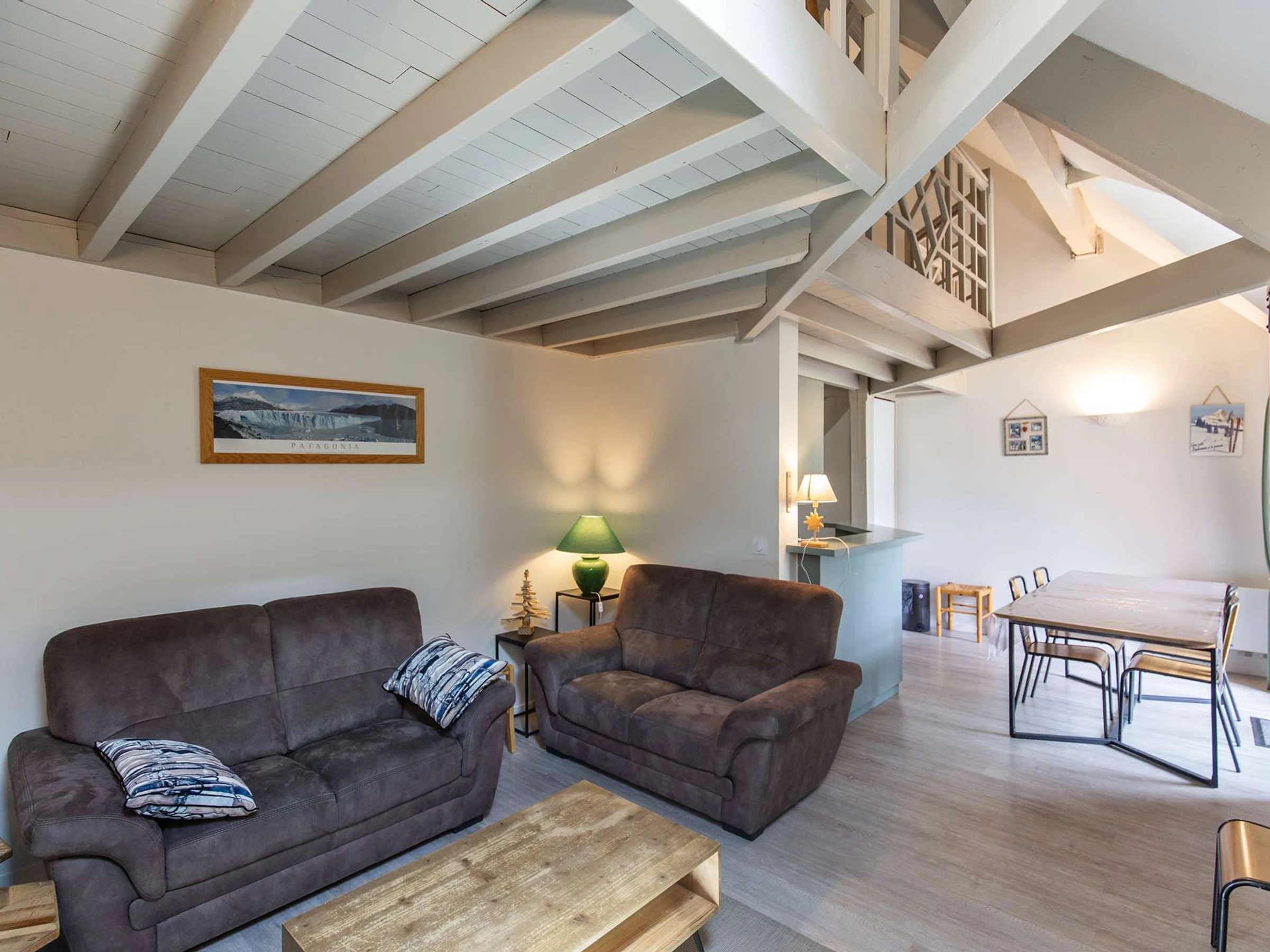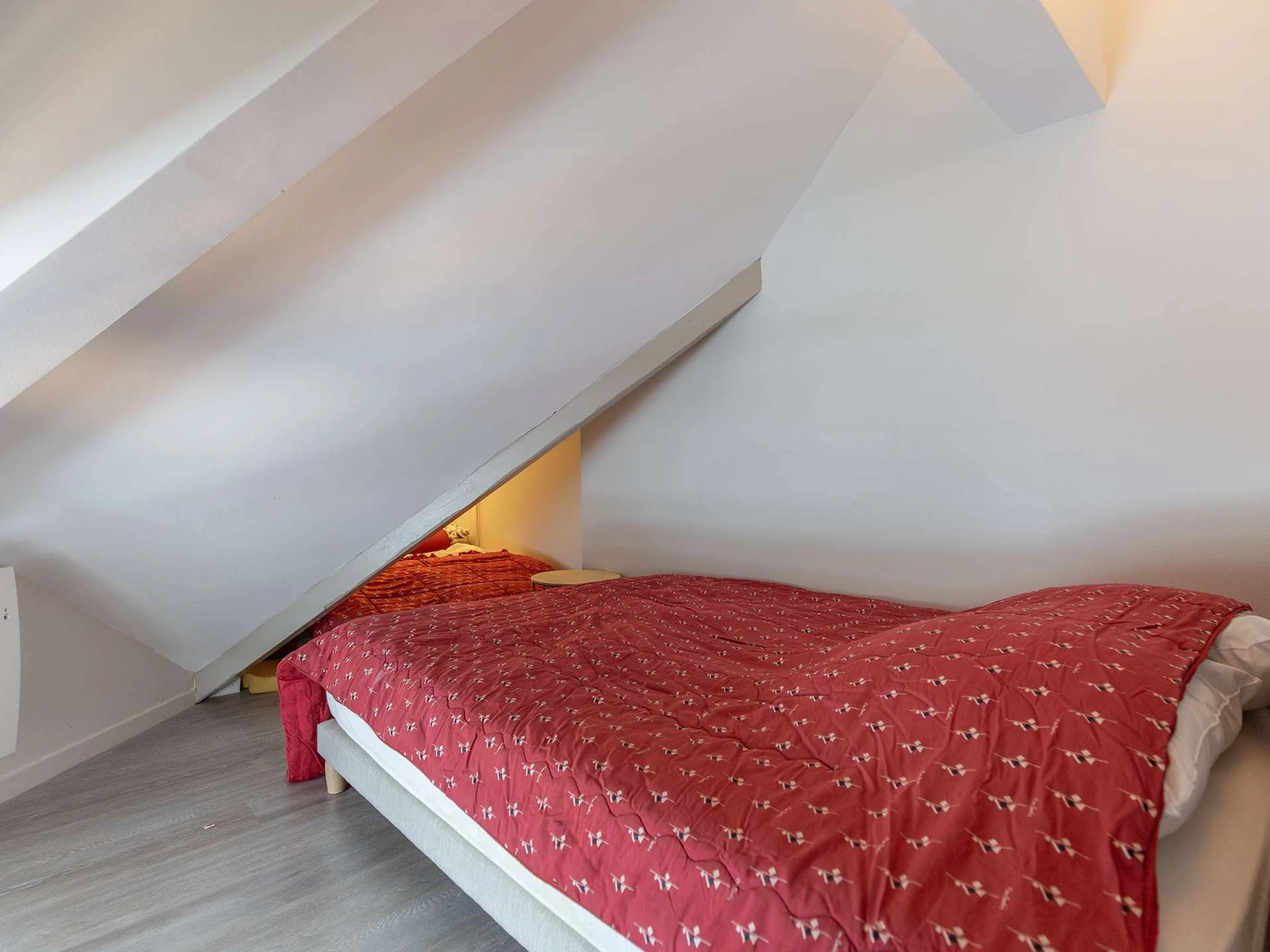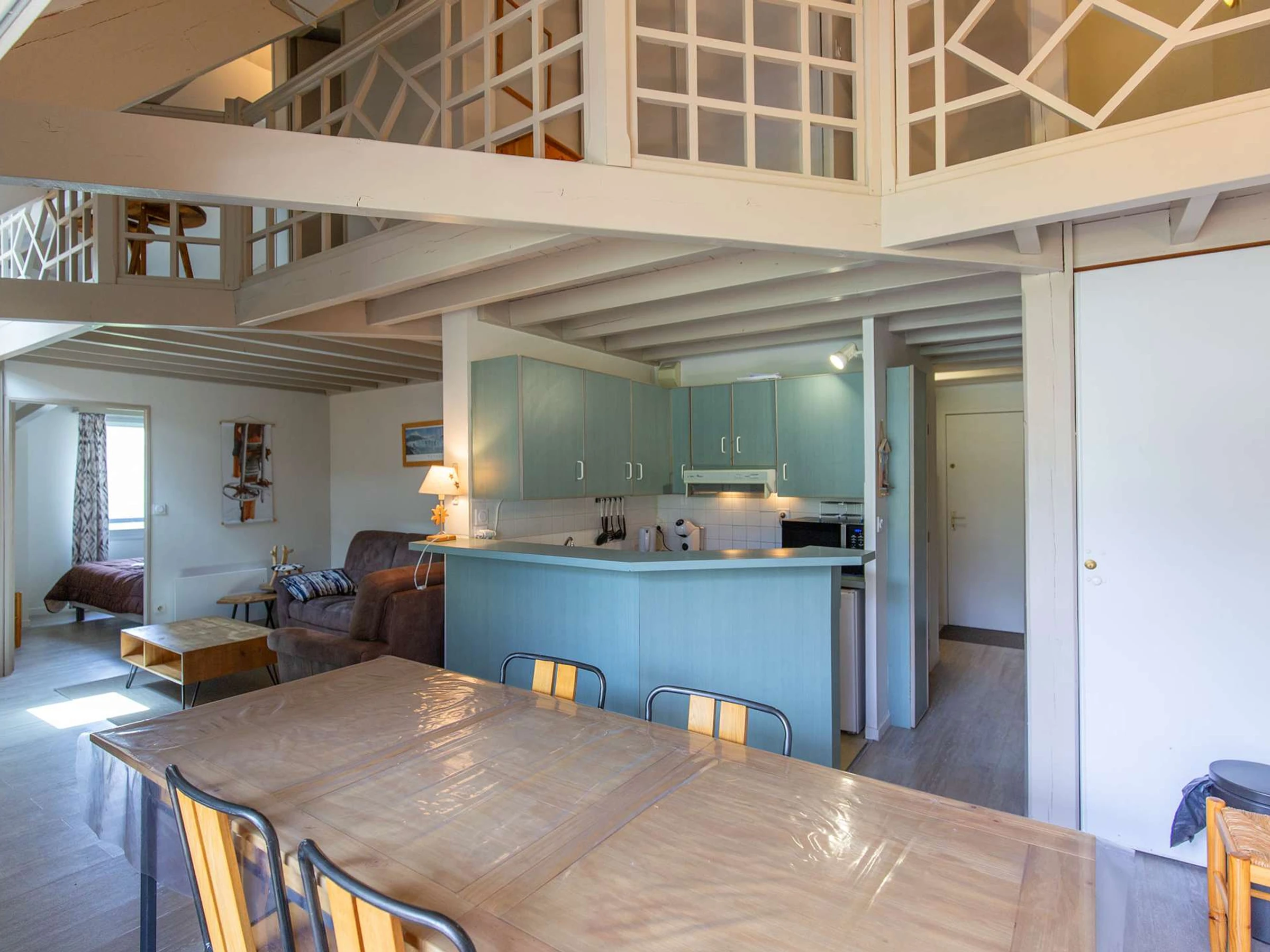Maisonette-Wohnung im 4. Stock, Zugang über eine Treppe (3 Stockwerke). 60 m² mit Südbalkon und Blick auf die Pisten. Wohnzimmer mit Sitzecke und Fernseher. Voll ausgestattete Küche mit Zugang zum Essbereich: Geschirrspüler, Tischkühlschrank, Mikrowelle, Filterkaffeemaschine, Toaster, Wasserkocher, Schnellkochtopf und Raclette-Set. Im Erdgeschoss: ein Schlafzimmer mit Doppelbett. Obergeschoss: ein Schlafzimmer mit zwei Einzelbetten + Ausziehbett und ein Zwischengeschoss mit einem Doppelbett + Zustellbett für ein Kind. Zwei Badezimmer mit Dusche und Waschbecken sowie ein separates WC. Laminatparkettboden.