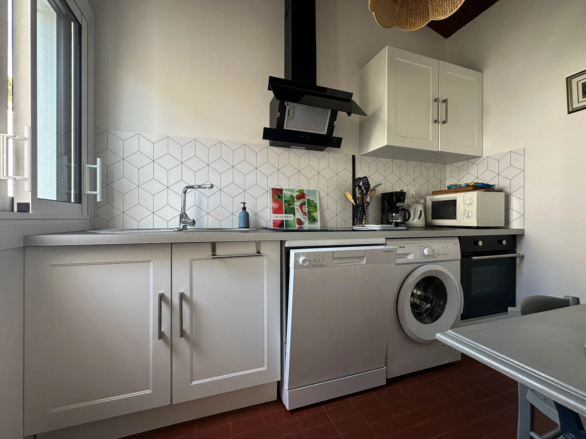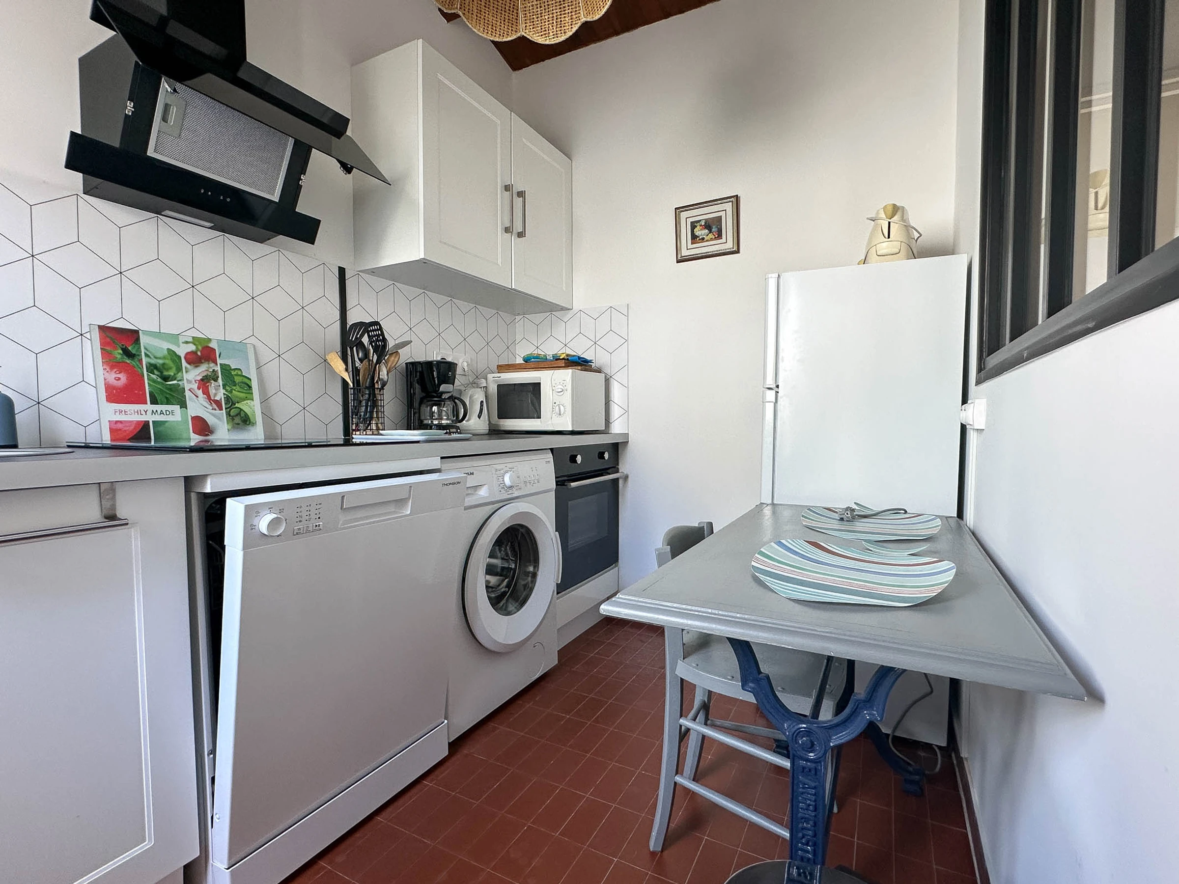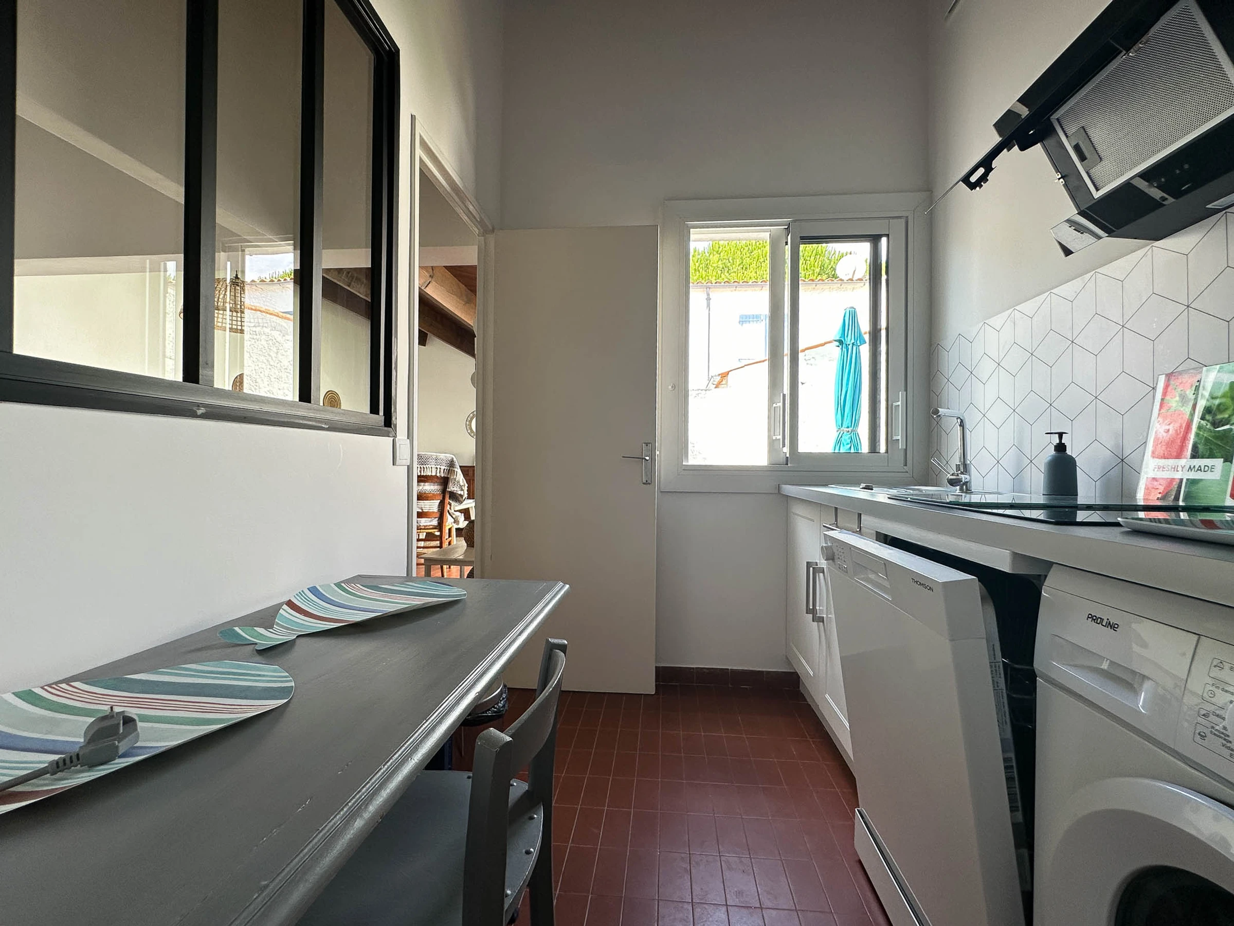 - Eingang mit Schrank - Küche, ausgestattet und ausgestattet, durch eine Glaswand getrennt: Backofen, Induktionskochfeld, Kühl-/Gefrierschrank, Mikrowelle, Geschirrspüler, Waschmaschine