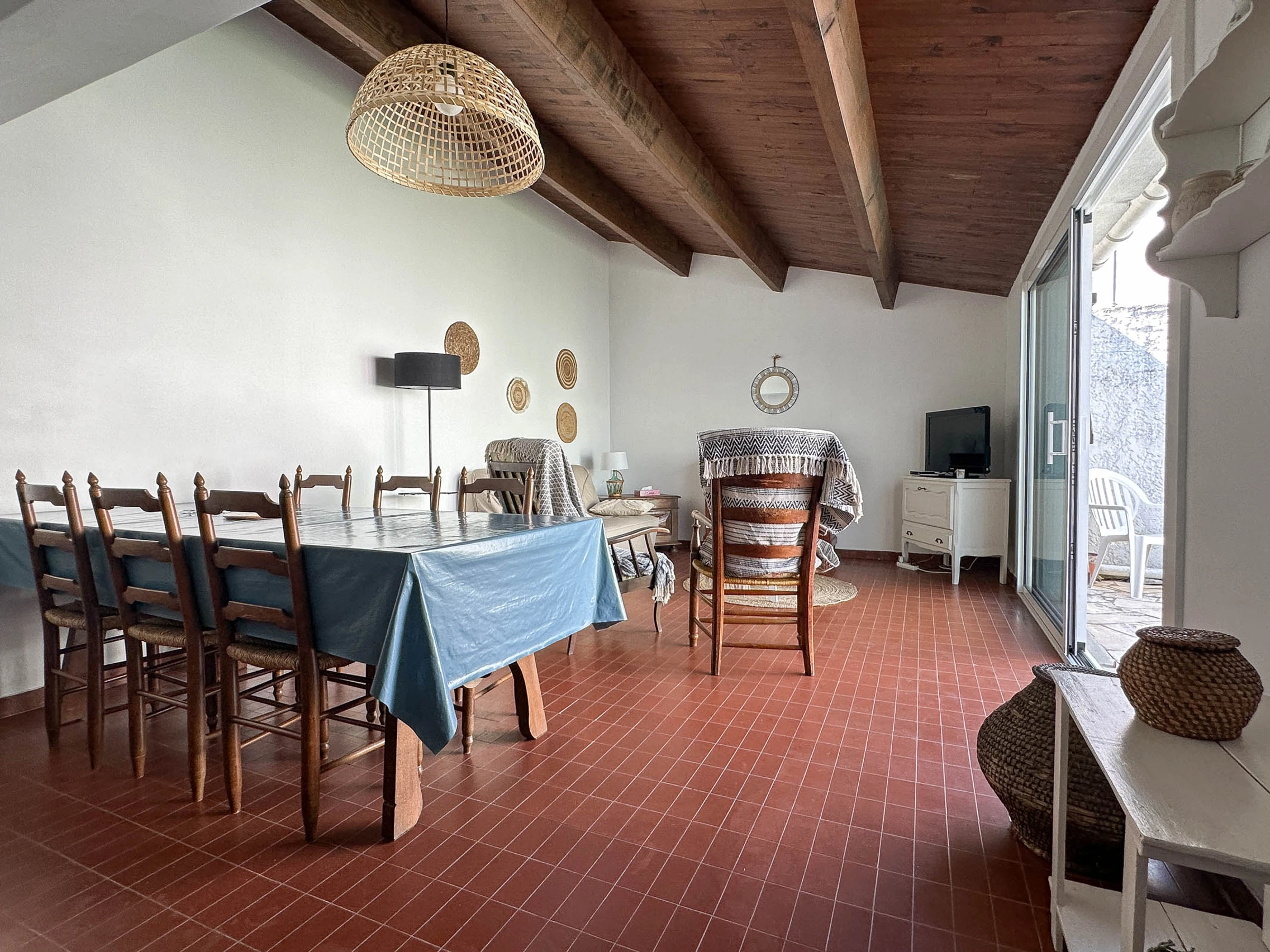 - Essbereich und Wohnzimmer mit 140 cm breitem Schlafsofa, Fernseher und Sesseln mit Zugang zu einer nach Osten ausgerichteten Terrasse