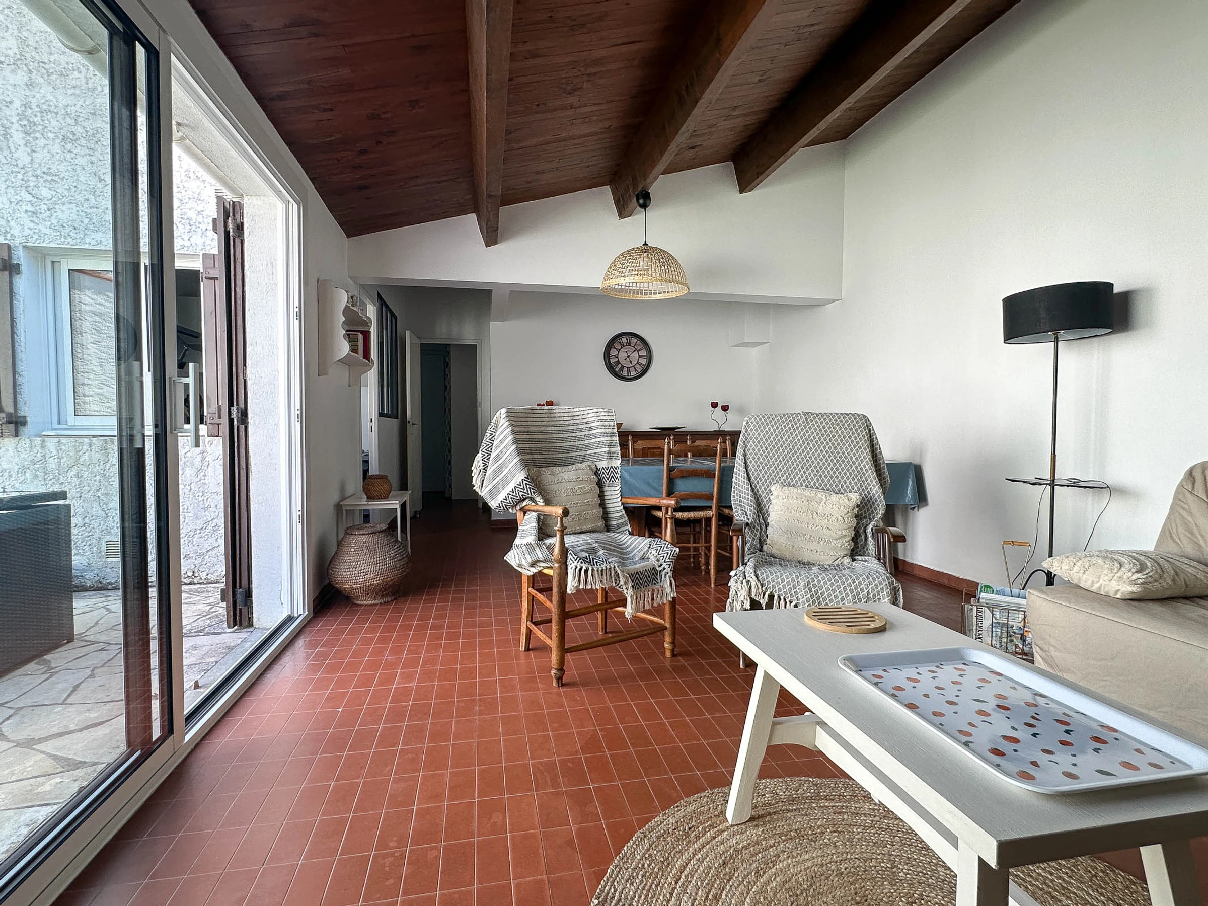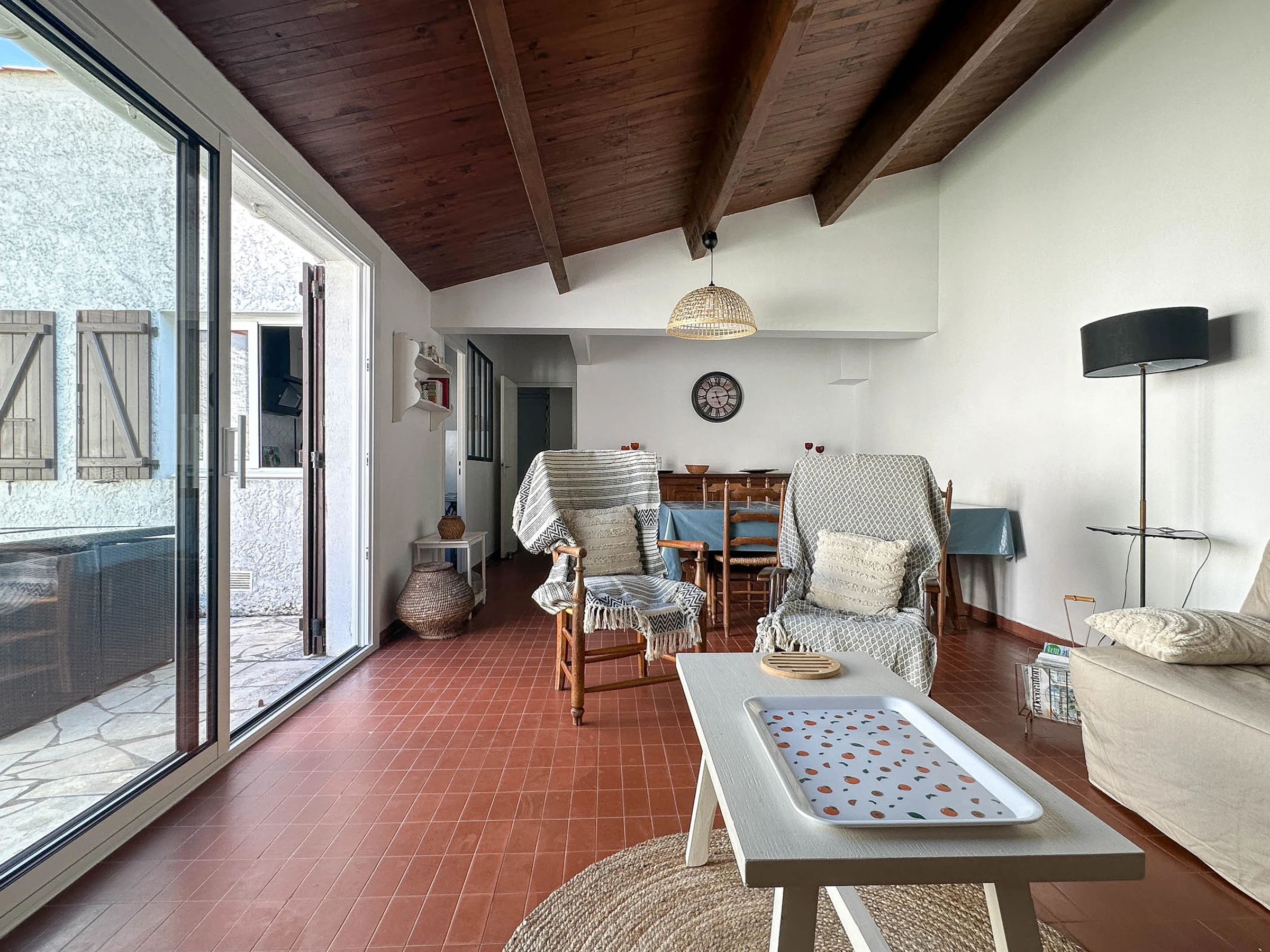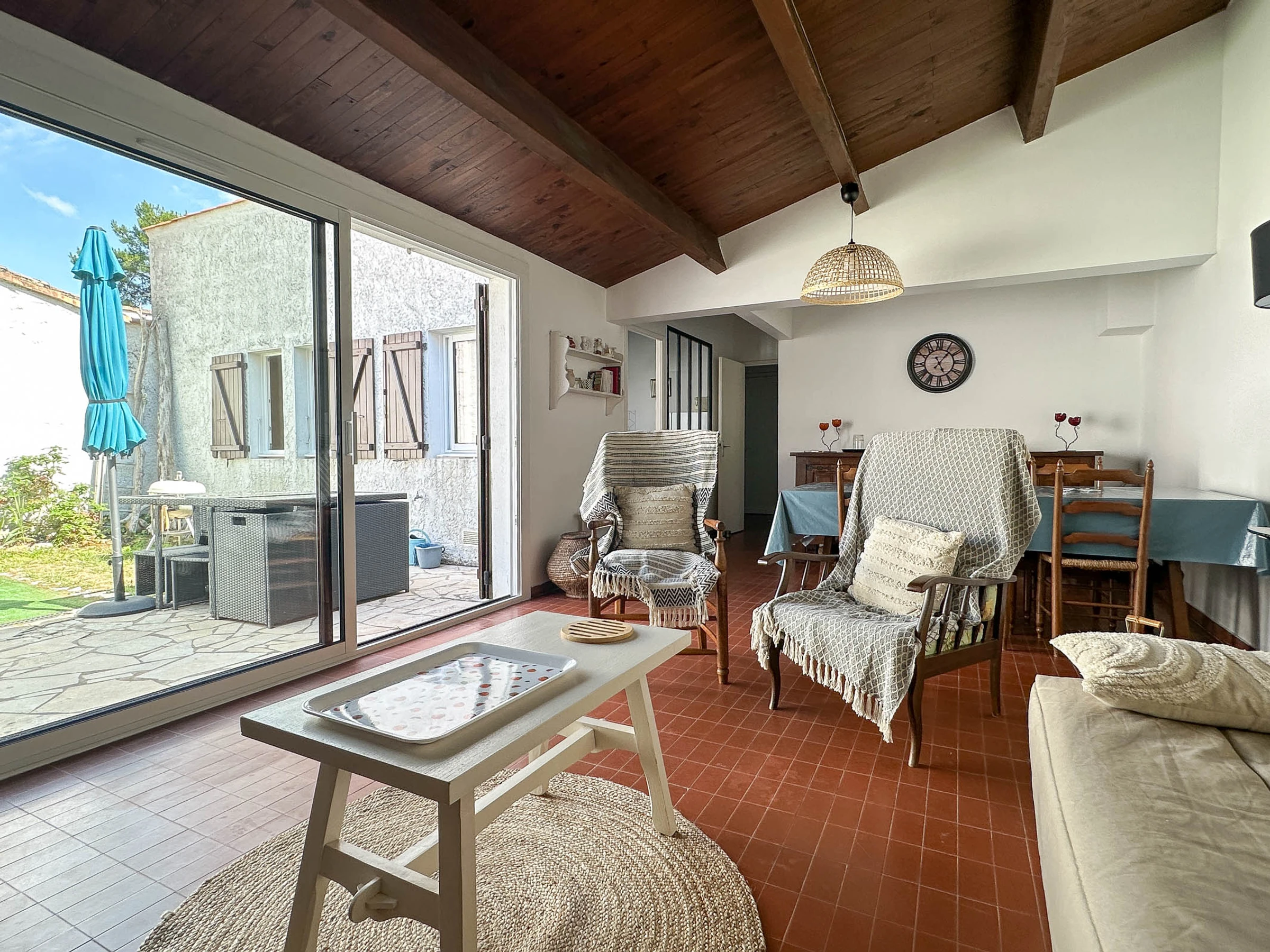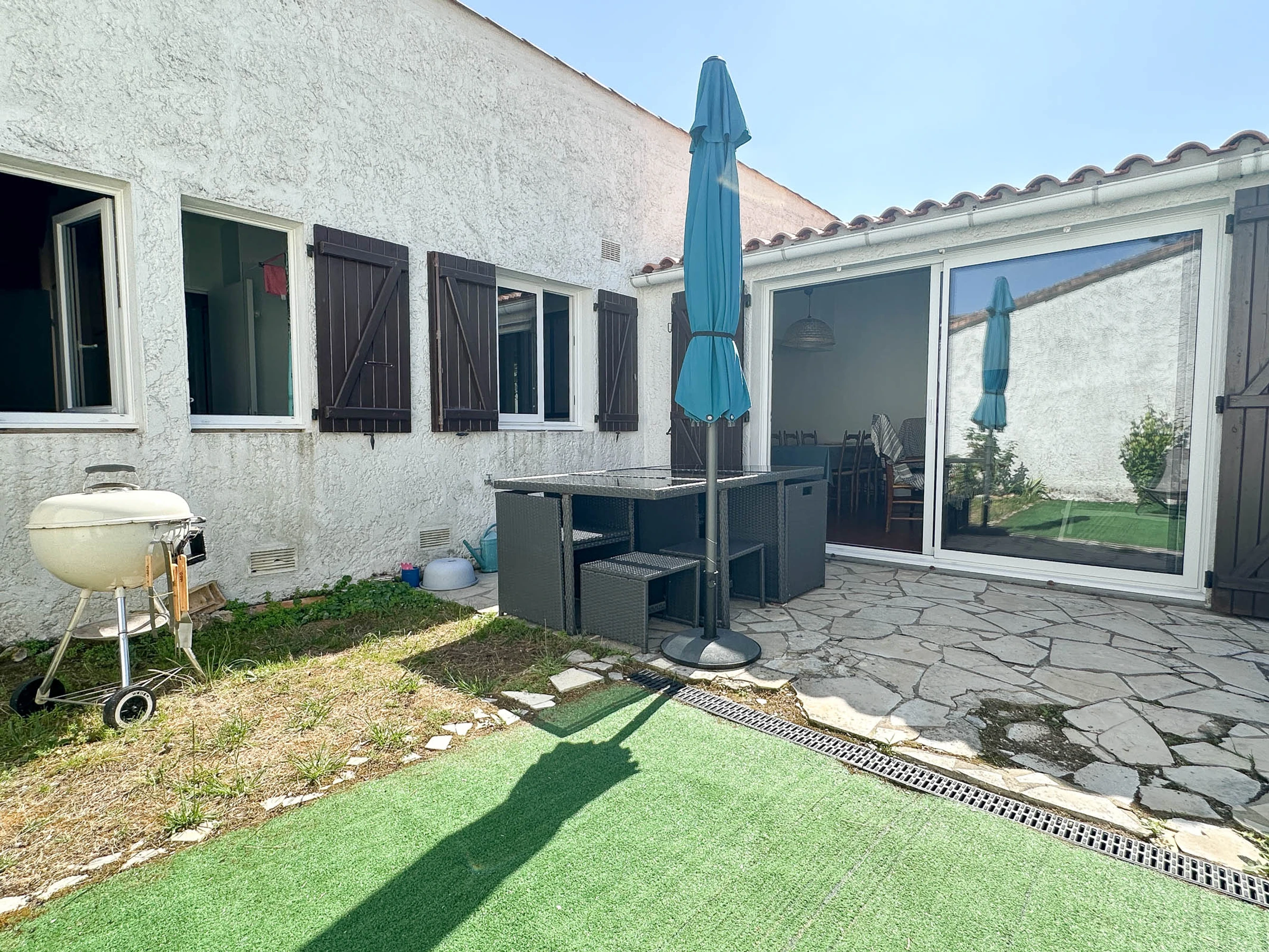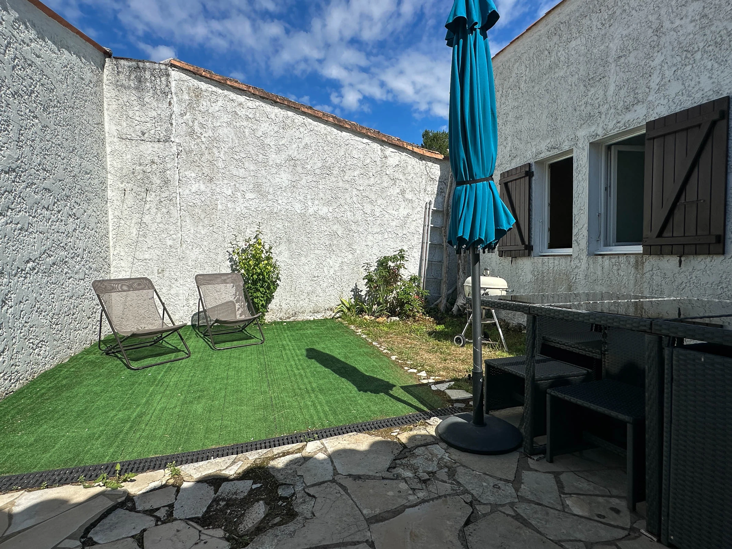 Terrasse ideal für Familienessen mit Gartenmöbeln, Liegestühlen, Grill und Sonnenschirm