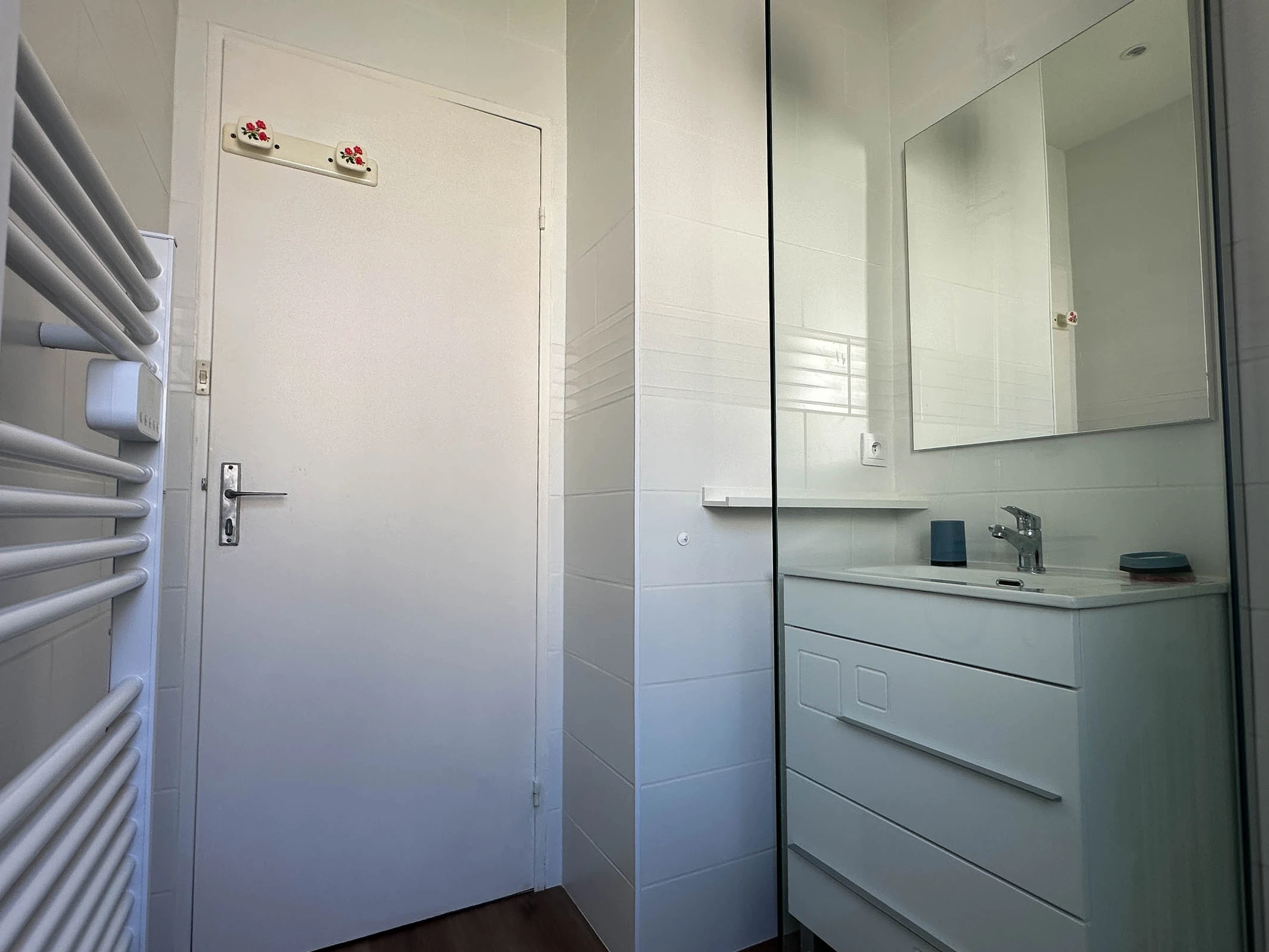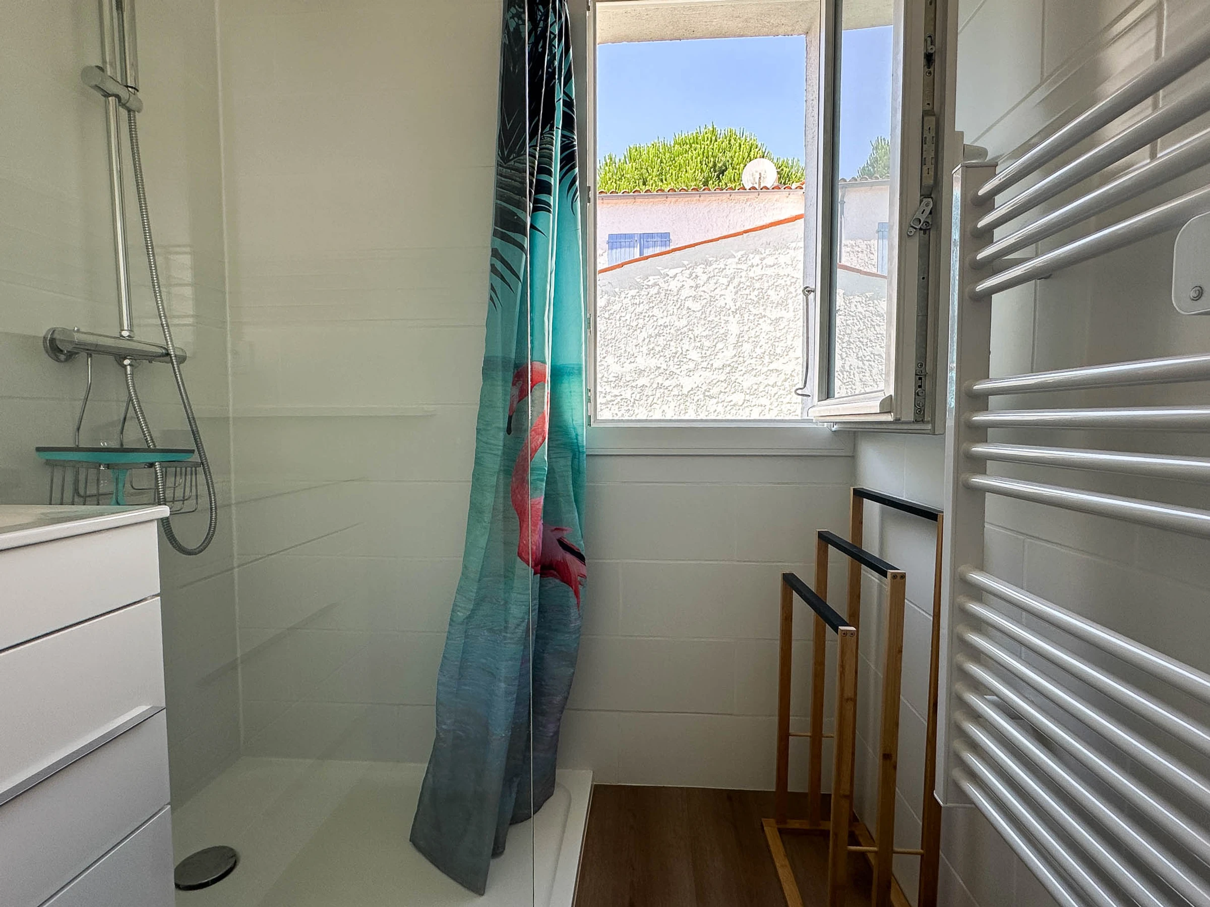 -Renoviertes Badezimmer mit ebenerdiger Dusche, beheiztem Handtuchhalter