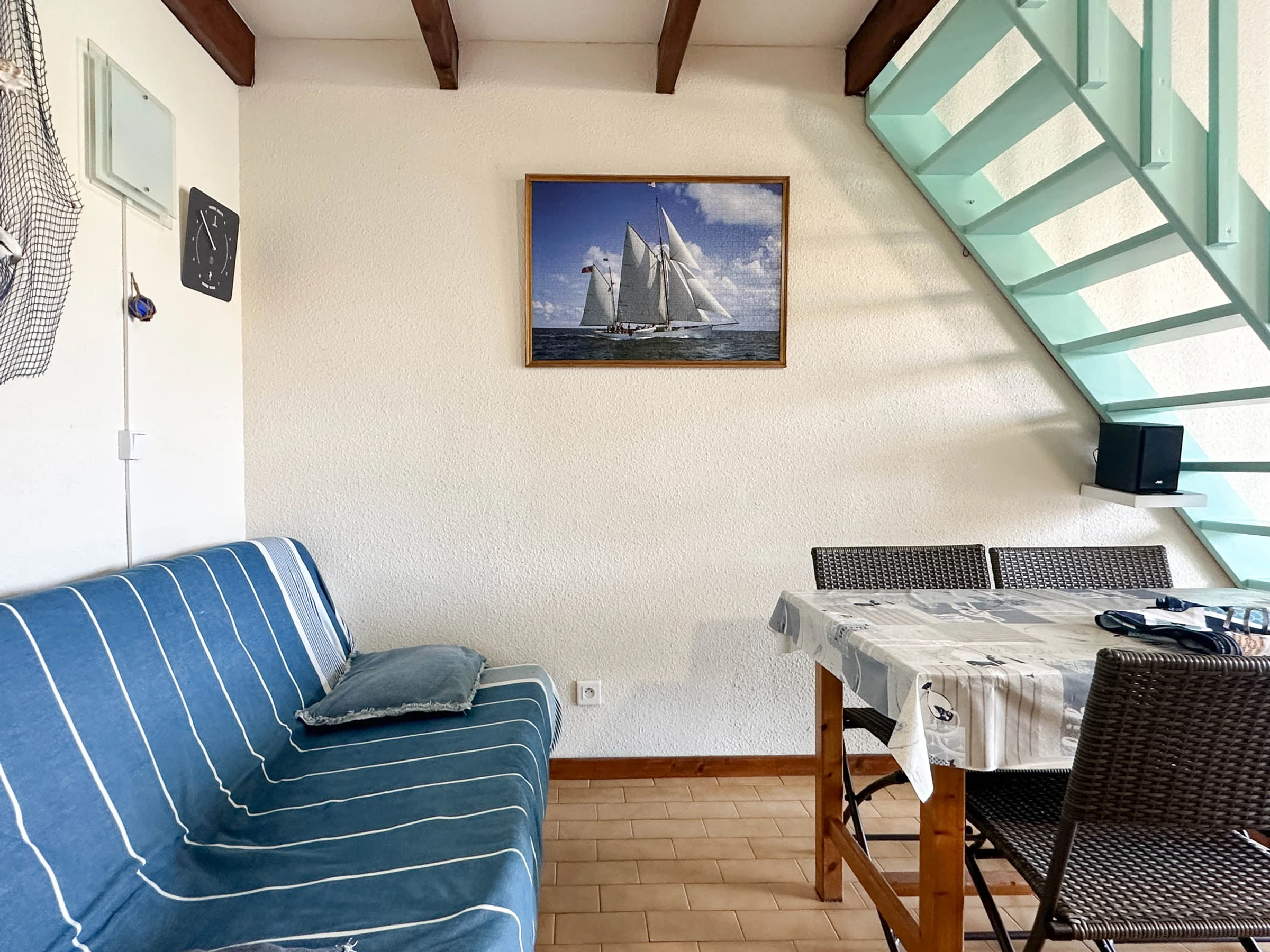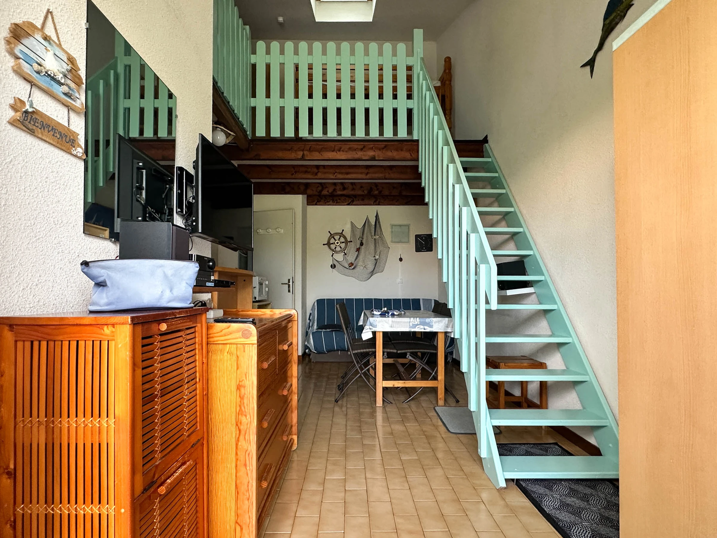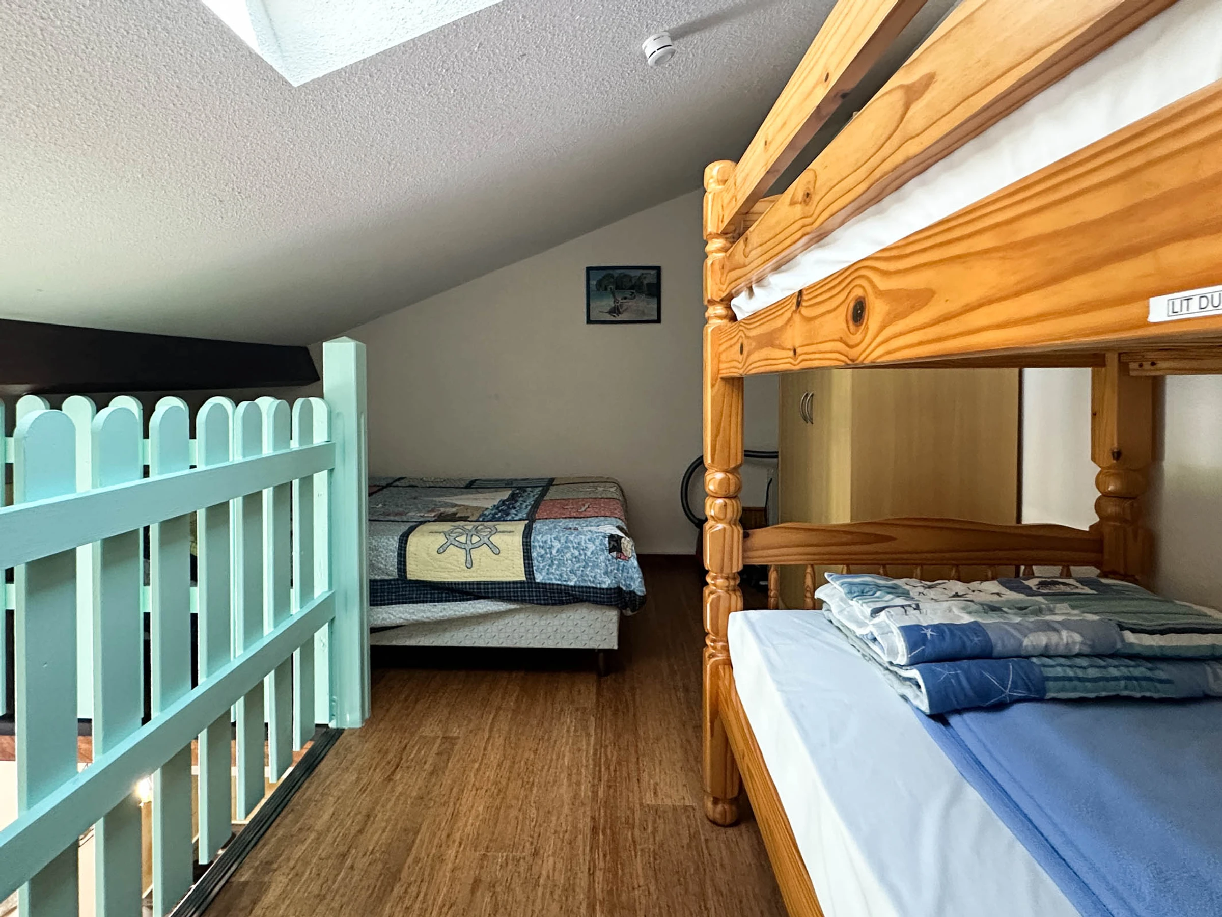 Obergeschoss - Zwischengeschoss 1 140-cm-Bett (neue Bettwäsche) + 2 90-cm-Etagenbetten, Kleiderschrank -