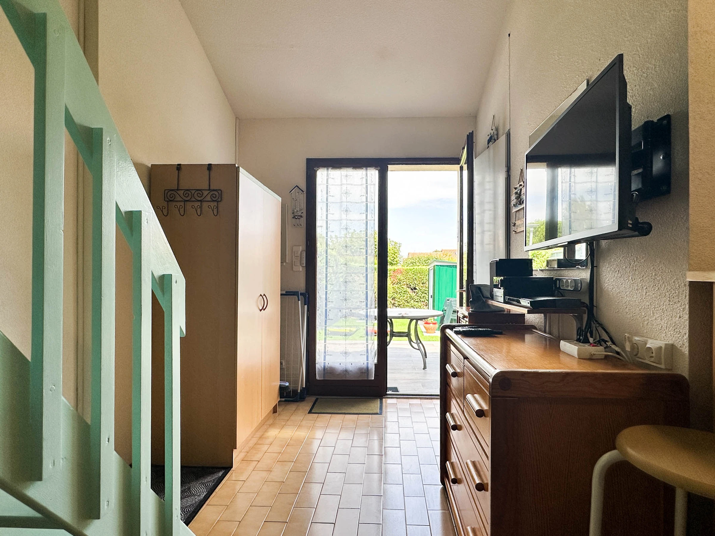 Wohnzimmer mit Sofa, TV, DVD, HI-FI, Zugang zur gefliesten Terrasse mit Markise, Ostlage -