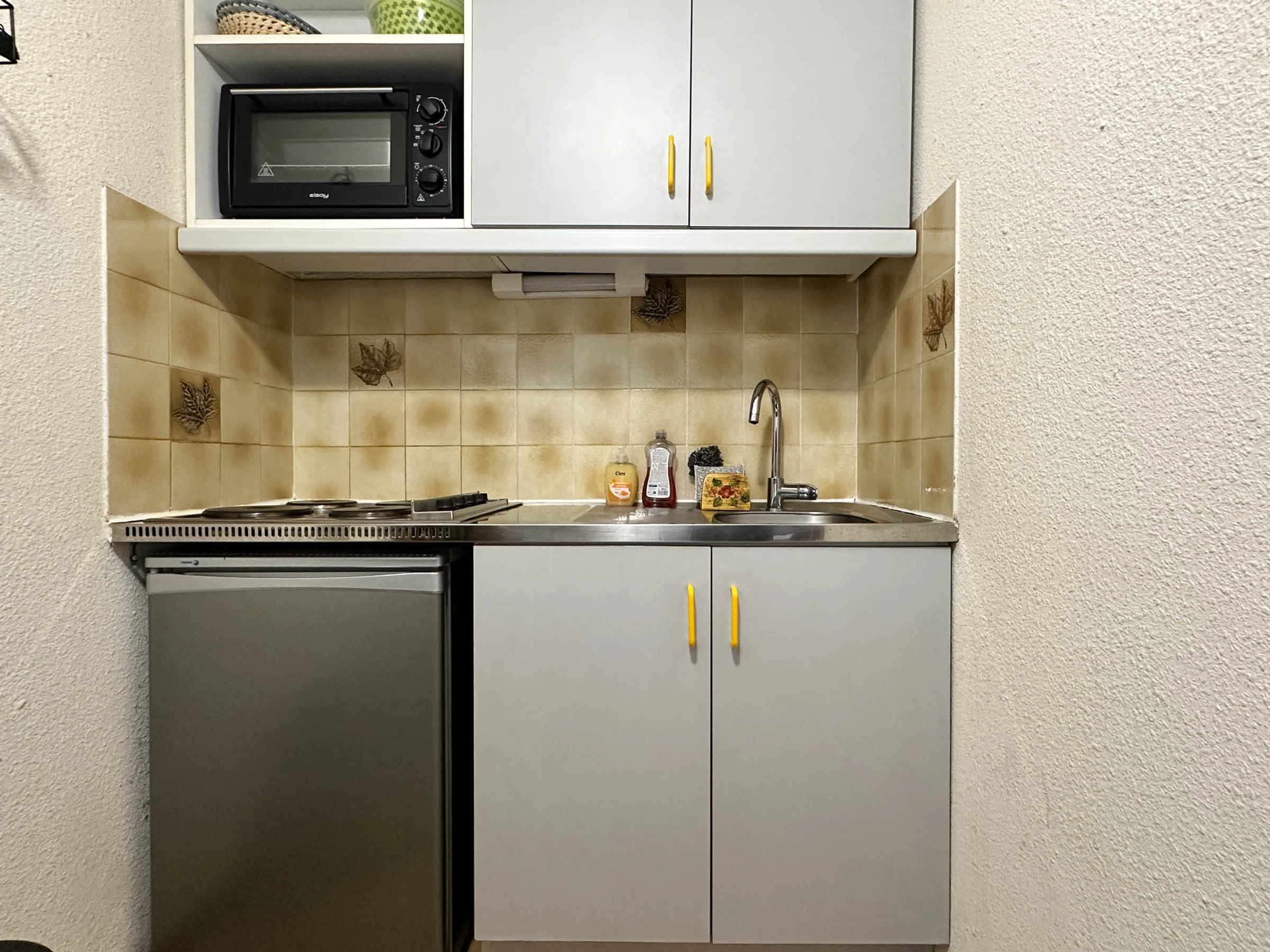 US-amerikanische Küche mit Elektroherd, Minibackofen, MW und Kühlschrank