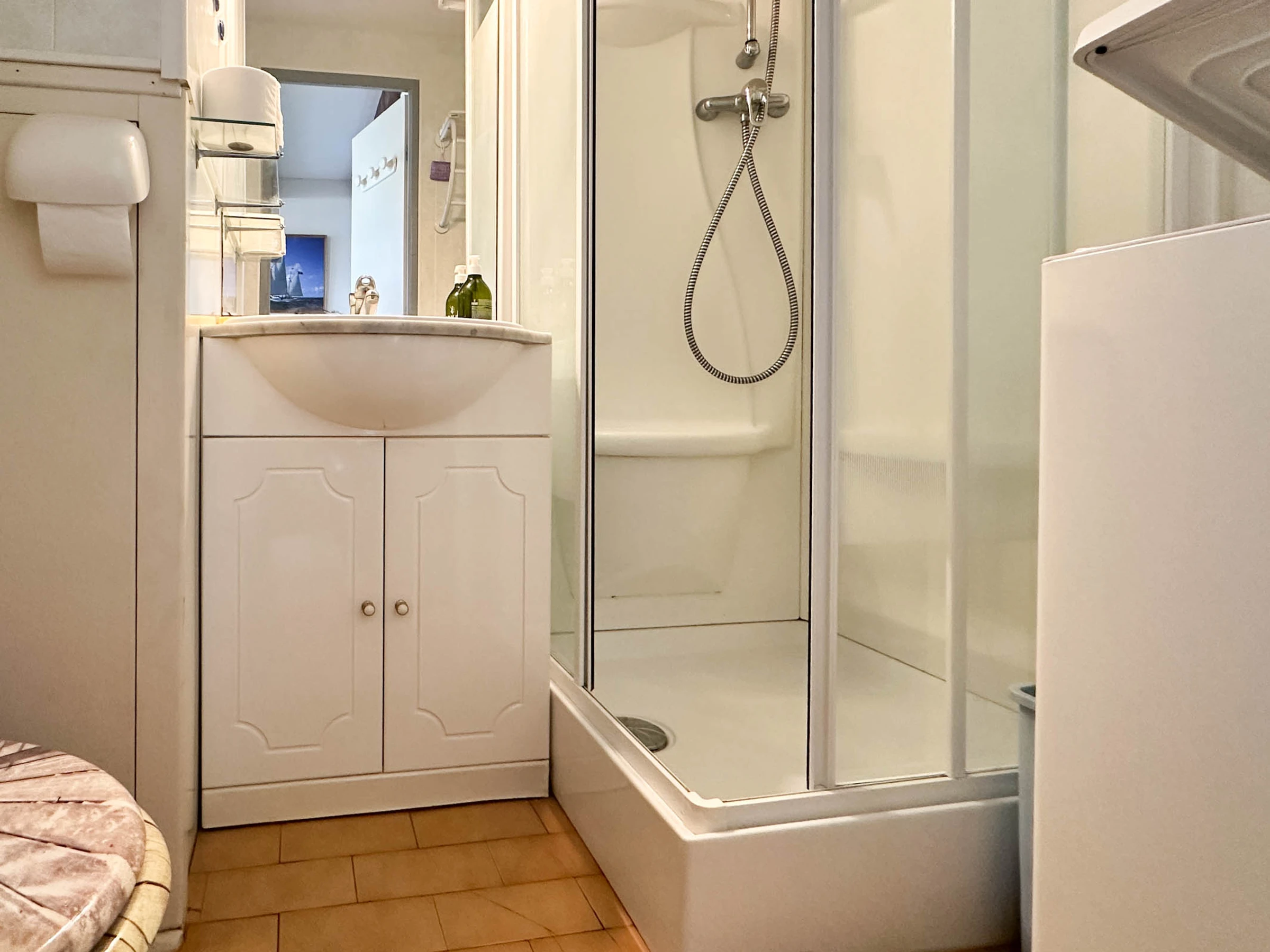 Badezimmer mit Duschkabine, Waschtisch, Toilette und Waschmaschine -