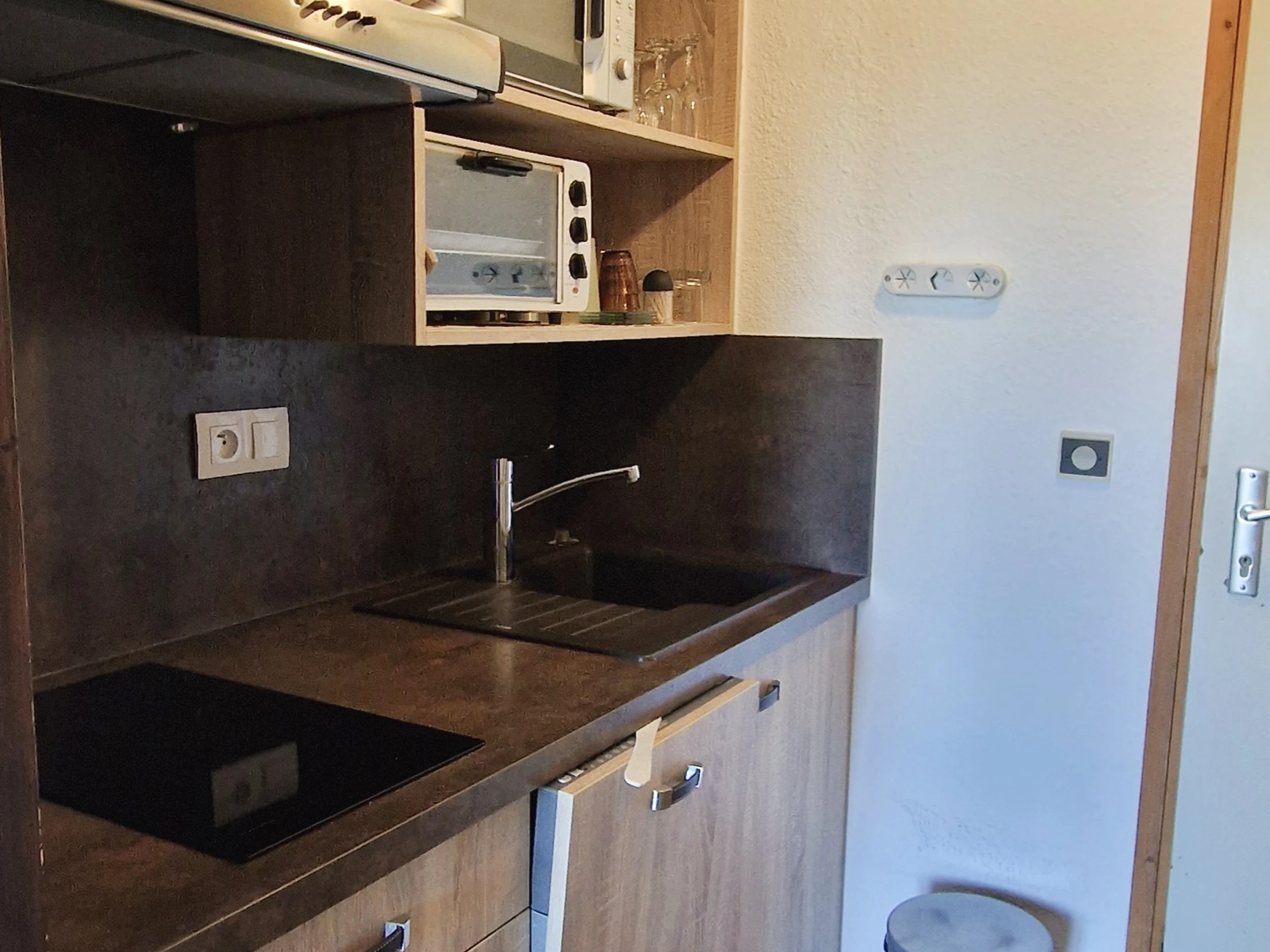 Die Wohnung ist komplett ausgestattet mit einem Kühlschrank, 2 Kochplatten, einer Mikrowelle, einem Minibackofen, einem Geschirrspüler, einem Toaster, einem Wasserkocher und einer Tassimo-Kaffeemaschine, sodass Sie Ihren Aufenthalt in völliger Autonomie genießen können.