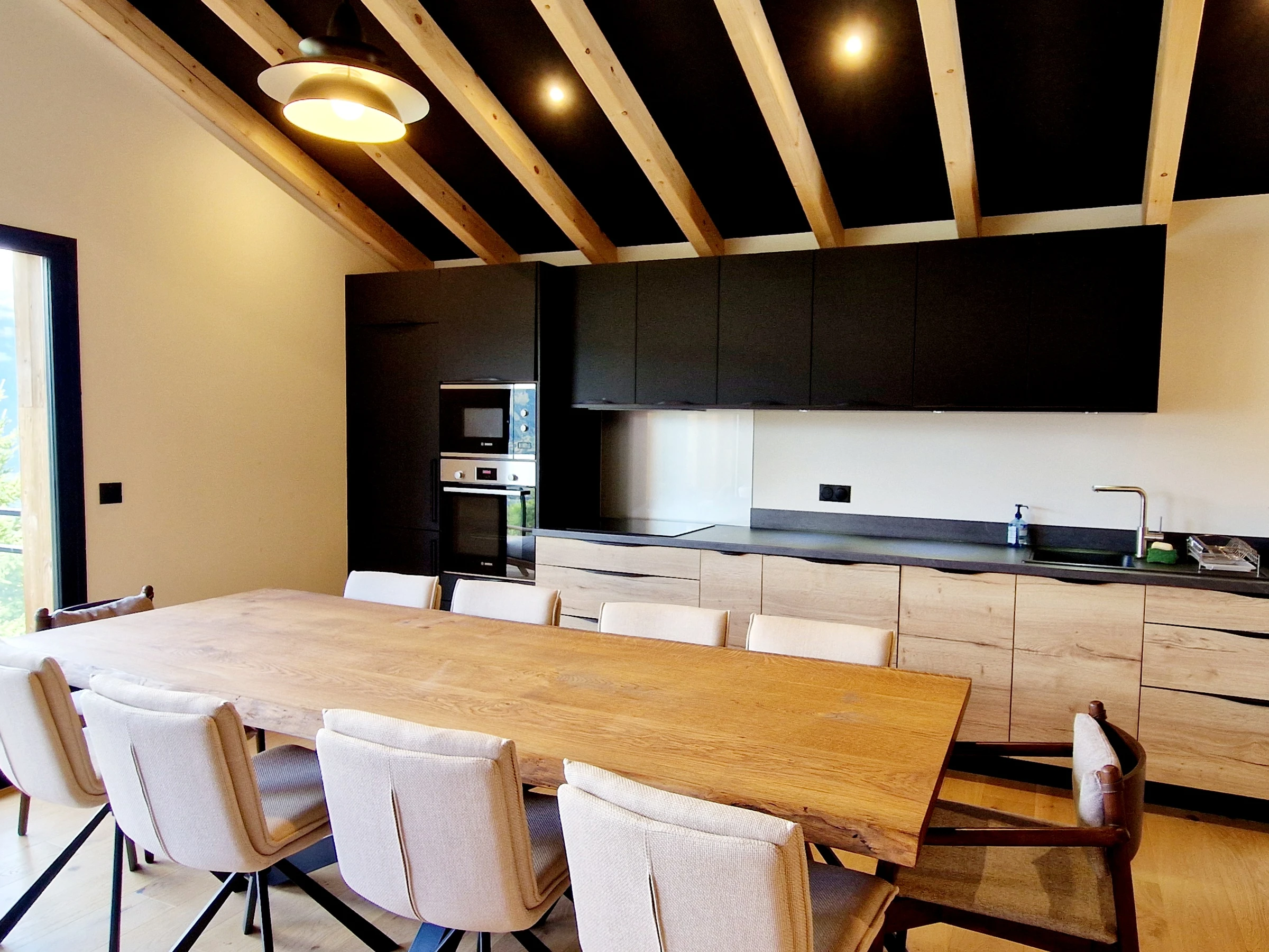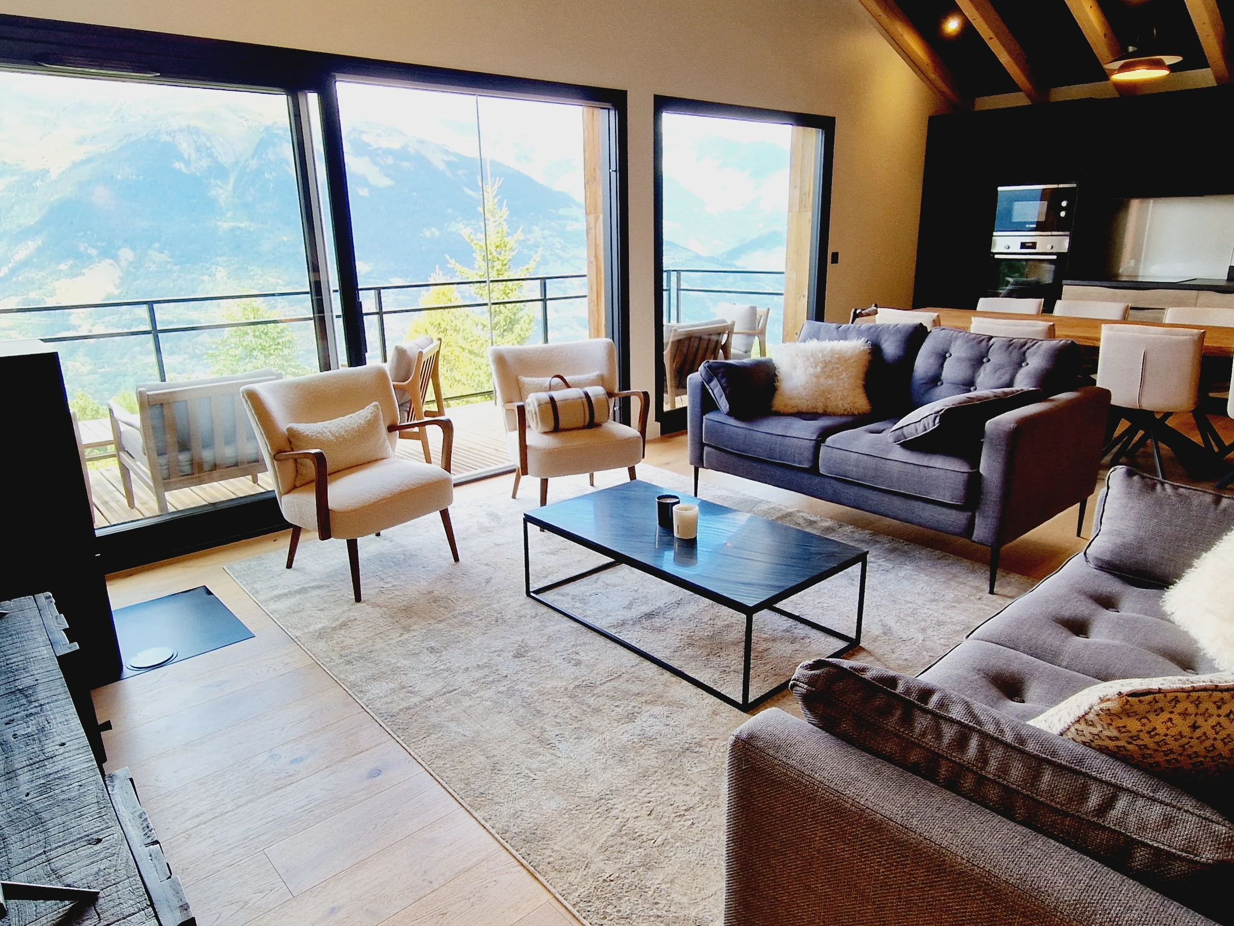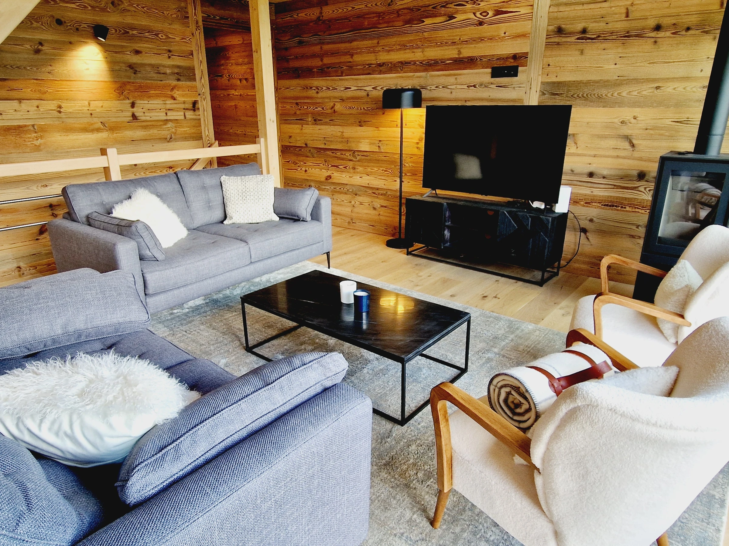 Im 1. Stock ein offenes Wohnzimmer mit herrlichem Blick auf den Mont Blanc, angeschlossenem Fernseher, Kamin und Sesseln. Voll ausgestattete Küche.