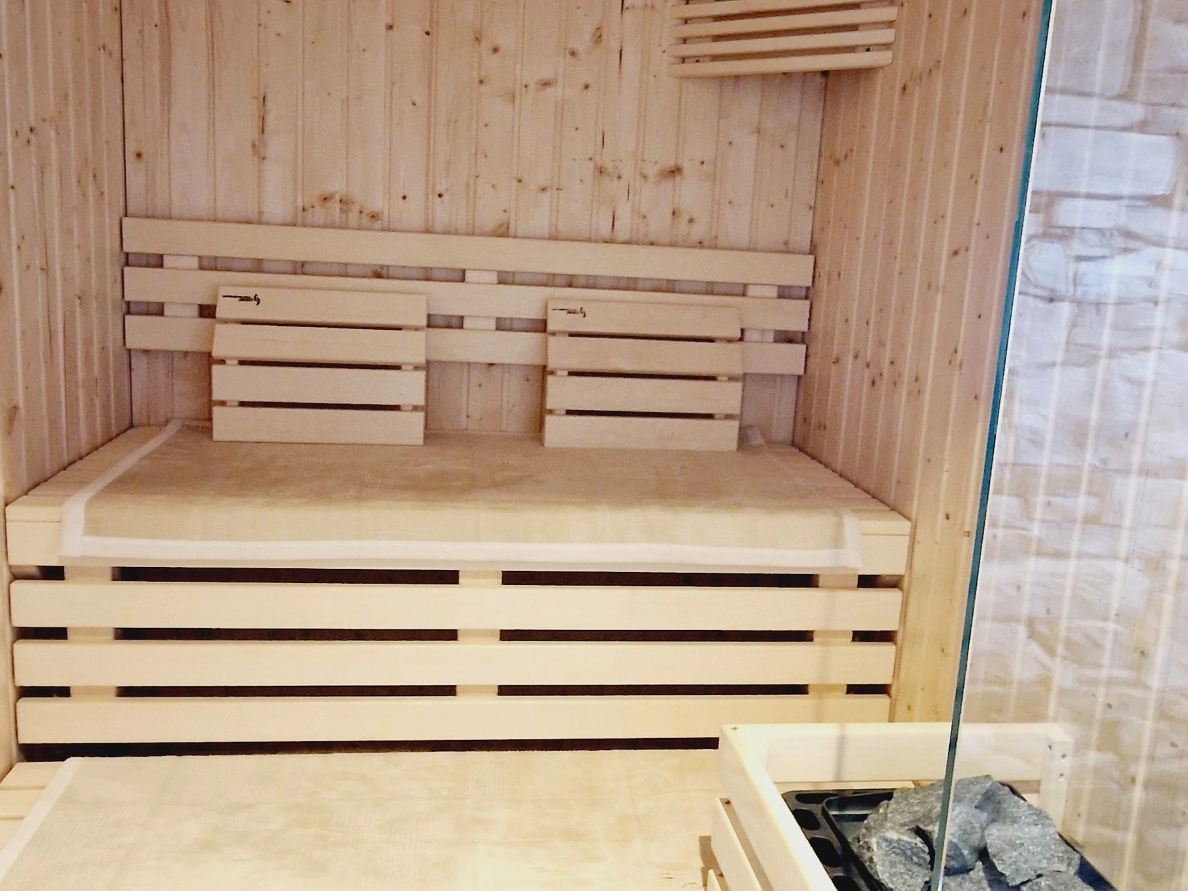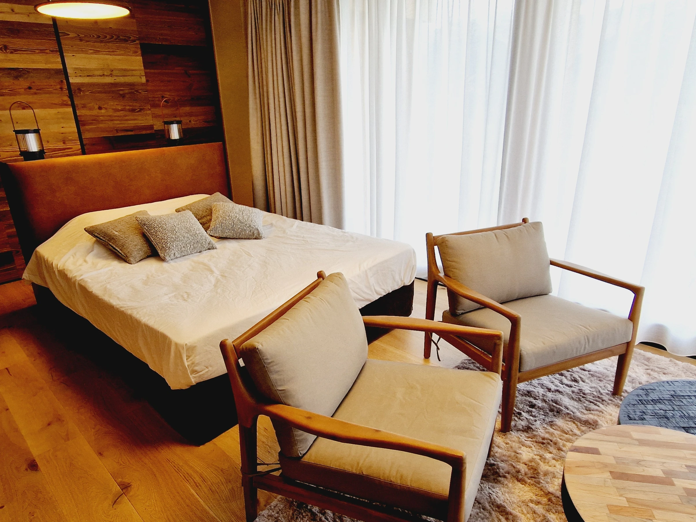 Ein Hauptzimmer mit einem 160 cm breiten Bett und eigenem Duschbad und separatem WC sowie Zugang zur Terrasse mit der Außensauna.
