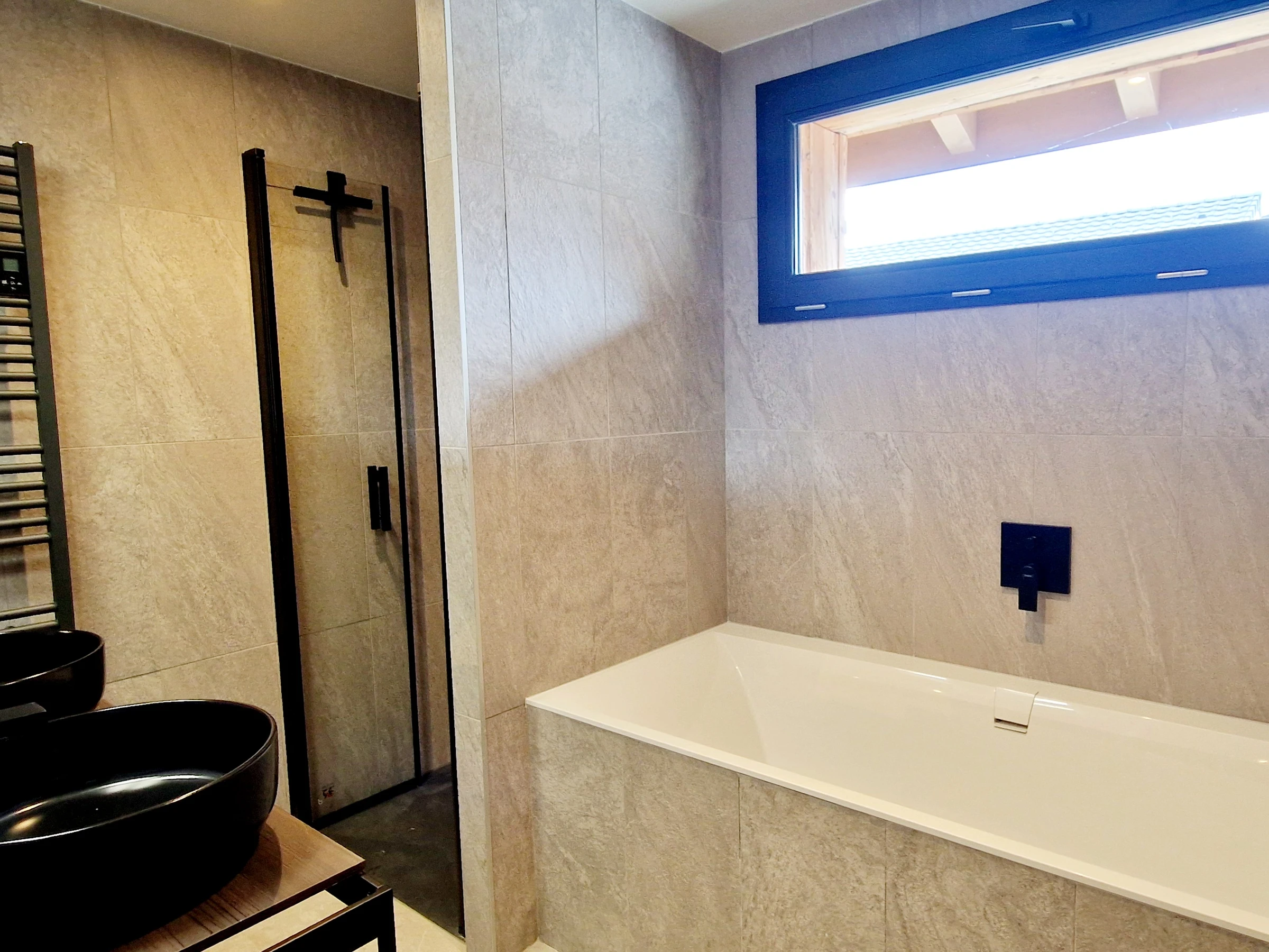 Ein Badezimmer mit Badewanne, Dusche und Doppelwaschbecken,