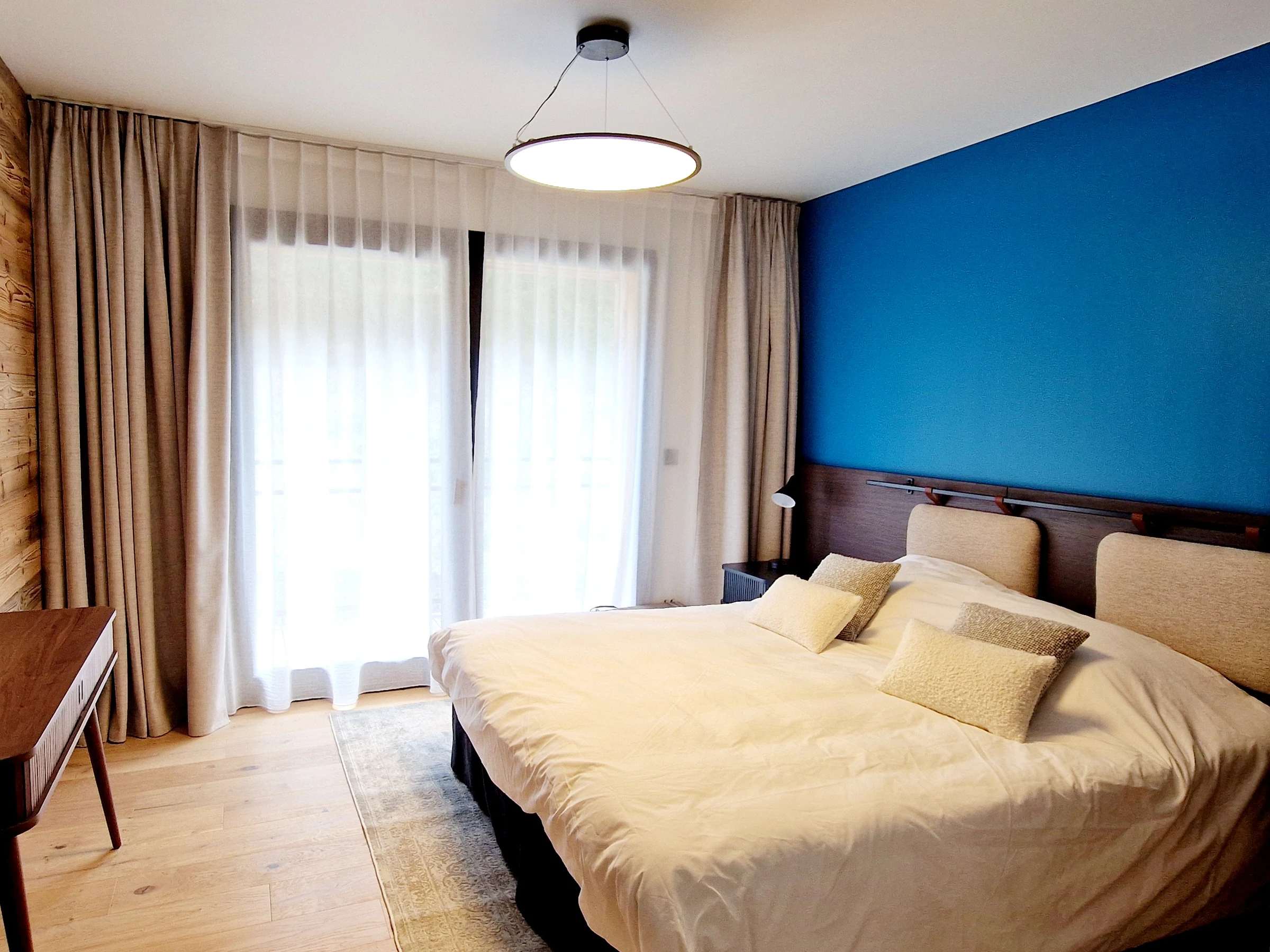 Ein Schlafzimmer mit einem 180 cm breiten Kingsize-Bett, das auf Anfrage in 2 90 cm breite Einzelbetten umgewandelt werden kann, direkter Zugang zum Balkon/Schränke