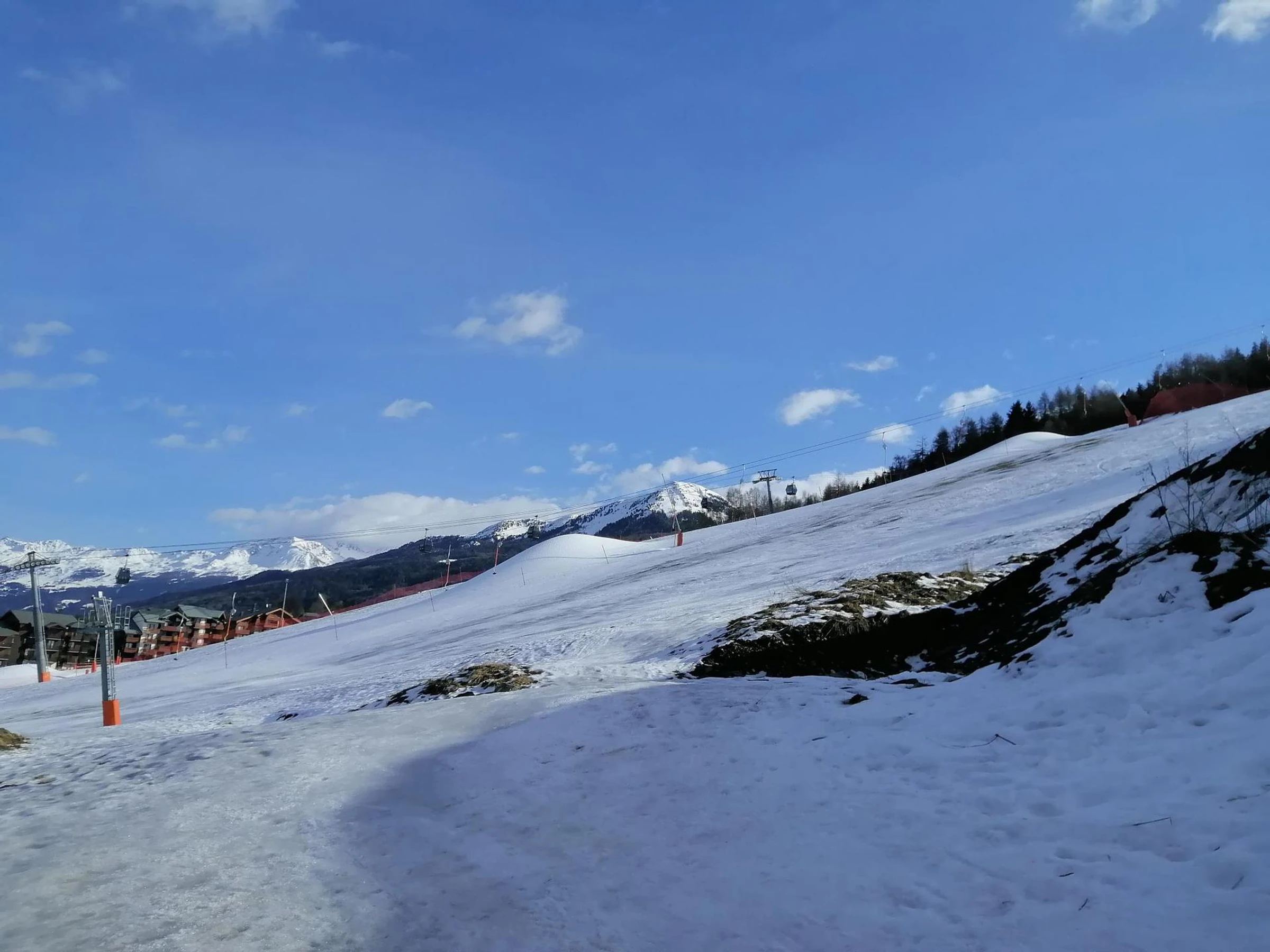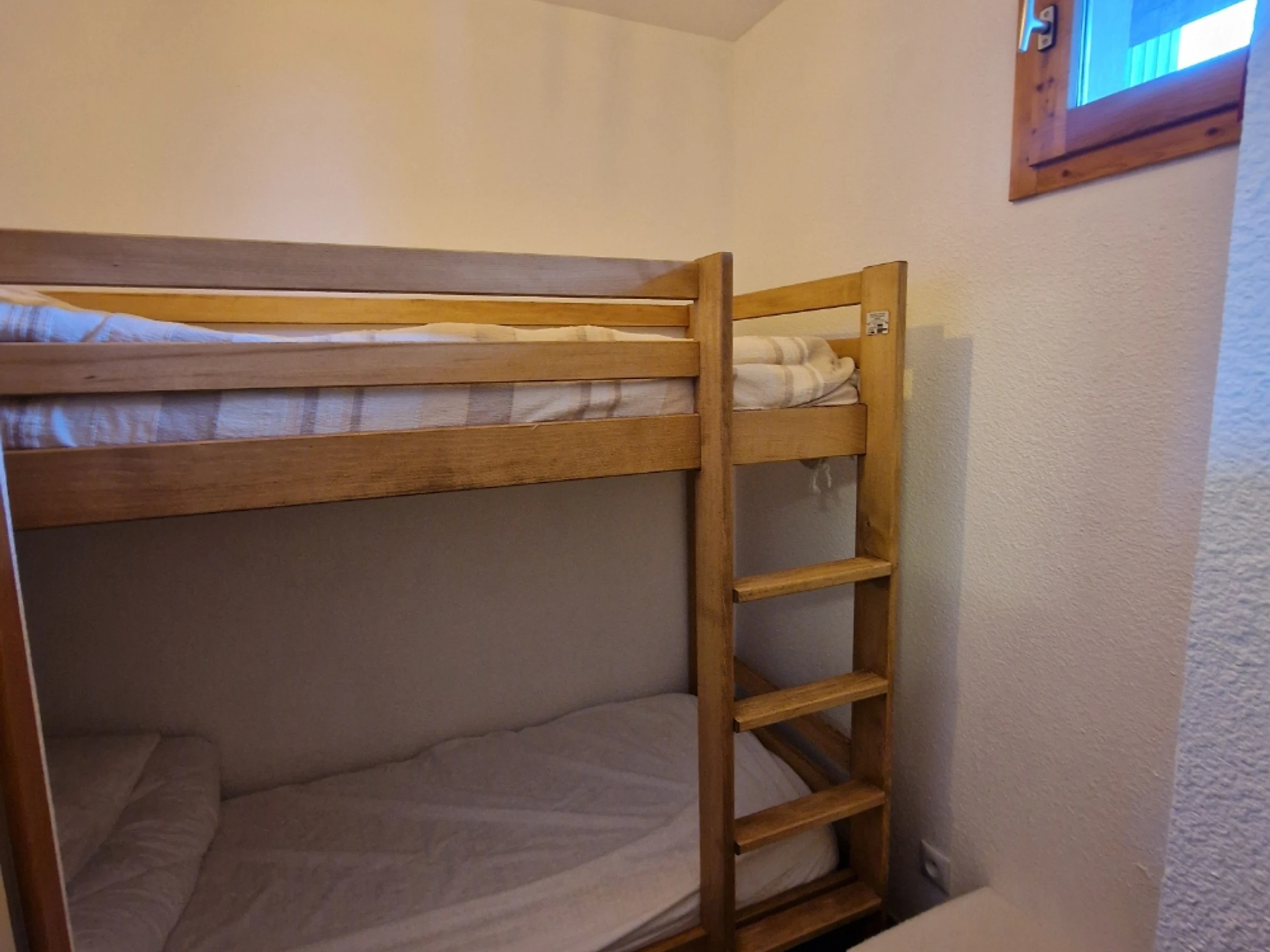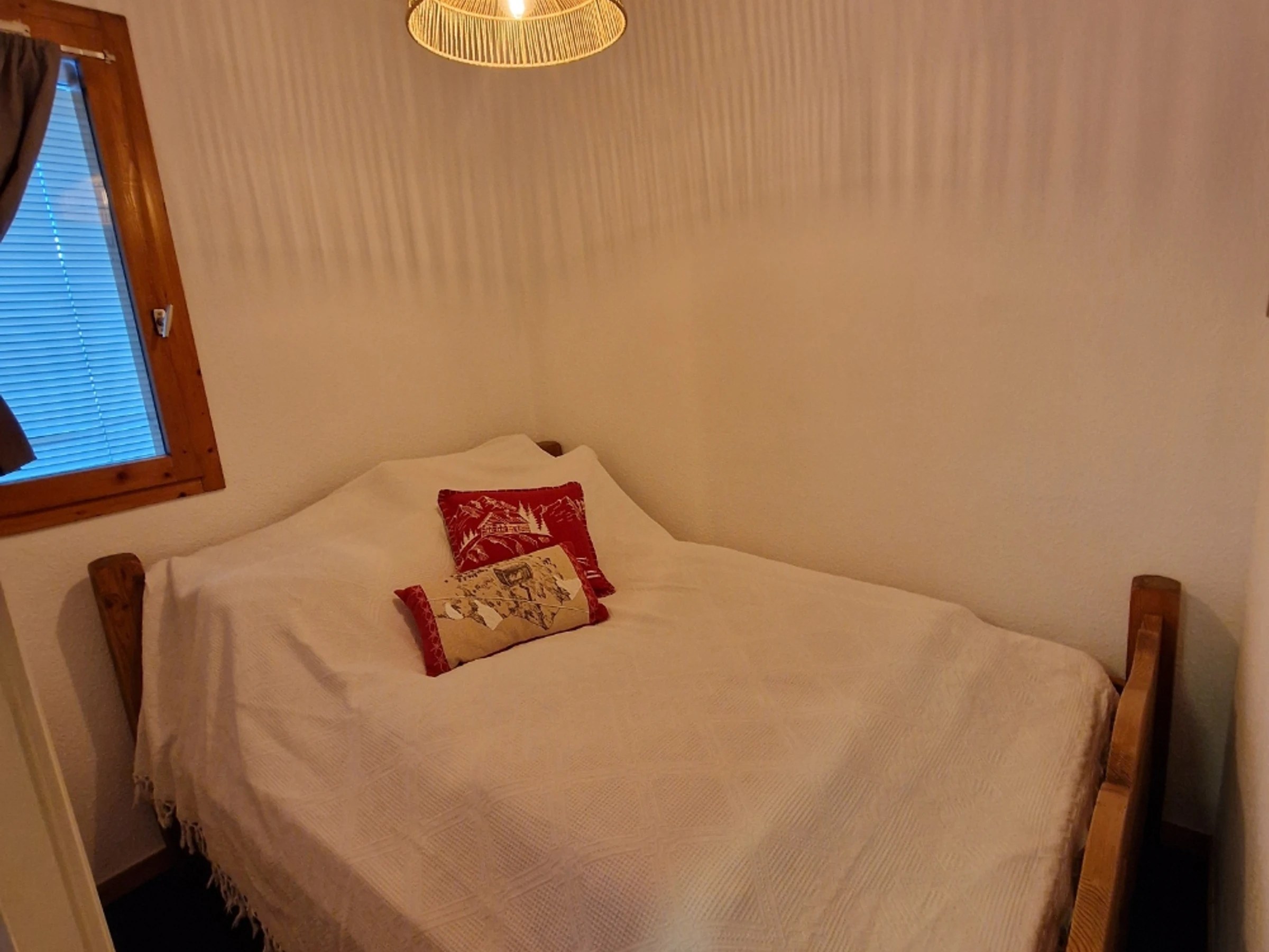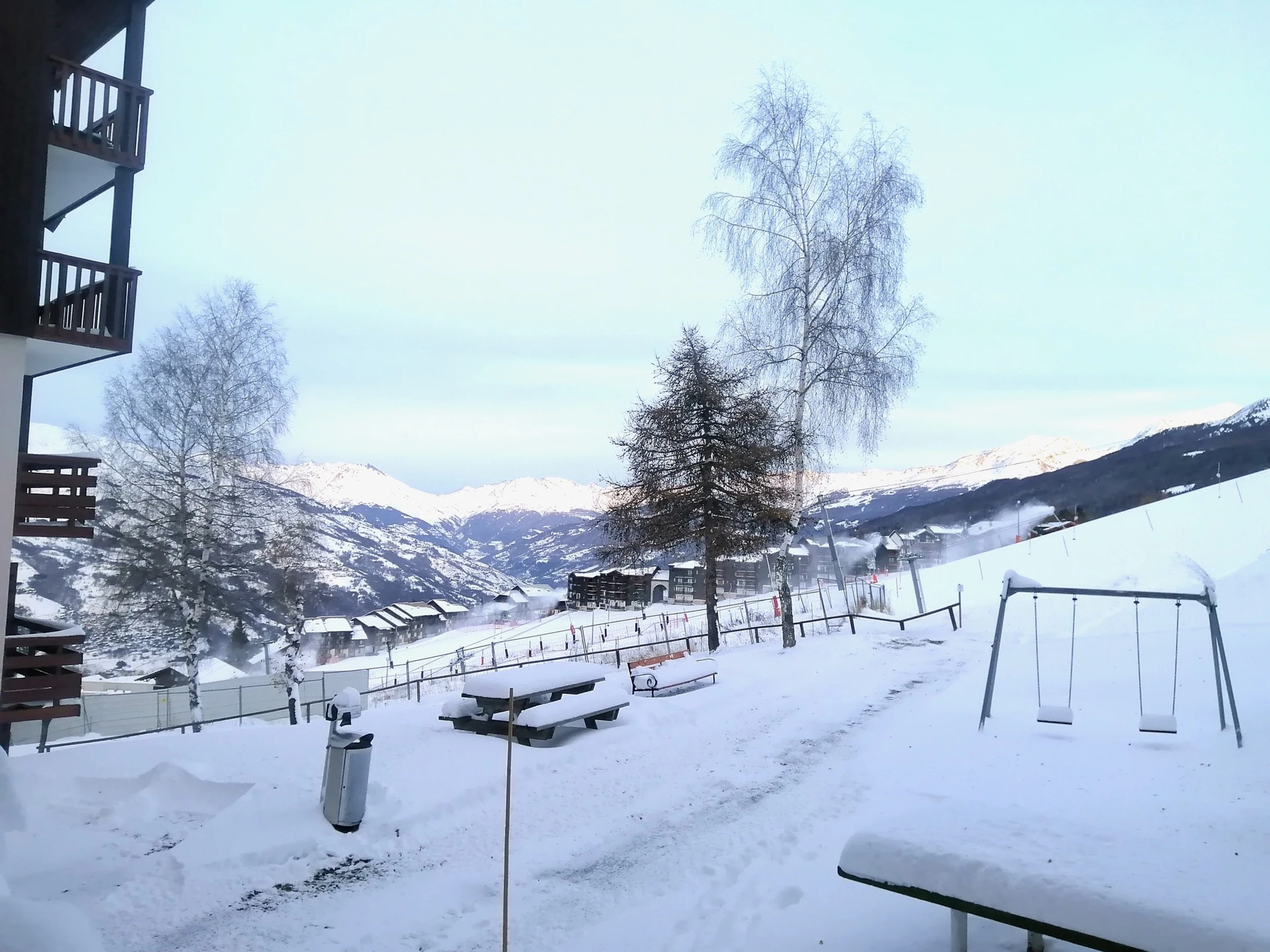 Die Ferienwohnung „Le Chanteloup“ (26 m²) im 2. Stock (ohne Aufzug) bietet Platz für 4–5 Personen und verfügt über eine geschlossene Loggia mit Blick ins Tal sowie einen eigenen Skischrank.