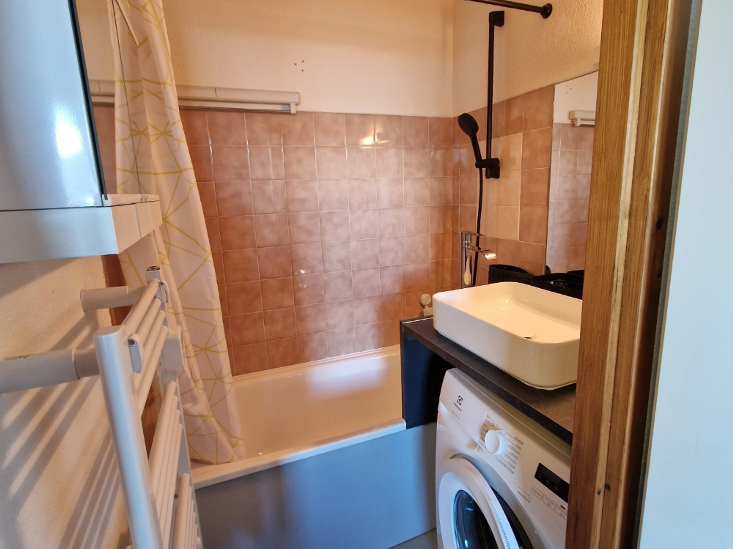 Das Badezimmer ist mit Waschbecken, Badewanne und Waschmaschine ausgestattet. Separates WC.