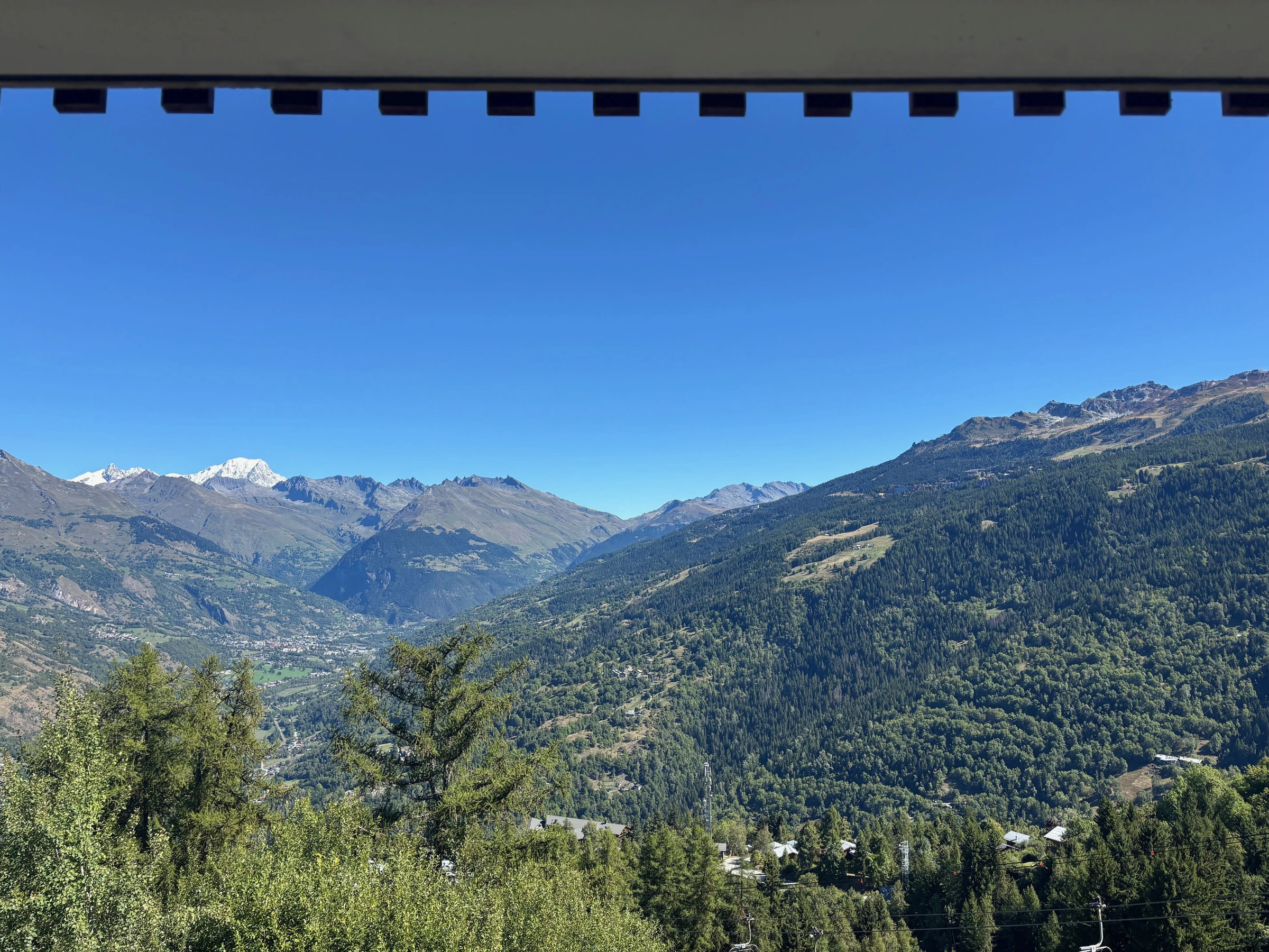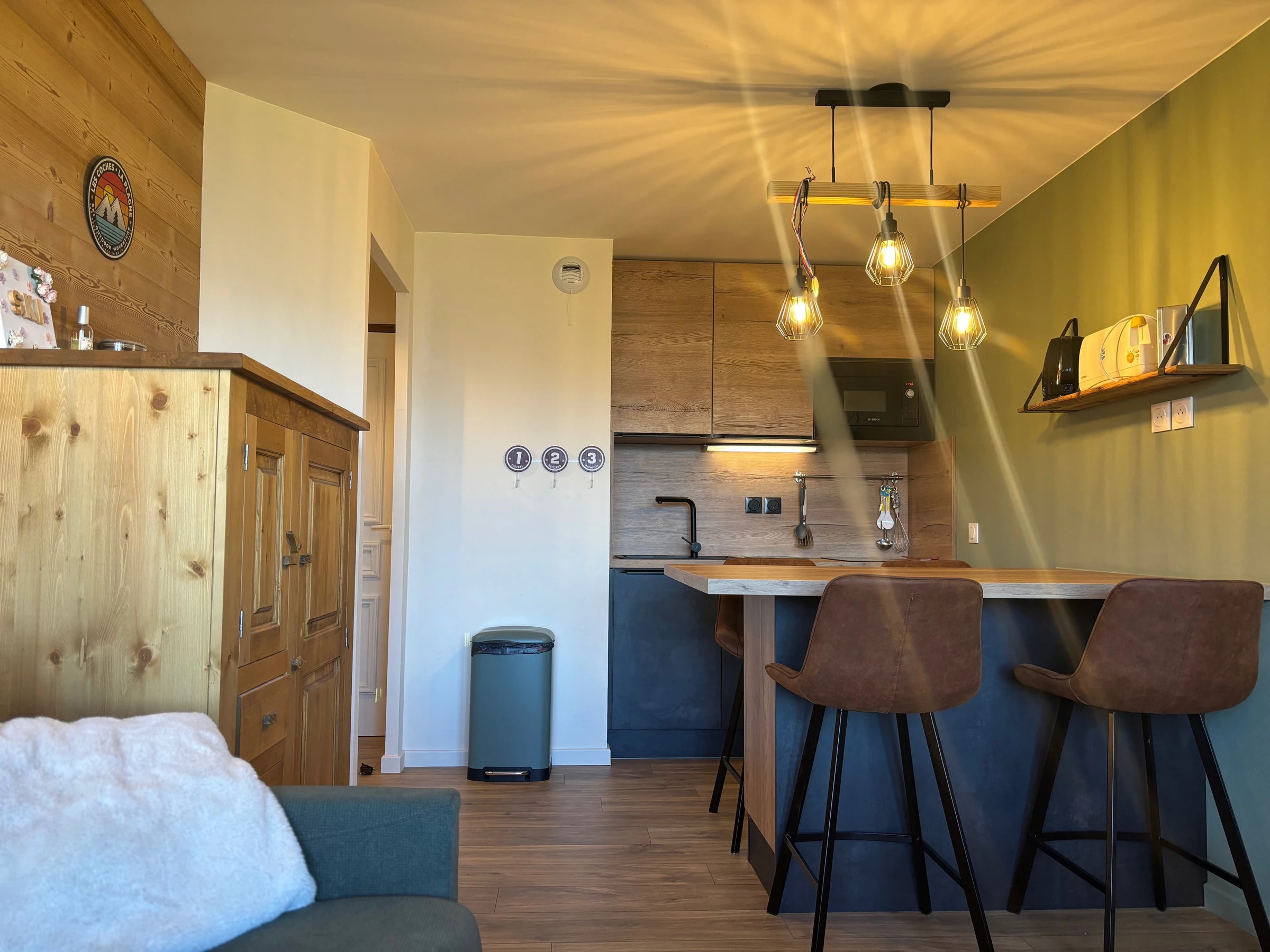 Komplett renovierte Zweizimmerwohnung (ca. 28 m²) für vier Personen, Nordwestlage mit Balkon und Blick auf das Tal und den Mont Blanc, im 3. Stock.