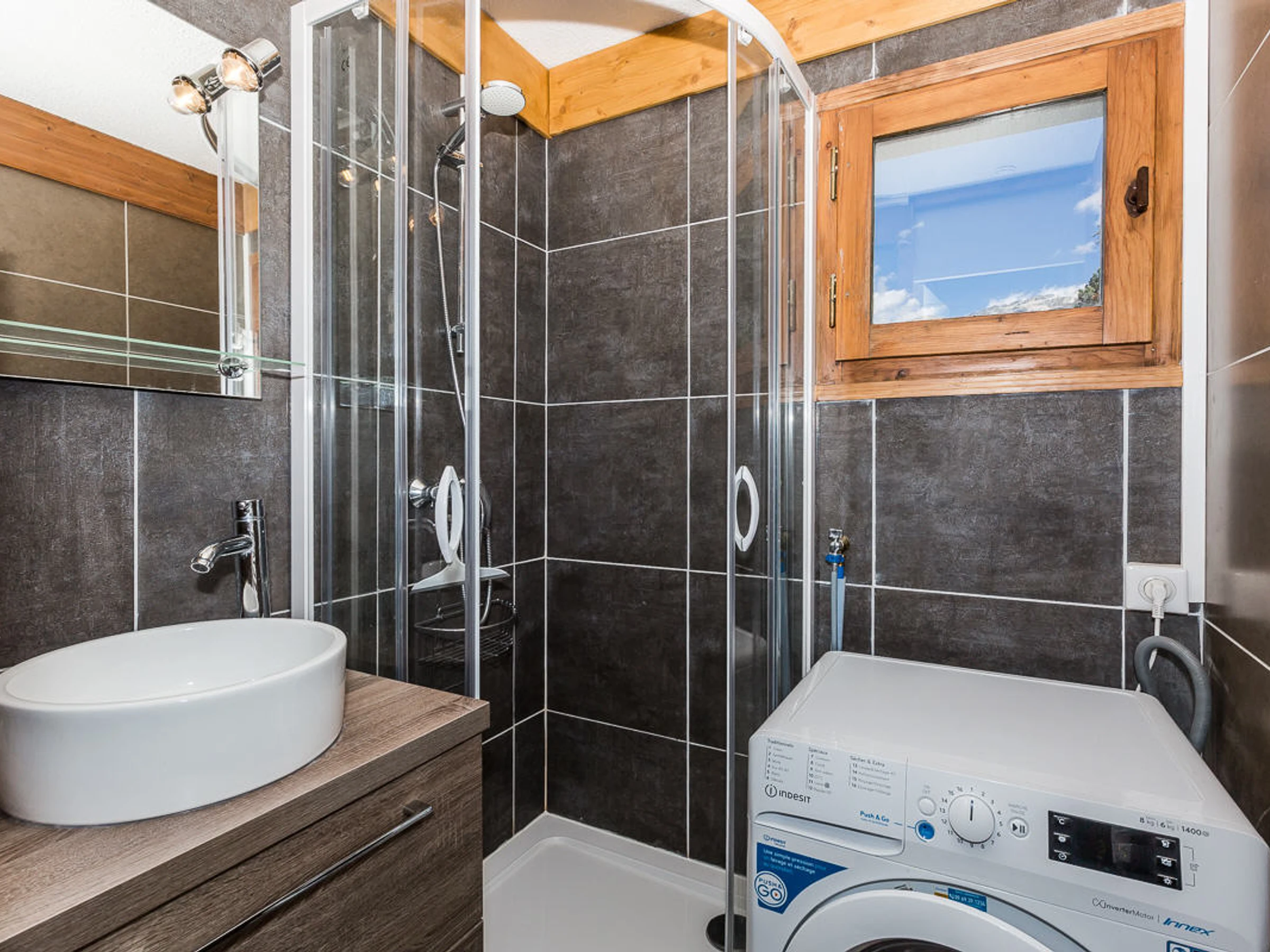 Badezimmer mit Dusche und Waschmaschine. Separates WC.