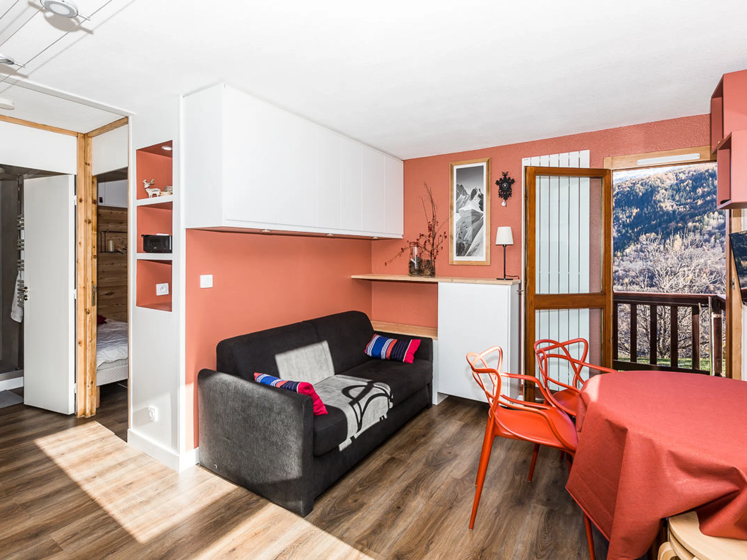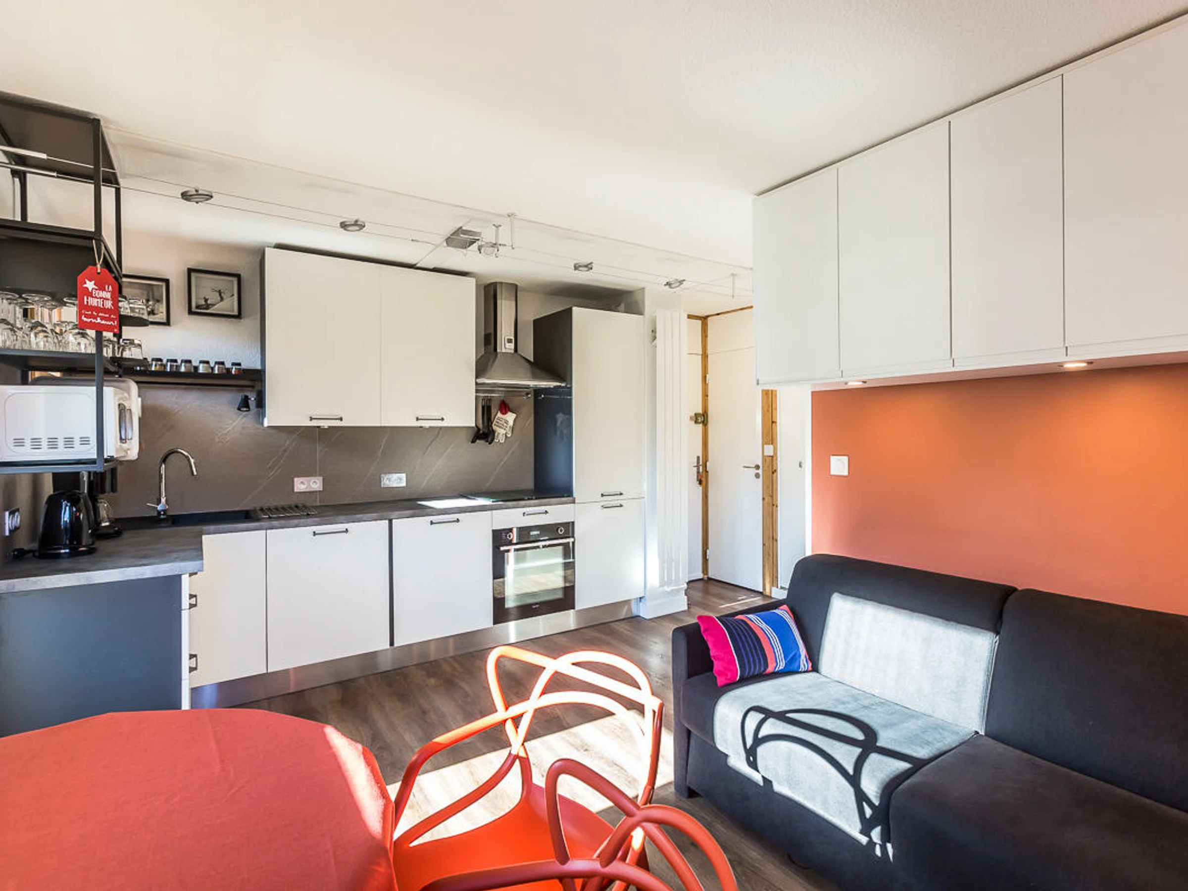 Diese komplett renovierte 2-Zimmer-Wohnung (ca. 27 m²) bietet Platz für 4 Personen und befindet sich an der Ost-Süd-Ecke des ersten Stocks. Sie verfügt über zwei Balkone.