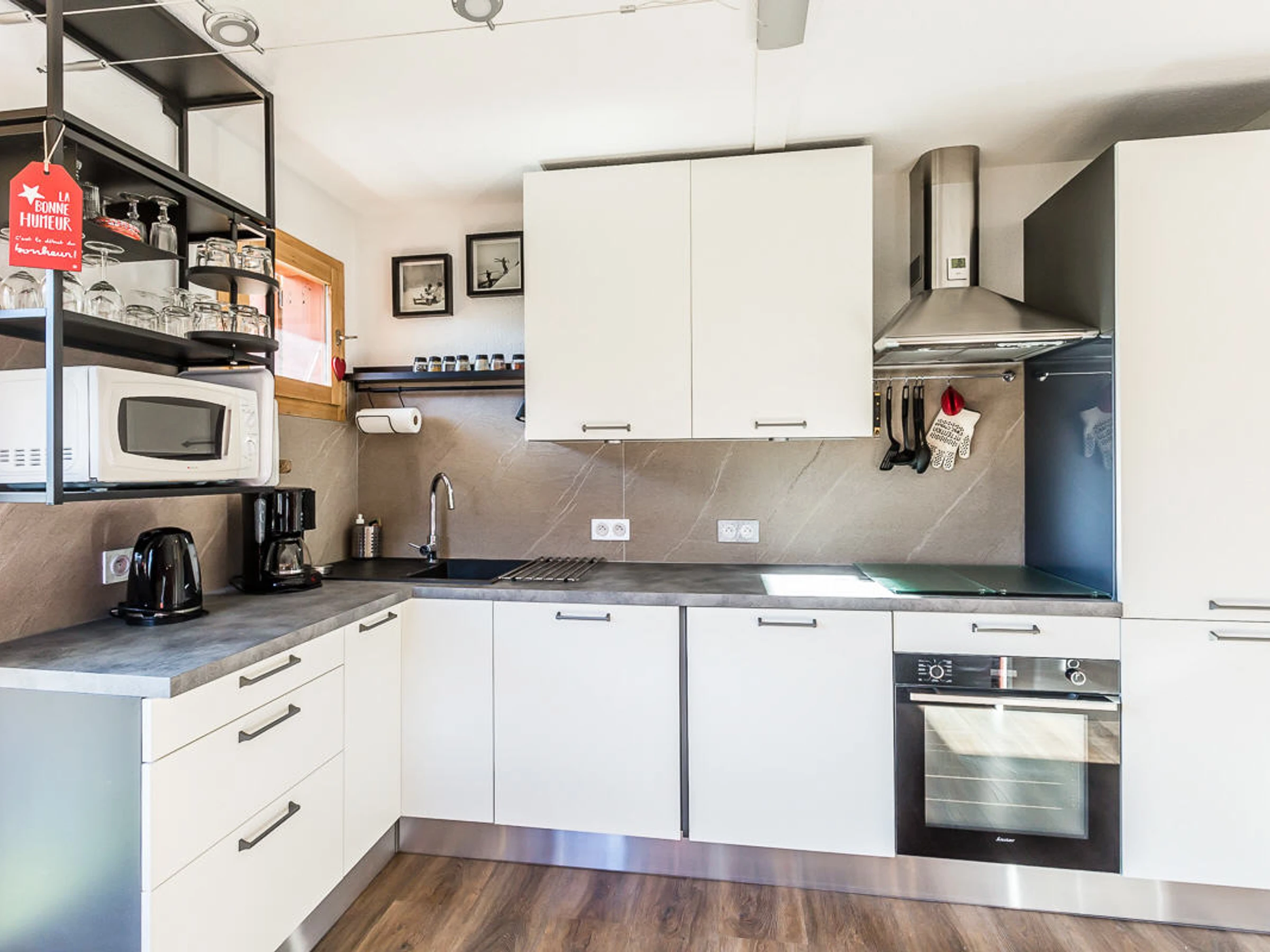 Küche: 3 Induktionskochfelder, großer Kühlschrank mit Gefrierfach, Geschirrspüler, Dunstabzugshaube, Backofen, Mikrowelle, Waschmaschine/Trockner, Kaffeemaschine und Wasserkocher.