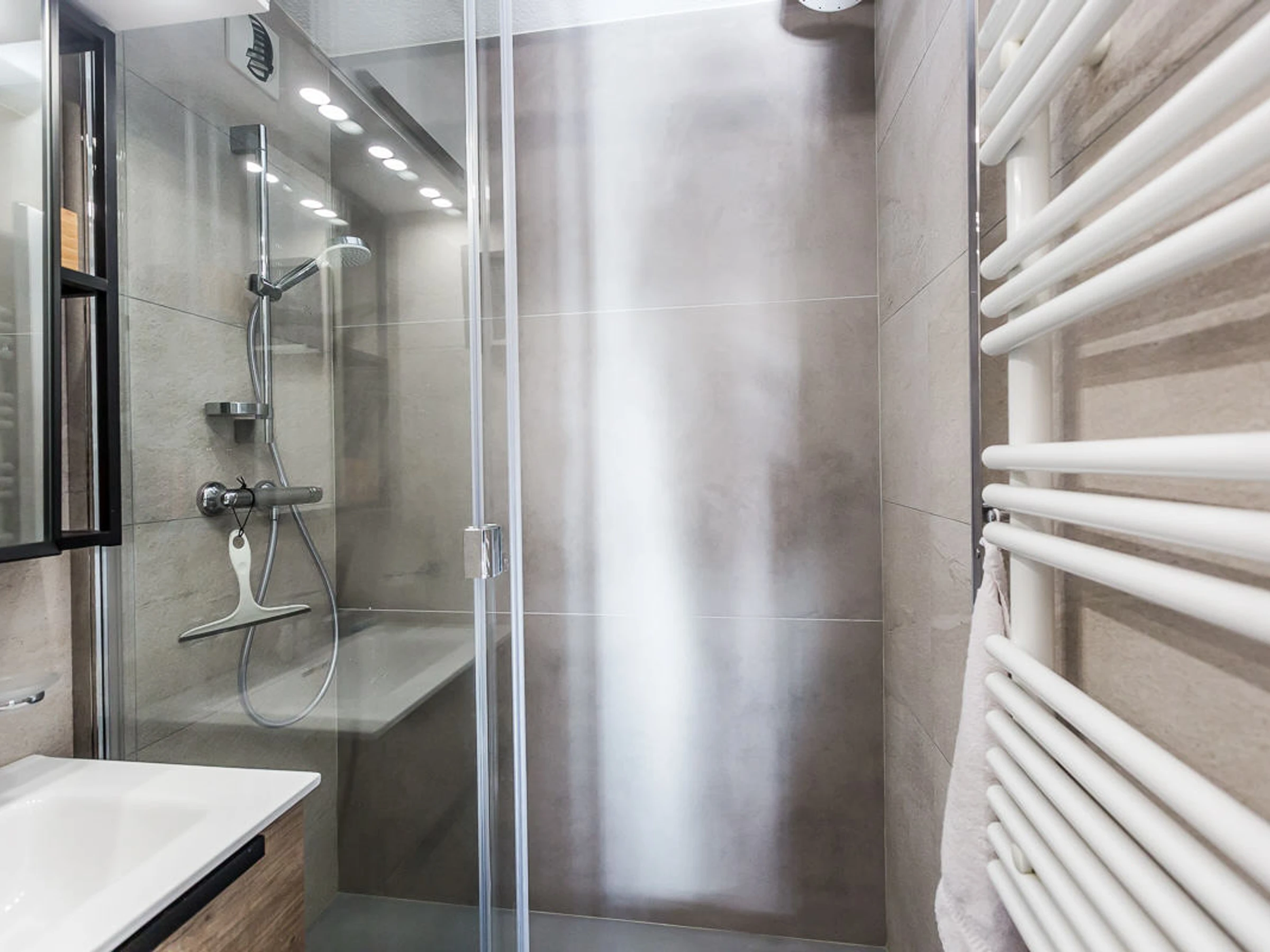Badezimmer mit ebenerdiger Dusche. Separates WC.