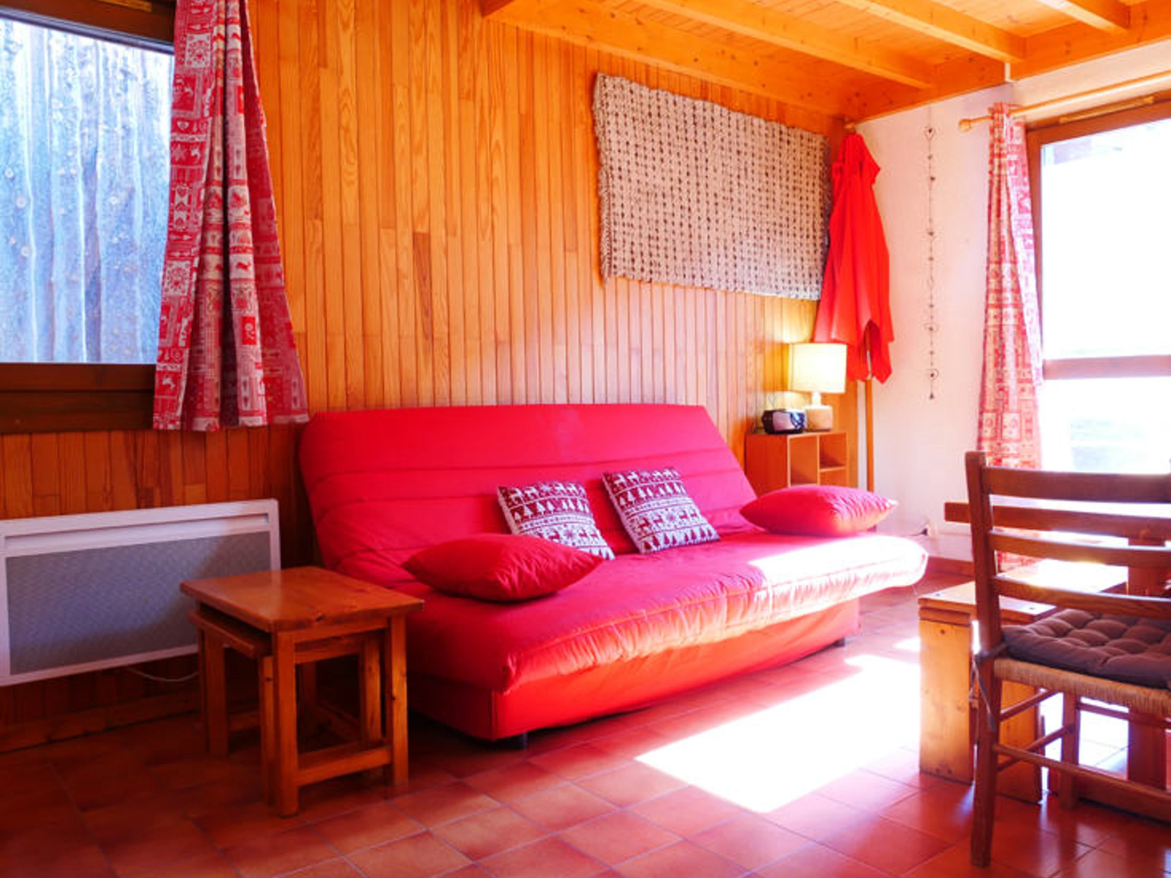 2 Zimmer + Zwischengeschoss (Höhe unter 1,80 m), auf der 1. Etage, ausgestattet für 7 Personen, ca. 43 m² + 9 m² unter 1,80 m, in gutem Zustand, nach Süden ausgerichtet, mit Blick auf die Hauptstraße von Montchavin und großer Terrasse.