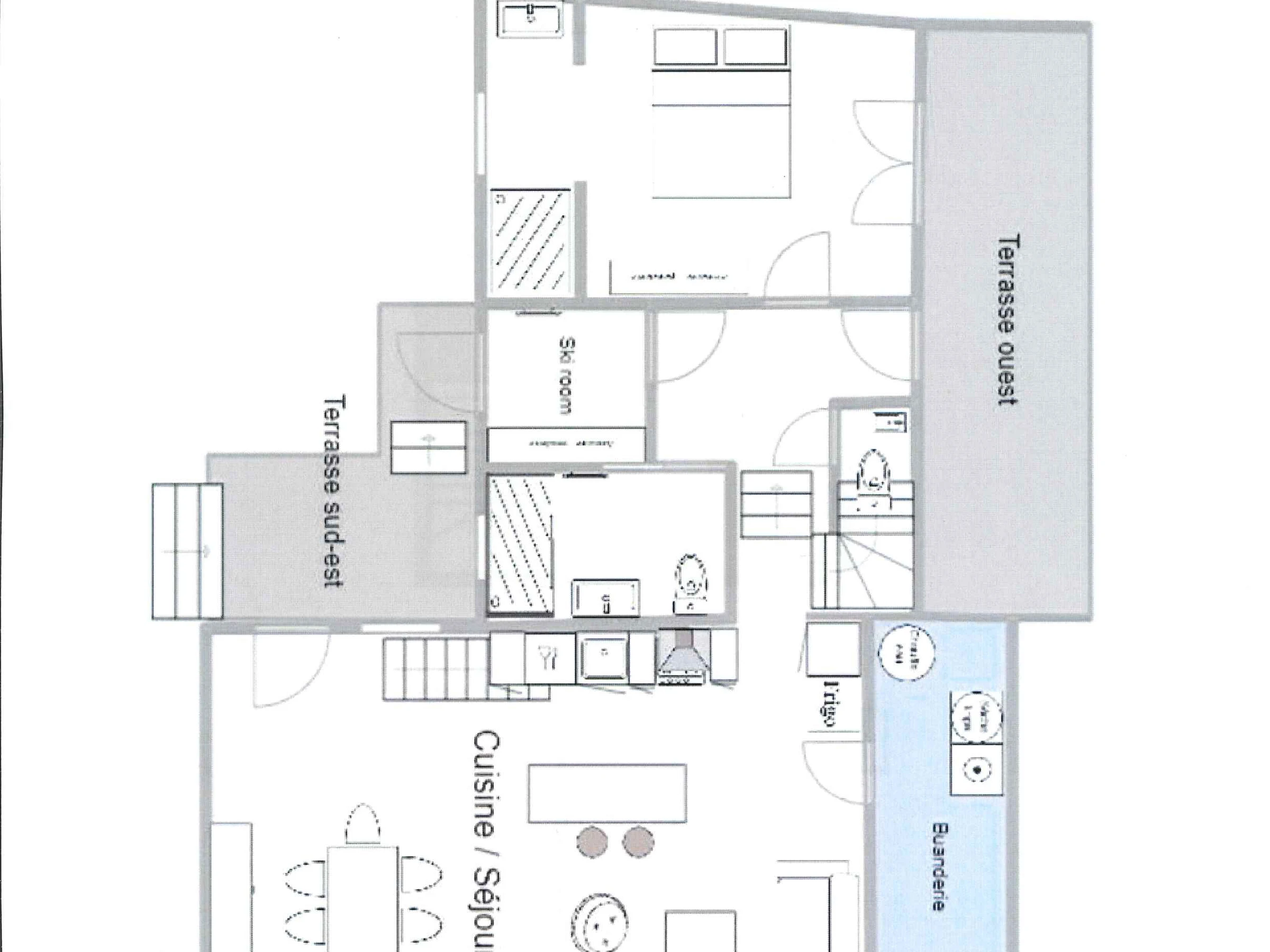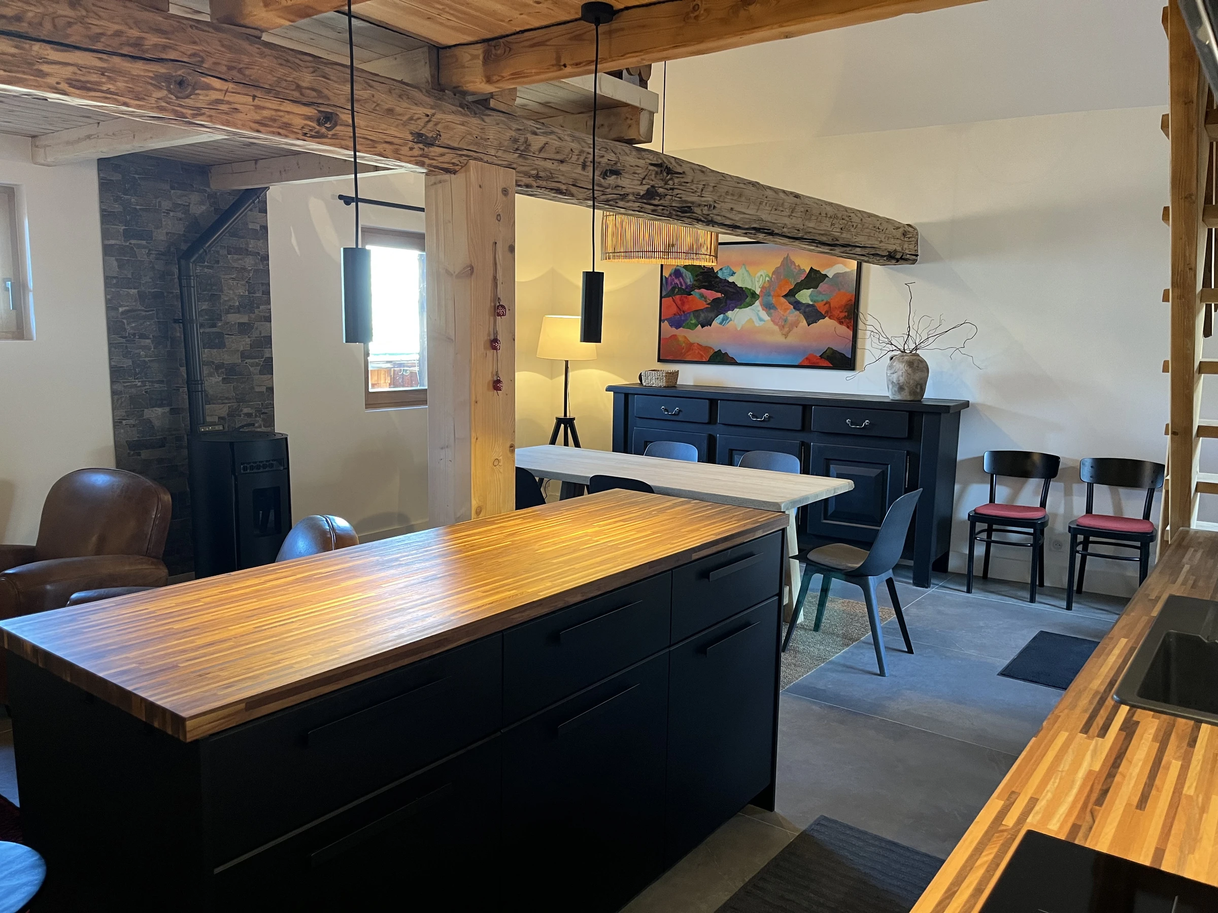 Die 85 m² große 4-Zimmer-Wohnung mit Zwischengeschoss bietet Platz für 8 Personen. Das Wohnzimmer (40 m²) ist nach Norden/Süden ausgerichtet und verfügt über eine offene Küche, ein Esszimmer und ein Wohnzimmer mit Pelletofen. Vom Eingang aus gelangt man auf eine Südterrasse mit Blick auf die Dorfstraßen.