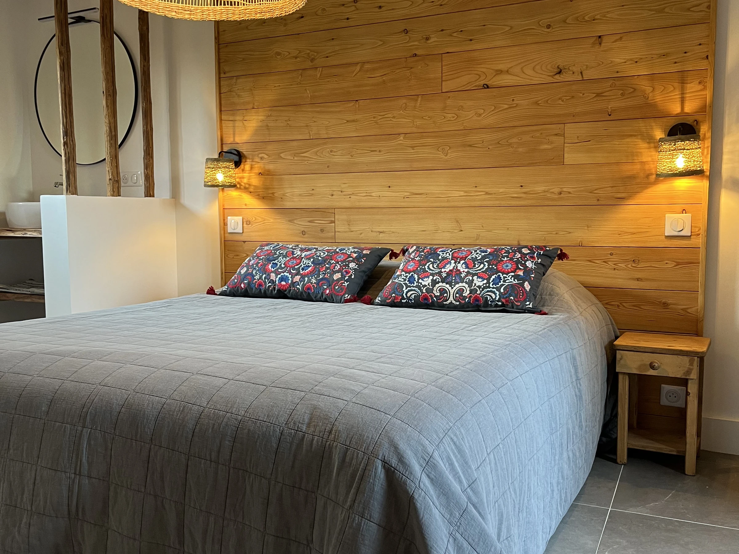 *Schlafzimmer 1: 1 Doppelbett für 2 Personen (160 x 200 cm), TV, Waschbecken, Dusche und Zugang zur Westterrasse.