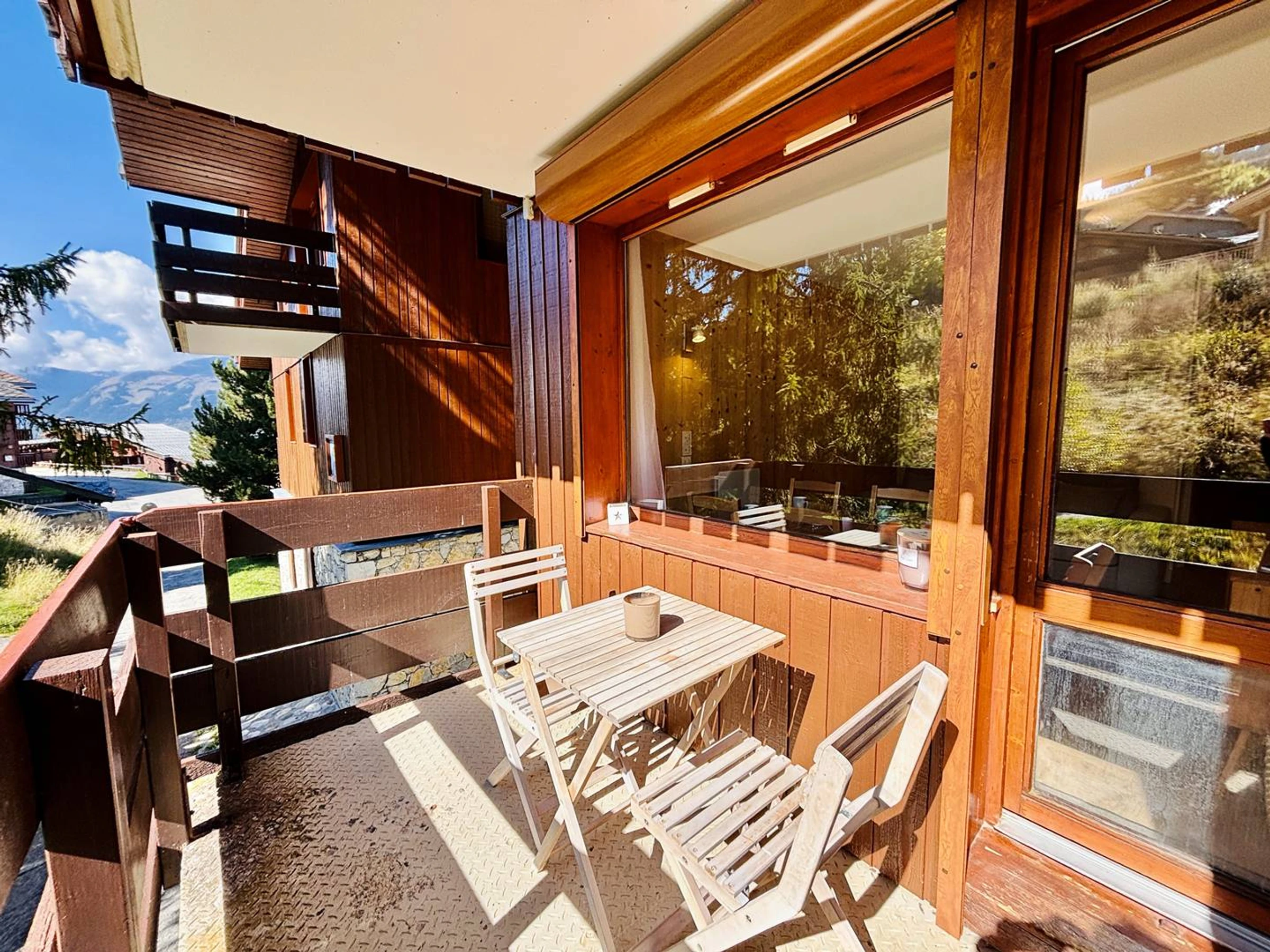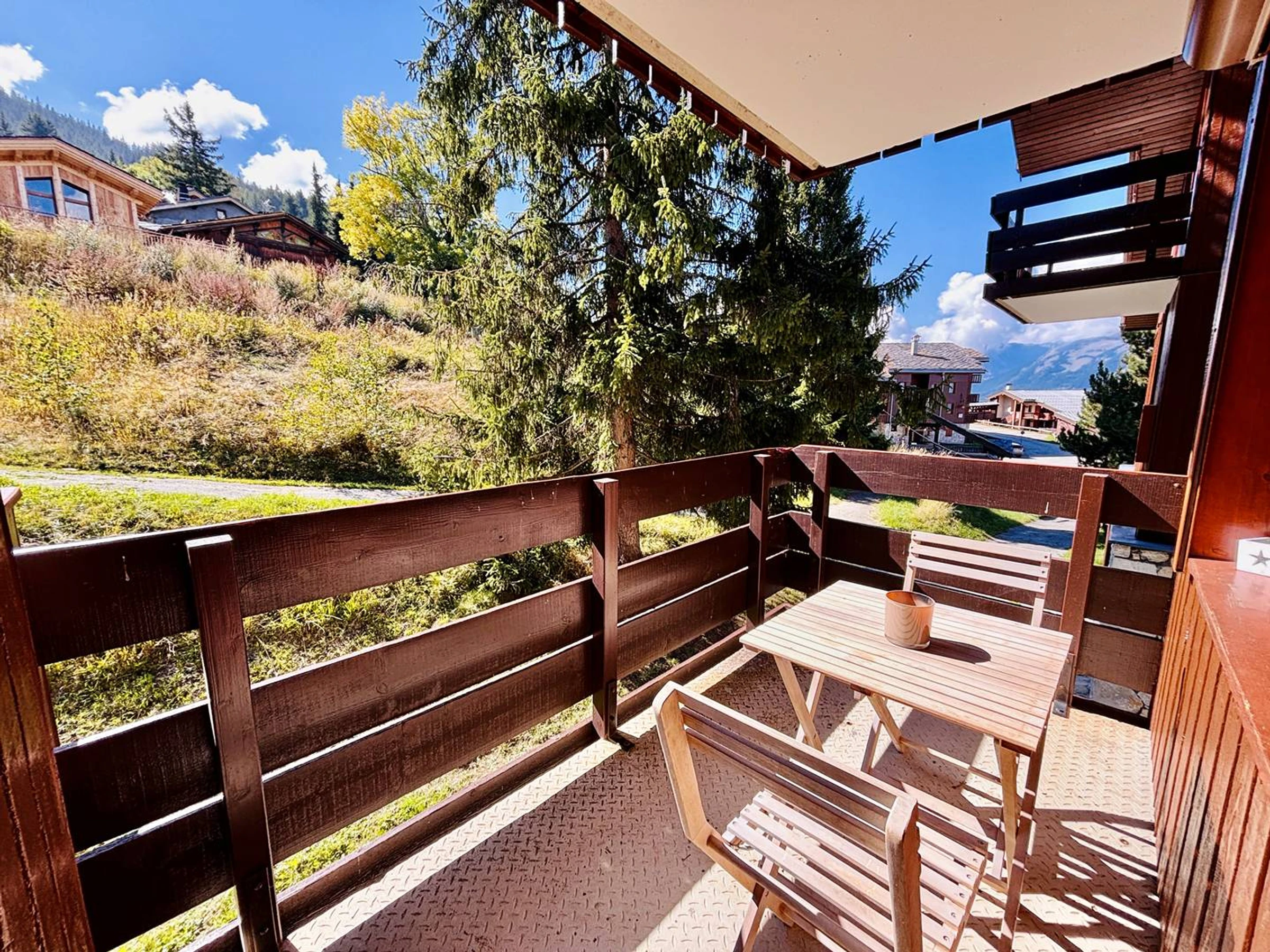 Ein nach Süden ausgerichteter Balkon mit Blick auf Chalets und Tannen. Ein Skiraum ist in der Residenz vorhanden.