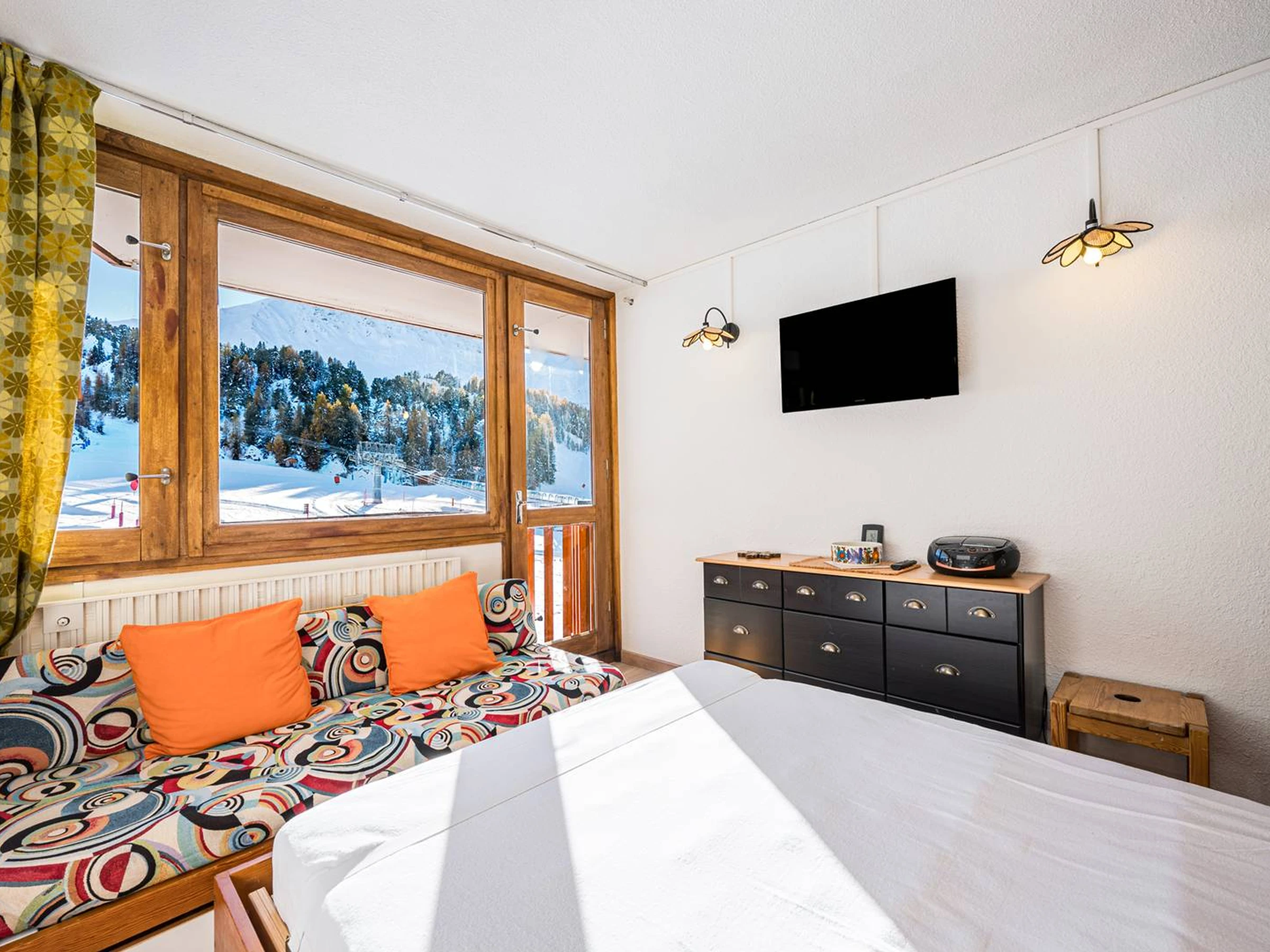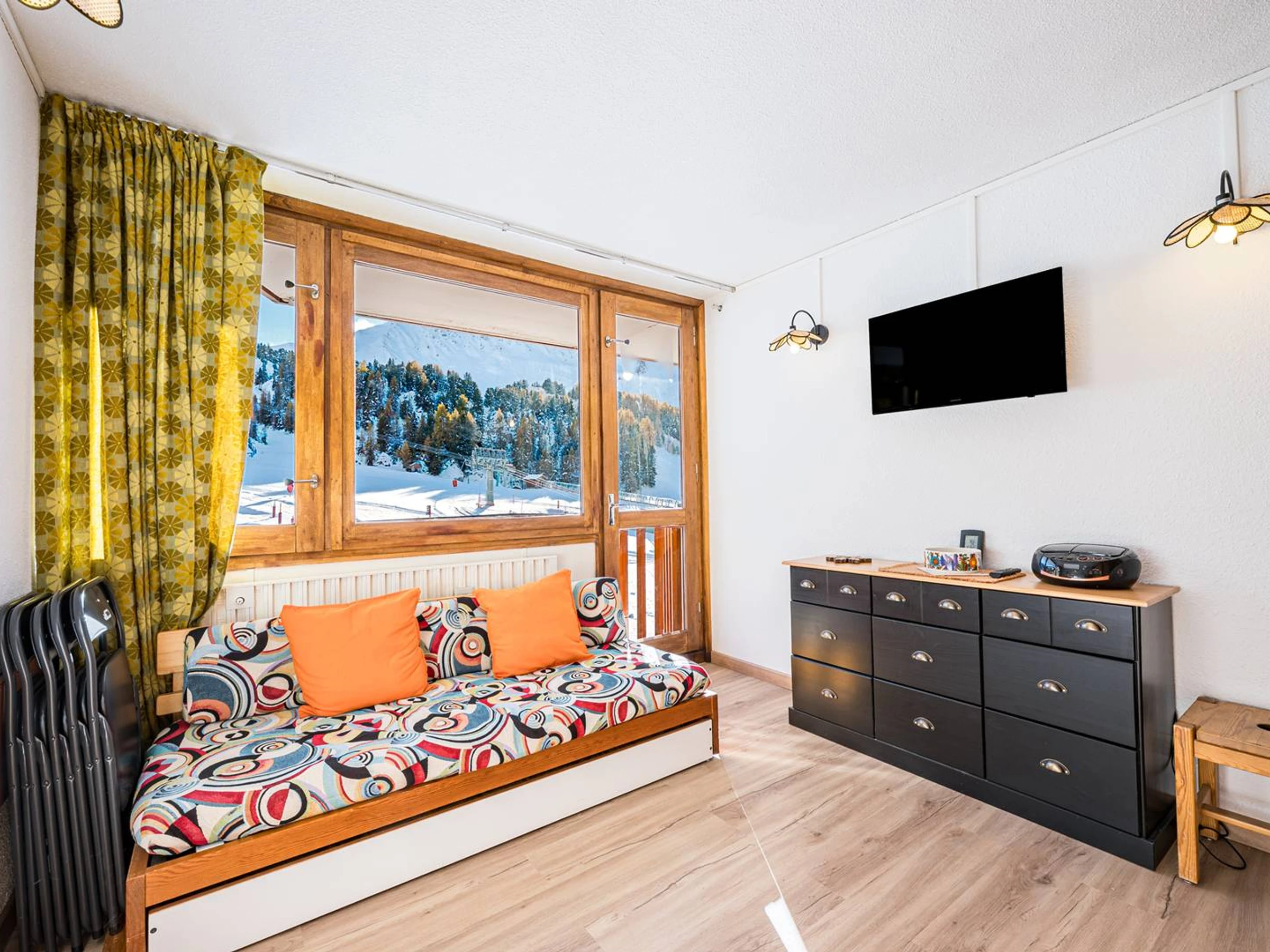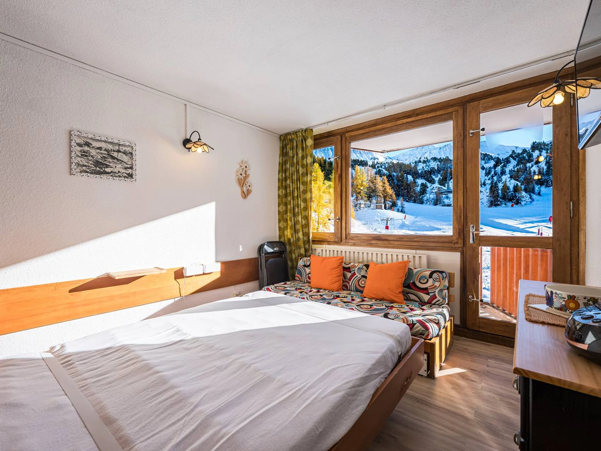 PLAGNE CENTRE – Le France Residence. Charmantes, renoviertes Studio-Apartment mit Südbalkon, direkt über der Boulevard-Piste gelegen. Das Apartment liegt direkt an den Skipisten und bietet über die Innengalerie direkten Zugang zu den Geschäften.