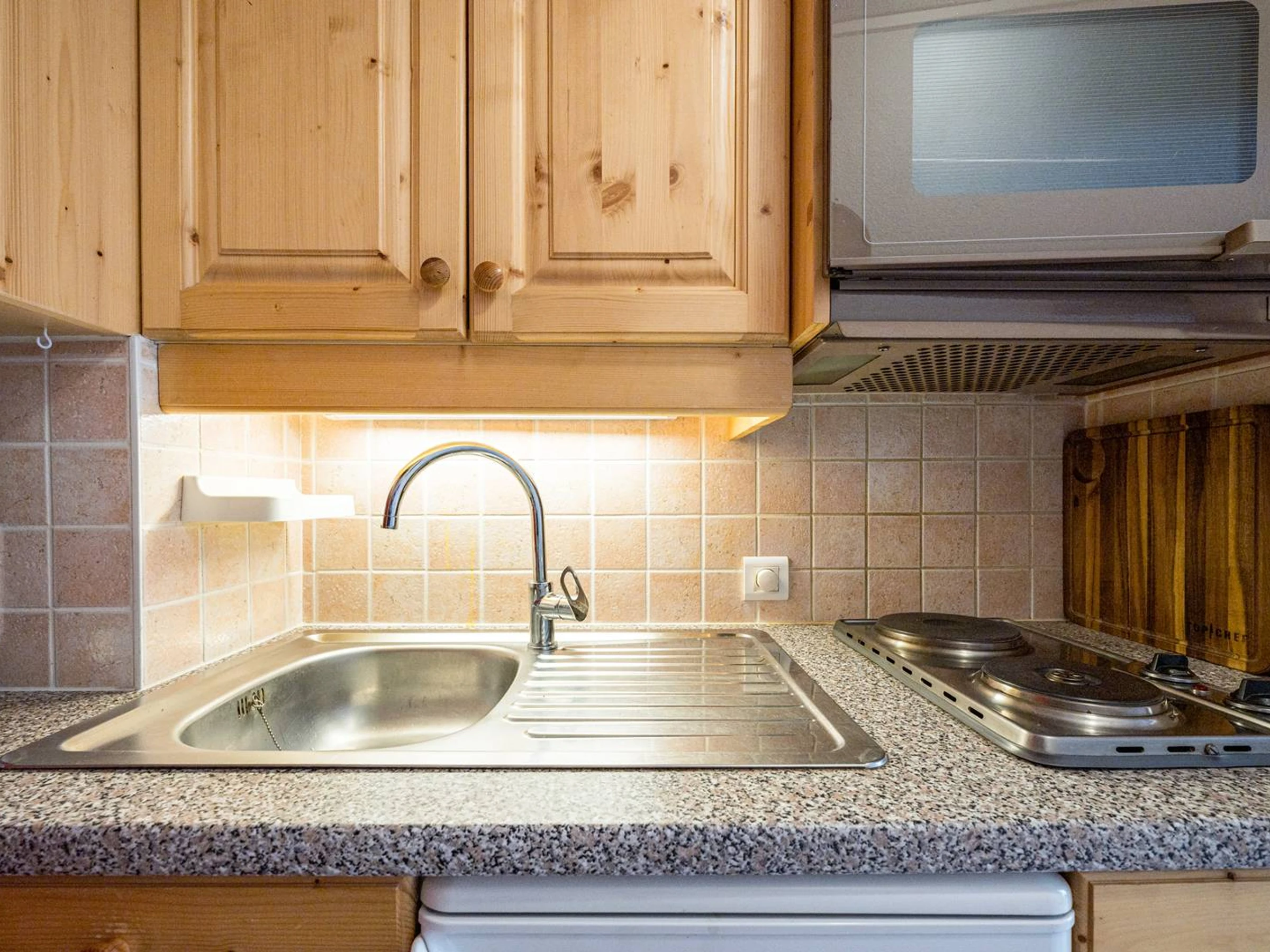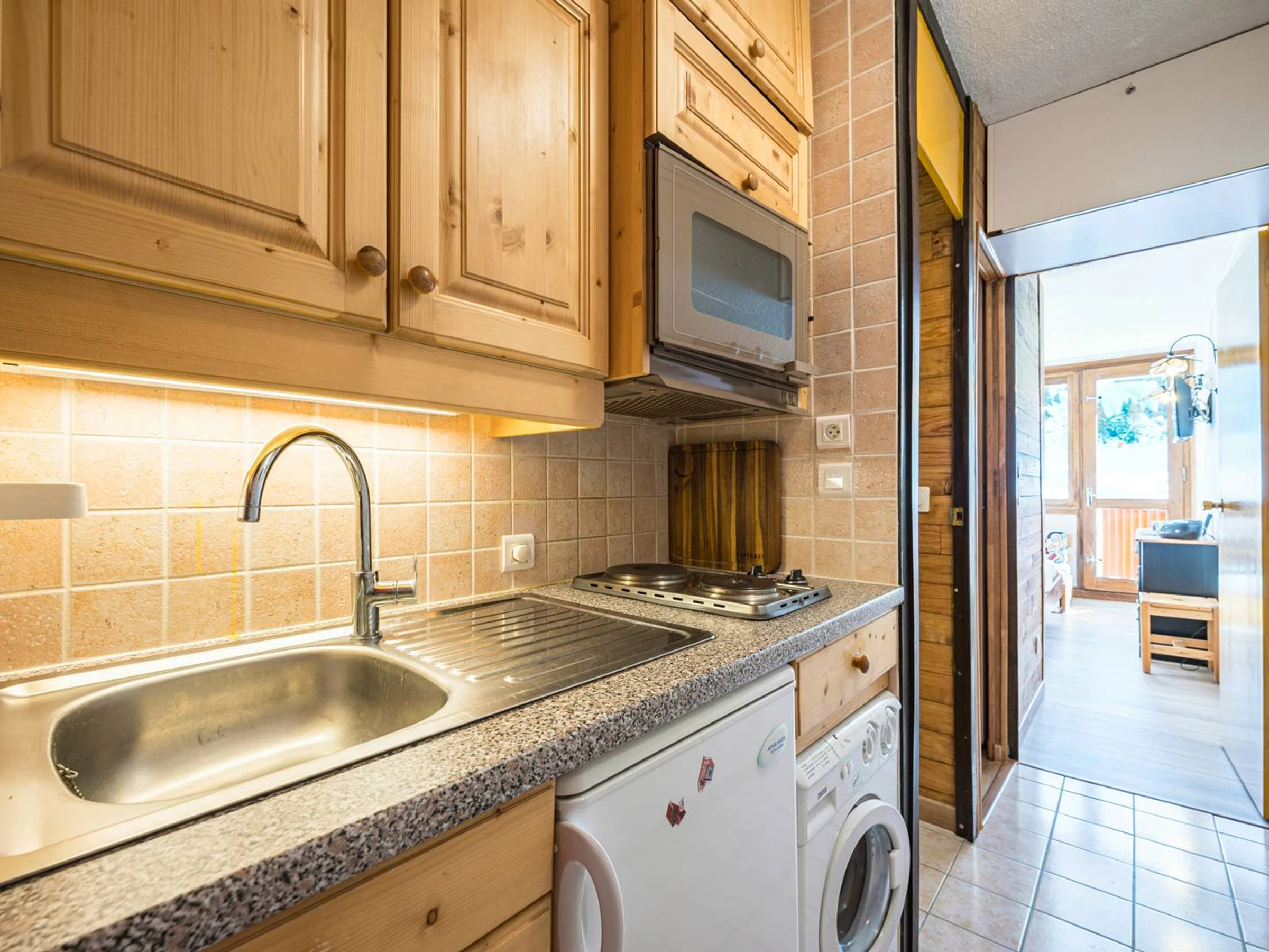 – Der Eingangsbereich verfügt über eine voll ausgestattete offene Küche mit Kühl-Gefrierkombination, Senseo-Kaffeemaschine, Waschmaschine, Backofen und vielem mehr.