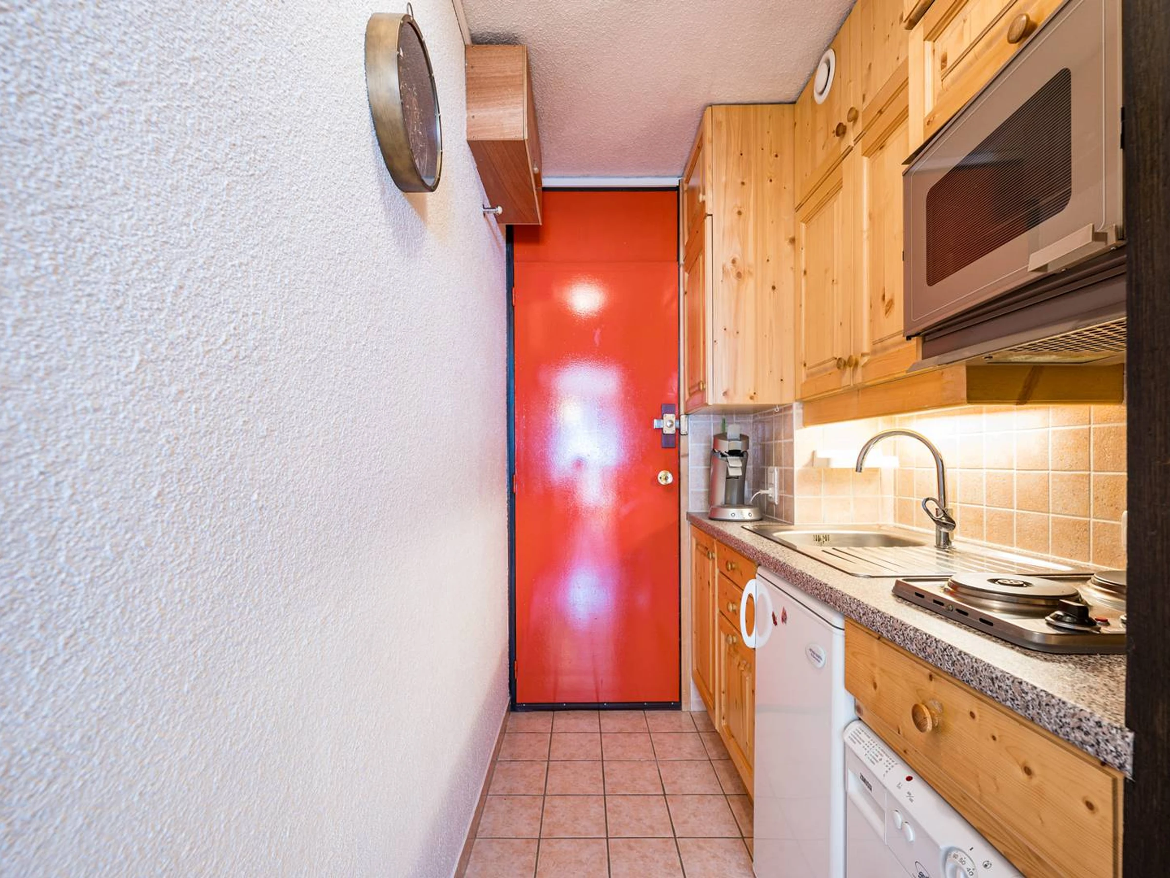 Angenehmes, 23 m² großes Studio-Apartment für 4 Personen mit viel Stauraum im 5. Stock mit Aufzug. Das Apartment erstreckt sich über 9 Etagen und ist über zwei Aufzüge erreichbar.