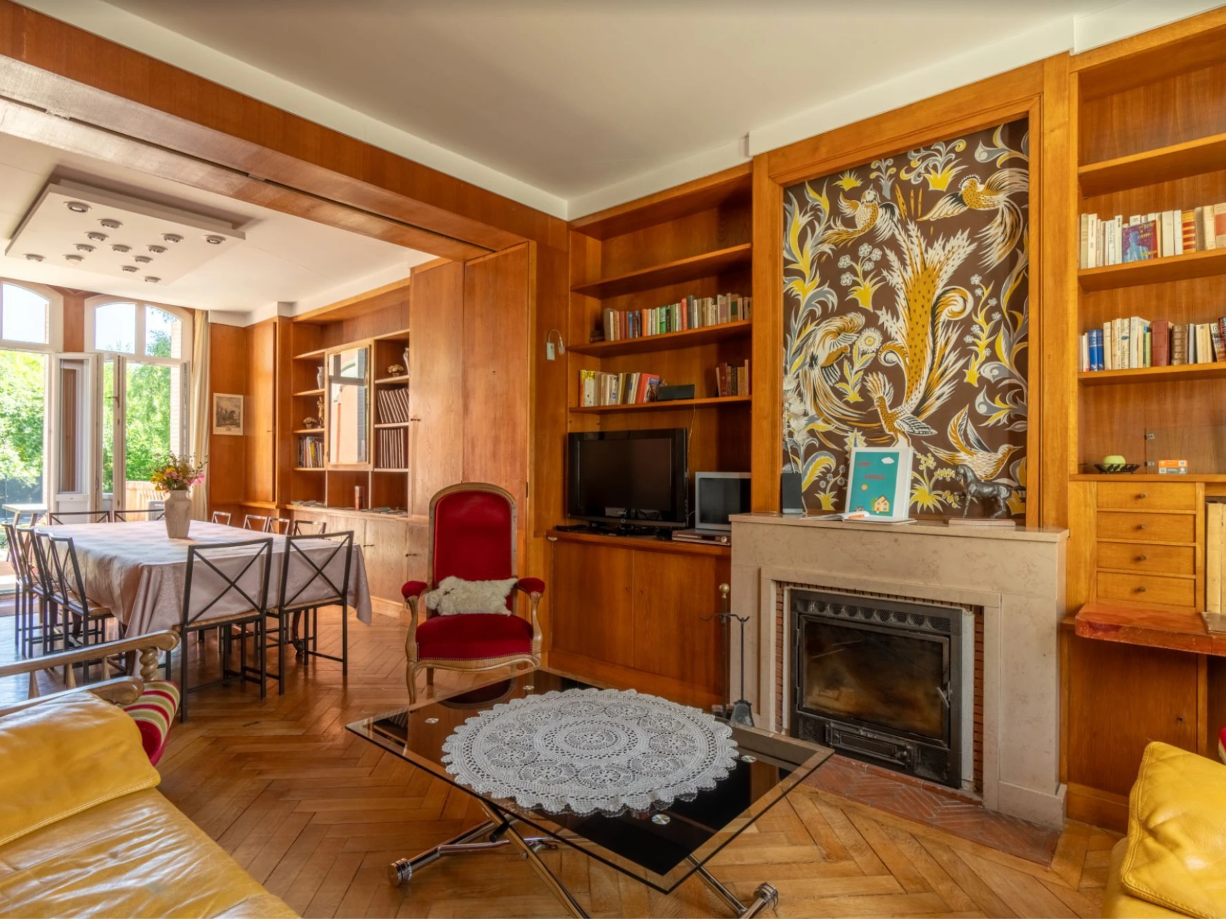 Wunderschönes Wohnzimmer im Art-Déco-Stil, komplett aus Holz, mit Kamin/Einsatz und zwei Bänken.