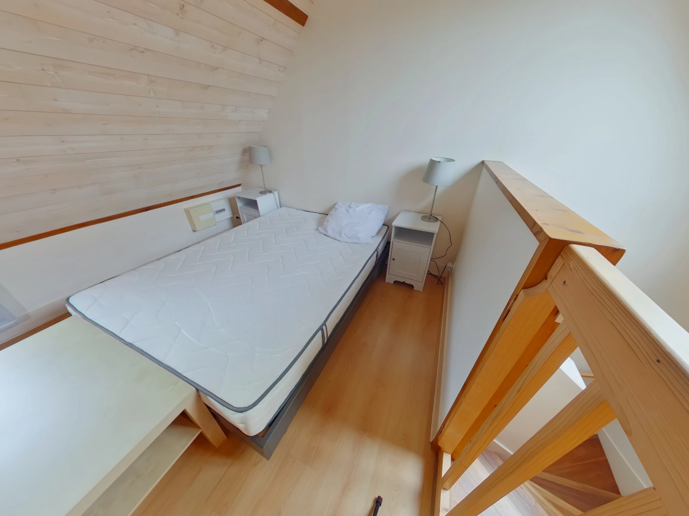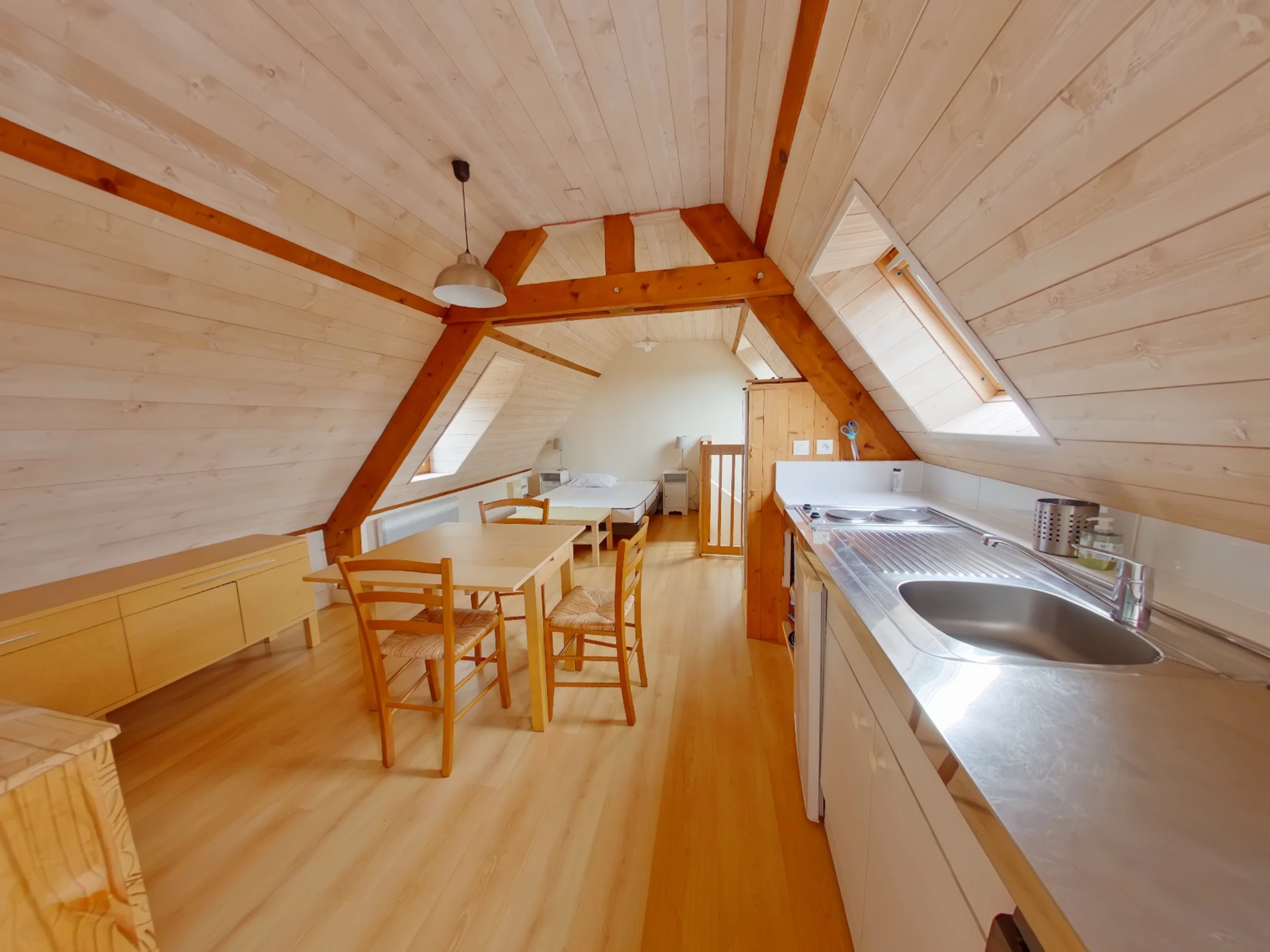 Charmantes Dachgeschoss-Studio im 3. Stock eines Gebäudes ohne Aufzug. Es besteht aus einem Wohnbereich (Doppelbett 140/190 cm, Geschirrspüler, 2-Platten-Elektroherd, Mikrowelle) und einem Duschbad mit WC.
