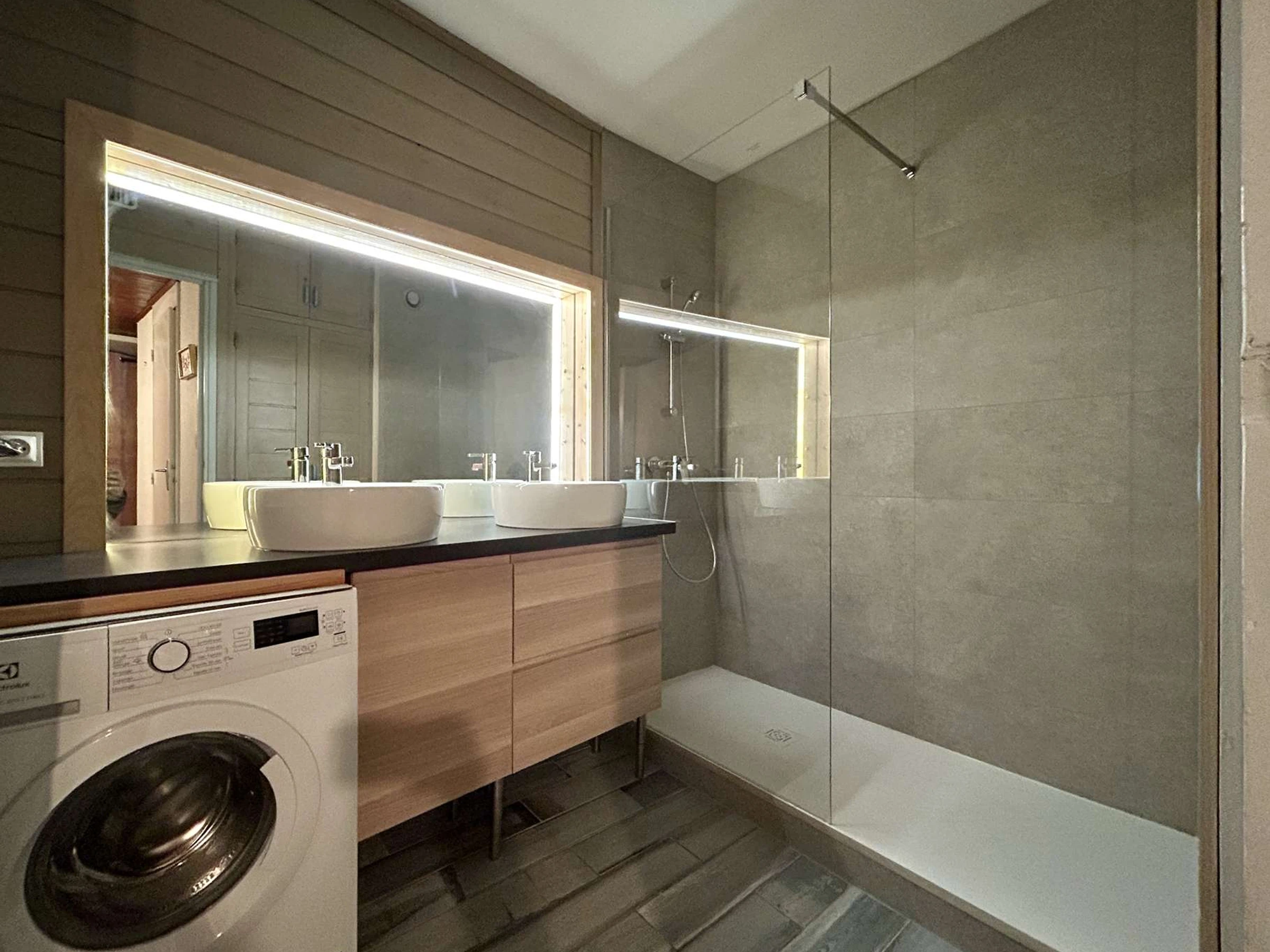 Dieses Apartment für 6 Personen bietet ein Schlafzimmer mit einem 140 cm breiten Doppelbett, eine Schlafnische mit Etagenbetten, ein Wohnzimmer mit zwei Einzelbetten und einem Fernseher, eine voll ausgestattete separate Küche (Herd, Geschirrspüler, Mikrowelle), ein Badezimmer mit ebenerdiger Dusche und Waschmaschine sowie ein separates WC.