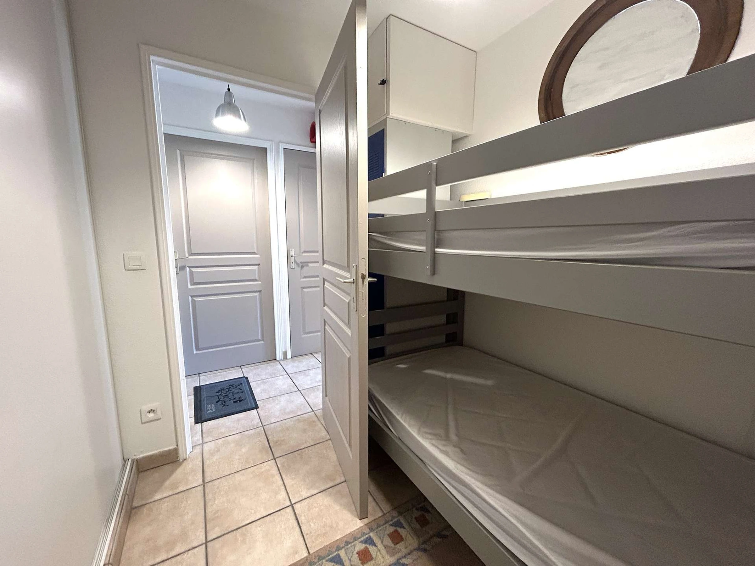 Diese Ferienwohnung verfügt über ein Schlafzimmer mit einem 160 cm breiten Doppelbett, einen Schlafbereich mit 90 cm breiten Etagenbetten, ein Wohnzimmer mit einem 140 cm breiten Schlafsofa und einem Fernseher, die Küche ist ausgestattet. Badezimmer und Toilette sind getrennt.