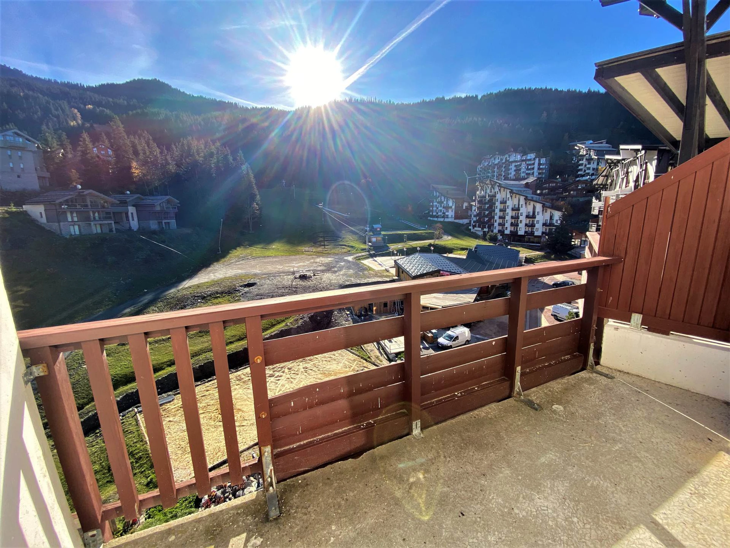 Südbalkon mit Blick auf die Skipiste und den Wald.