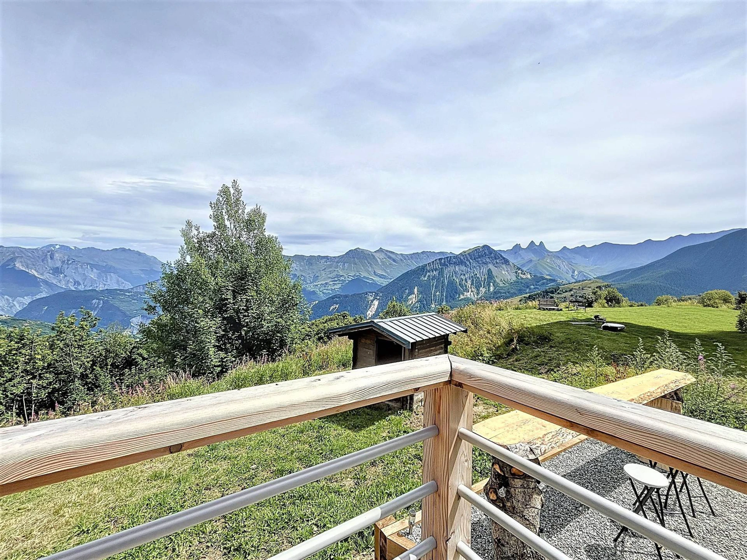 Zugang zu einer großen Terrasse mit Holztischen und einem Balkon mit außergewöhnlichem Panoramablick auf die Aiguilles d'Arves