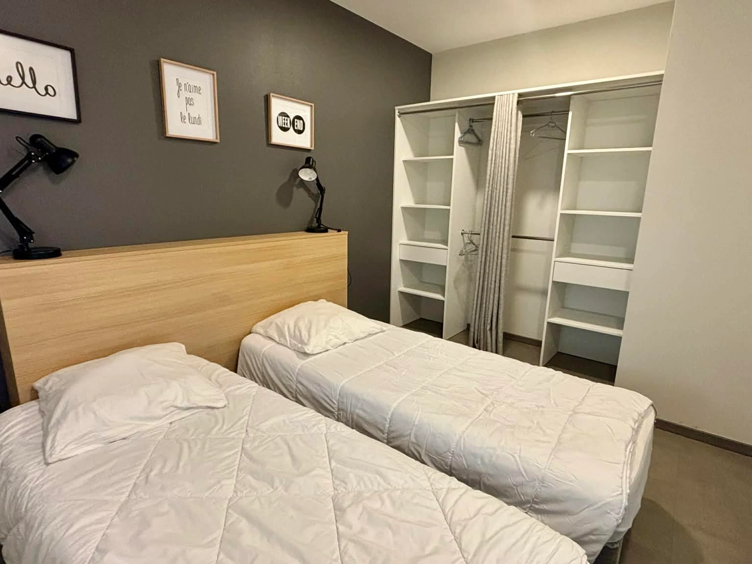 Ein Schlafzimmer mit zwei Einzelbetten (80 cm), die zu einem Queensize-Bett (160 cm) zusammengestellt werden können, und Ankleidezimmer,